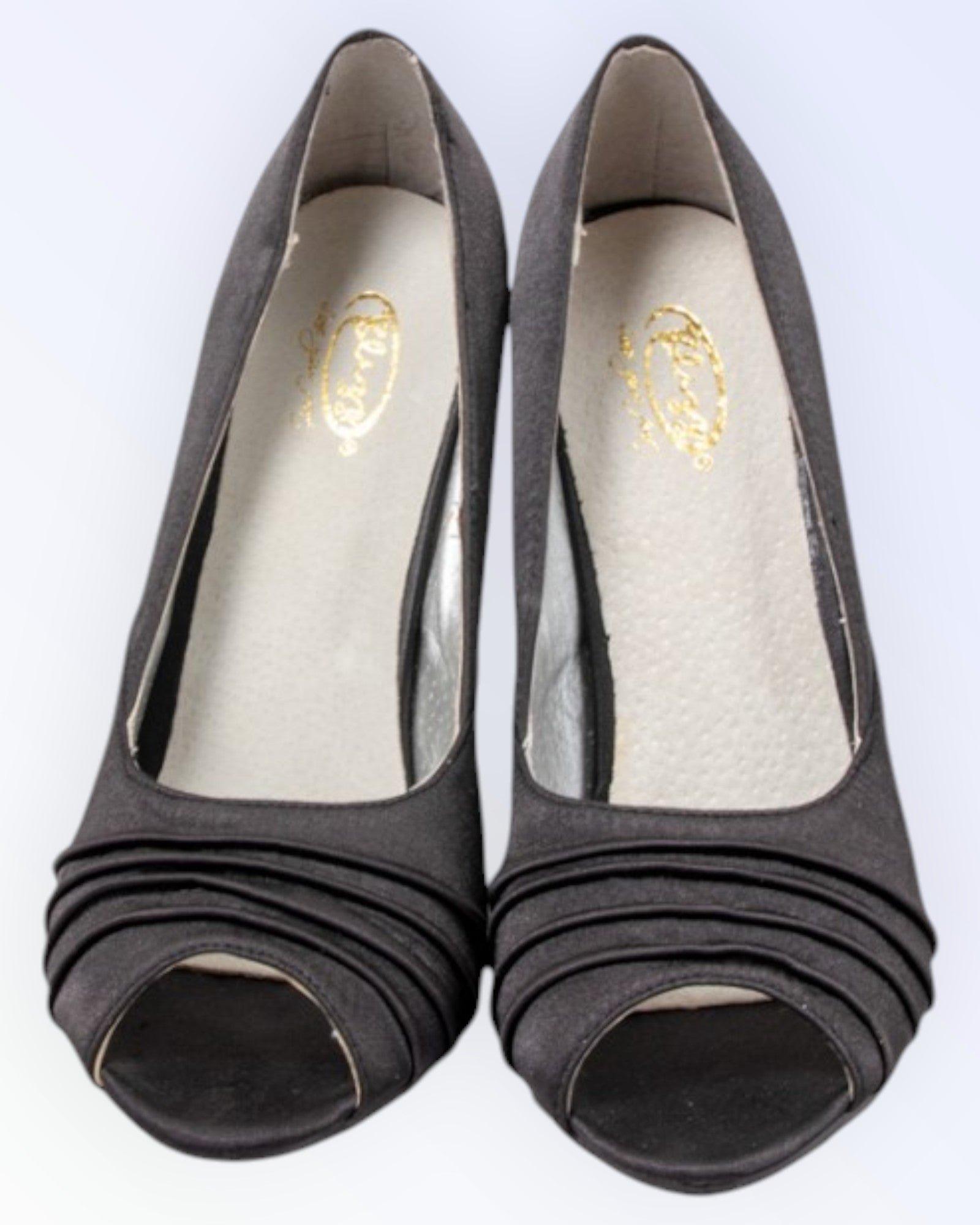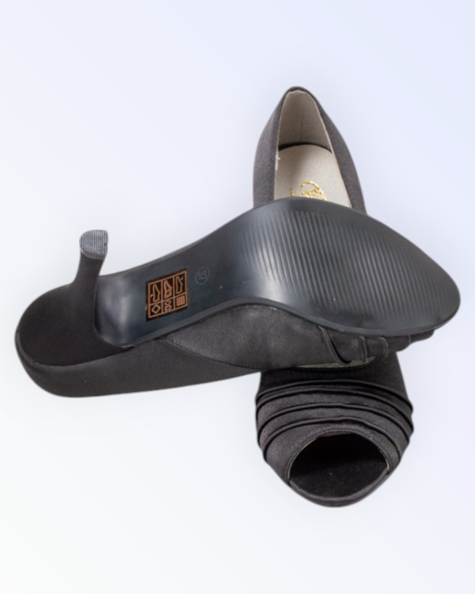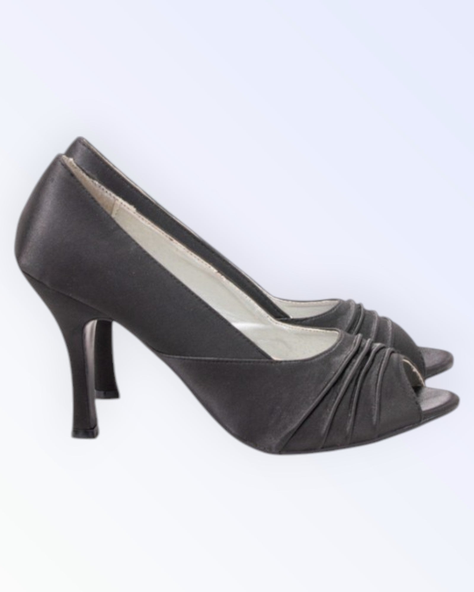 Black satin open-toe shoes. Lightweight formal shoes.