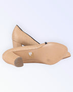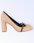 Closed textile shoes with a round toe. Decorated with a brown faux leather strap with a buckle across the foot.