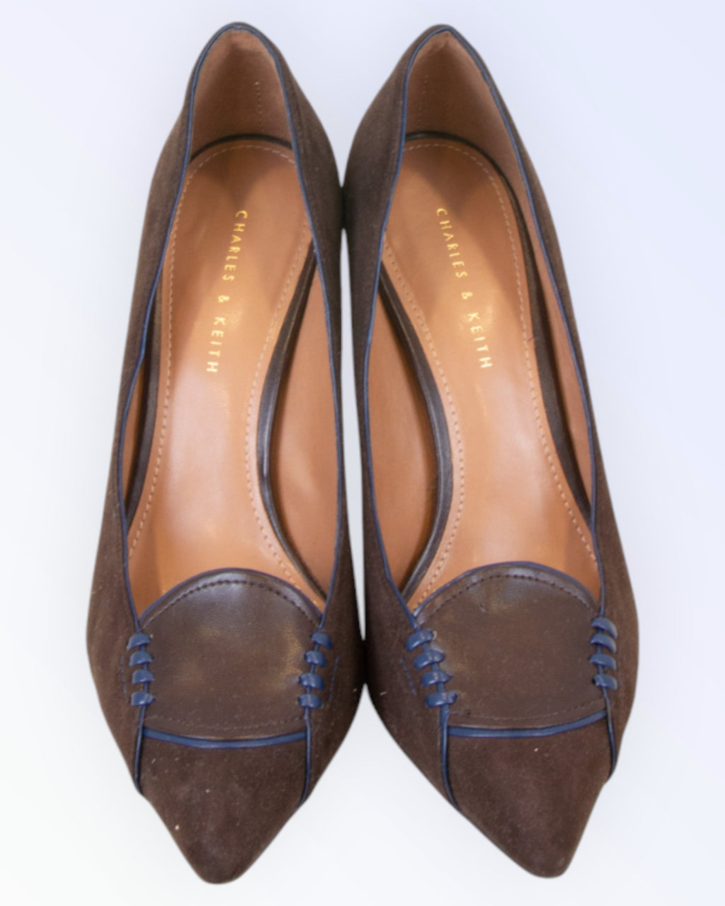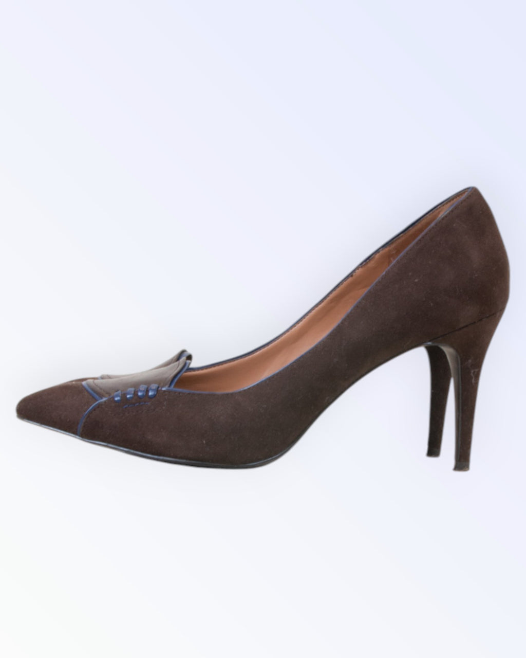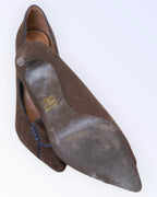 Brown suede closed-toe shoes. Decorated with blue embroidery.