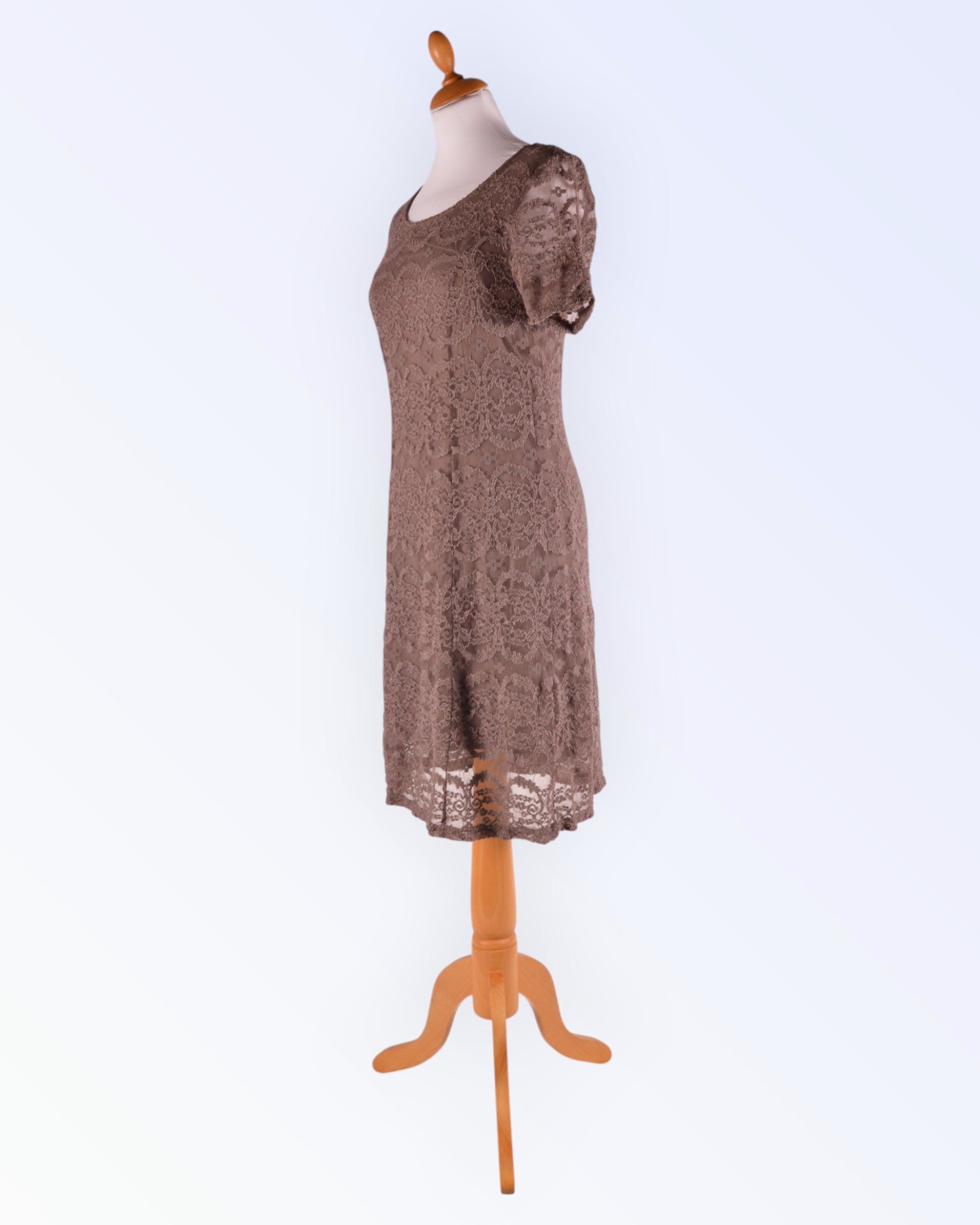 Light brown short-sleeved party dress made of stretch lace with a jersey lining.