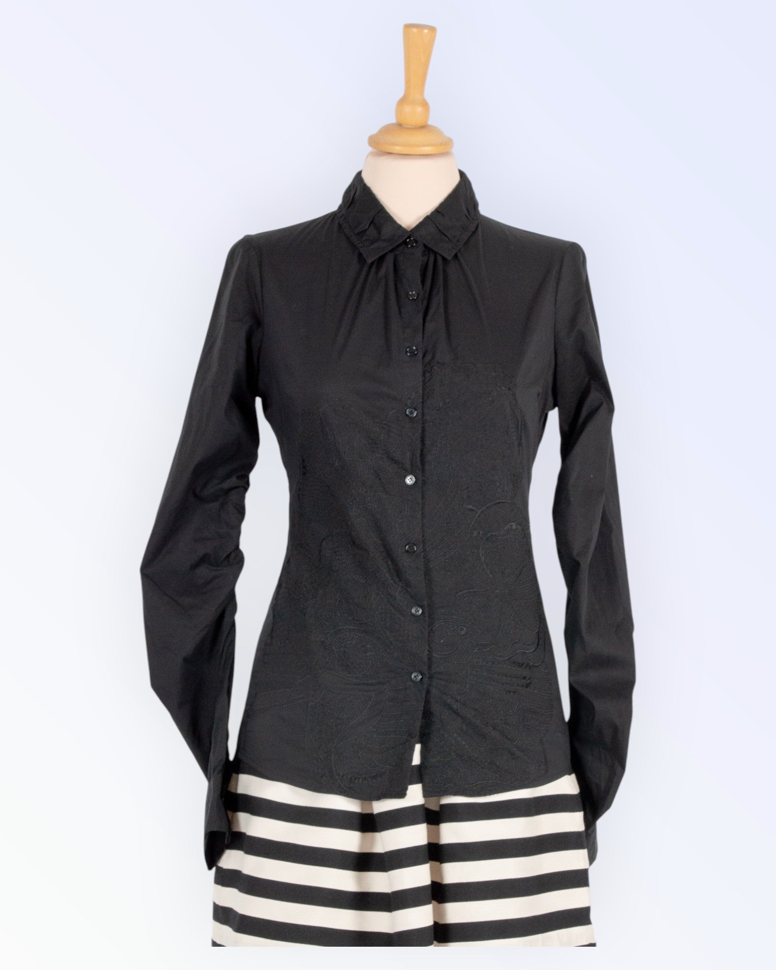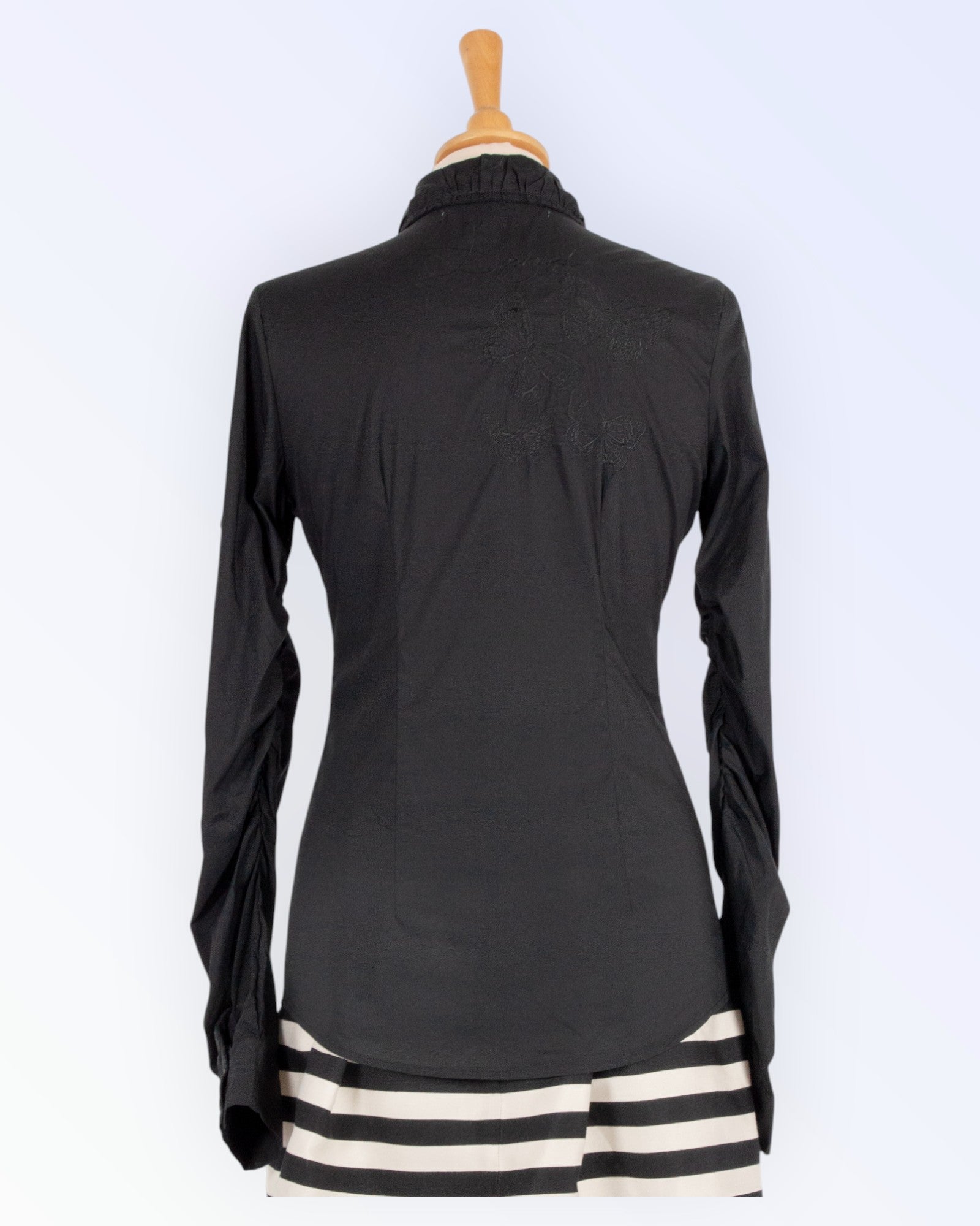 Black shirt blouse covered with embroidery. There are ruffles on the front of the blouse under the collar and in the underarm seam of the sleeves, which add a special touch to the product.