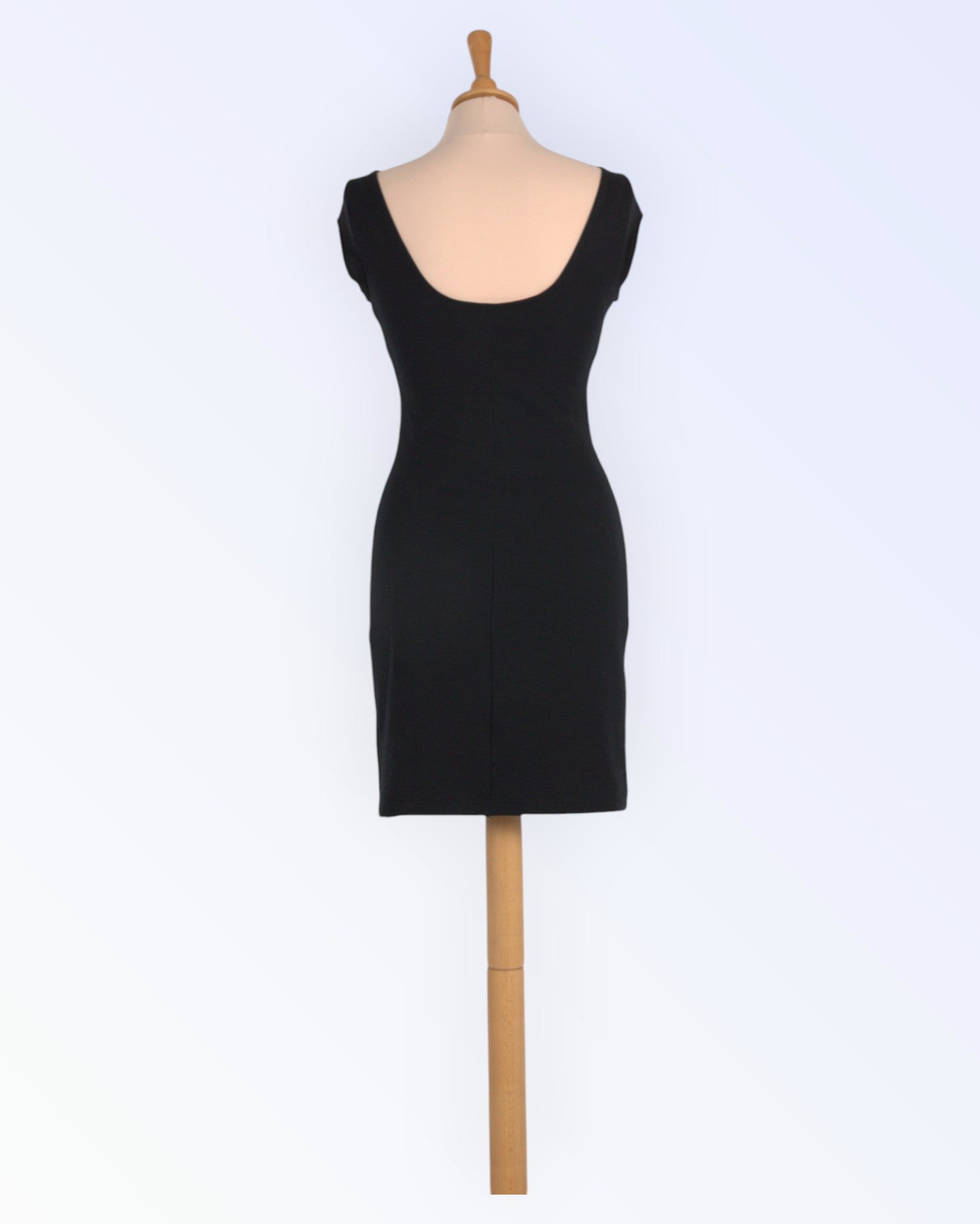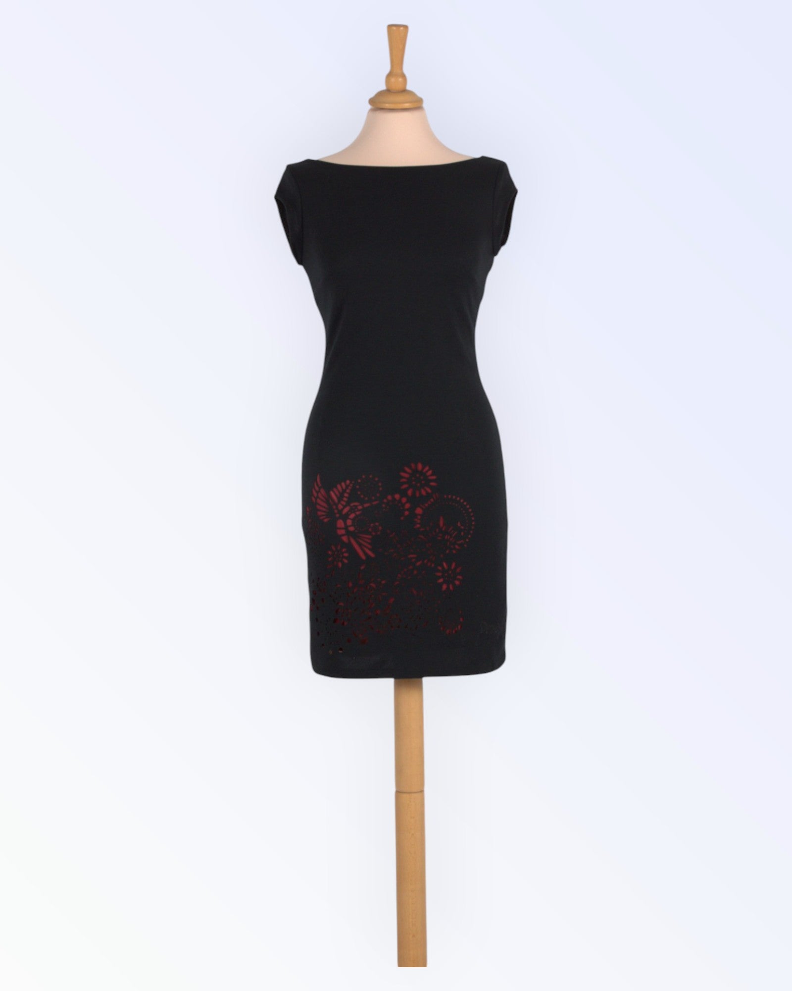 Little black knit dress. Laser cut lace detail on the bottom right side, revealing the darker red lining. Deep U-shaped back, small sleeves. Zipper on the left side.