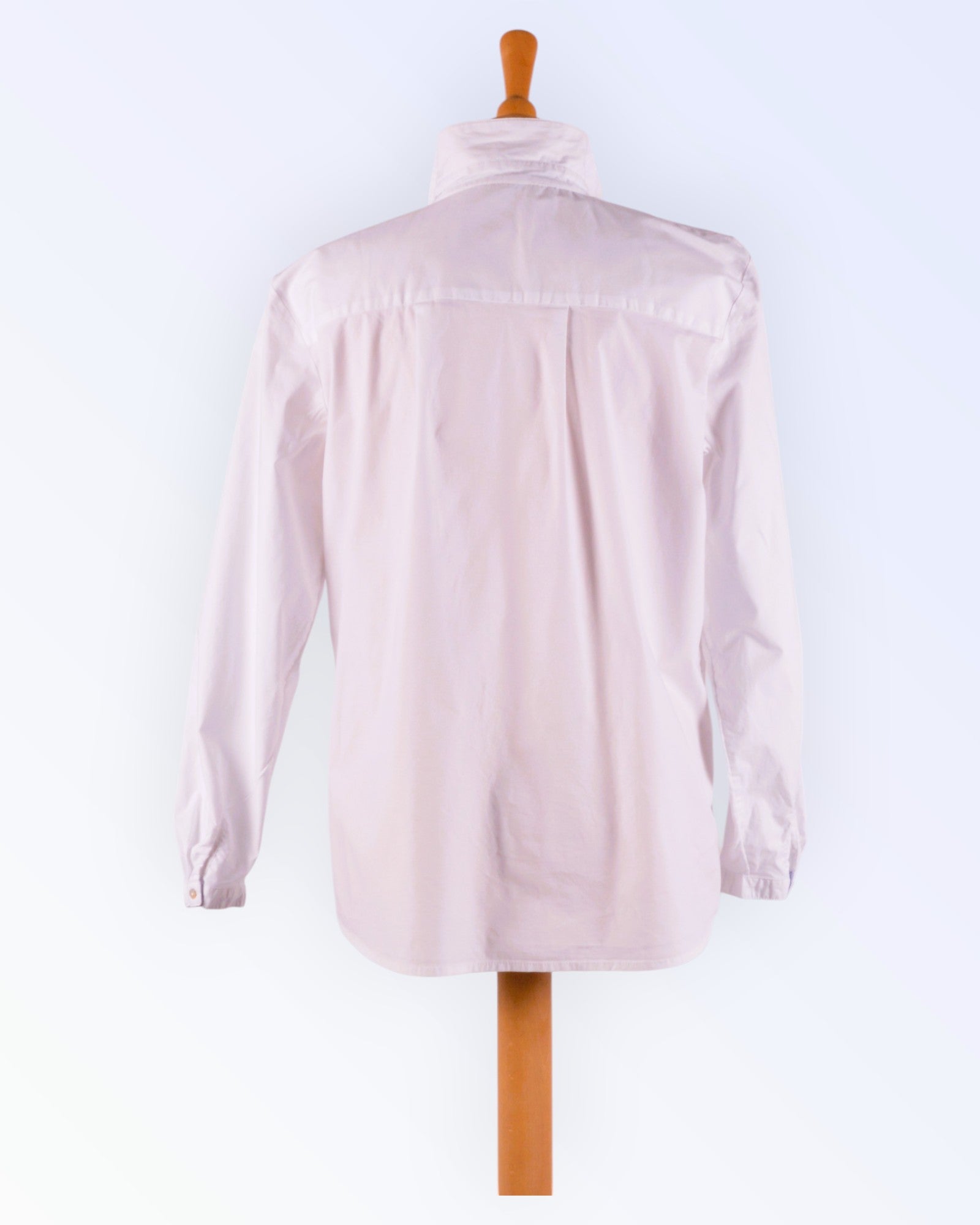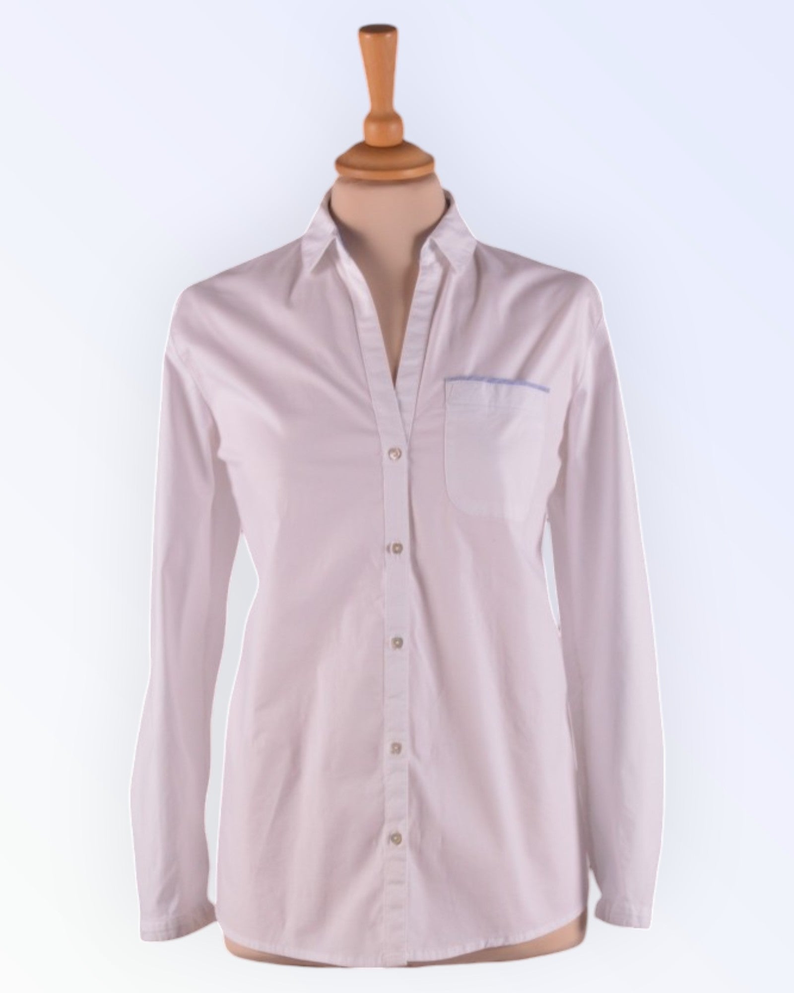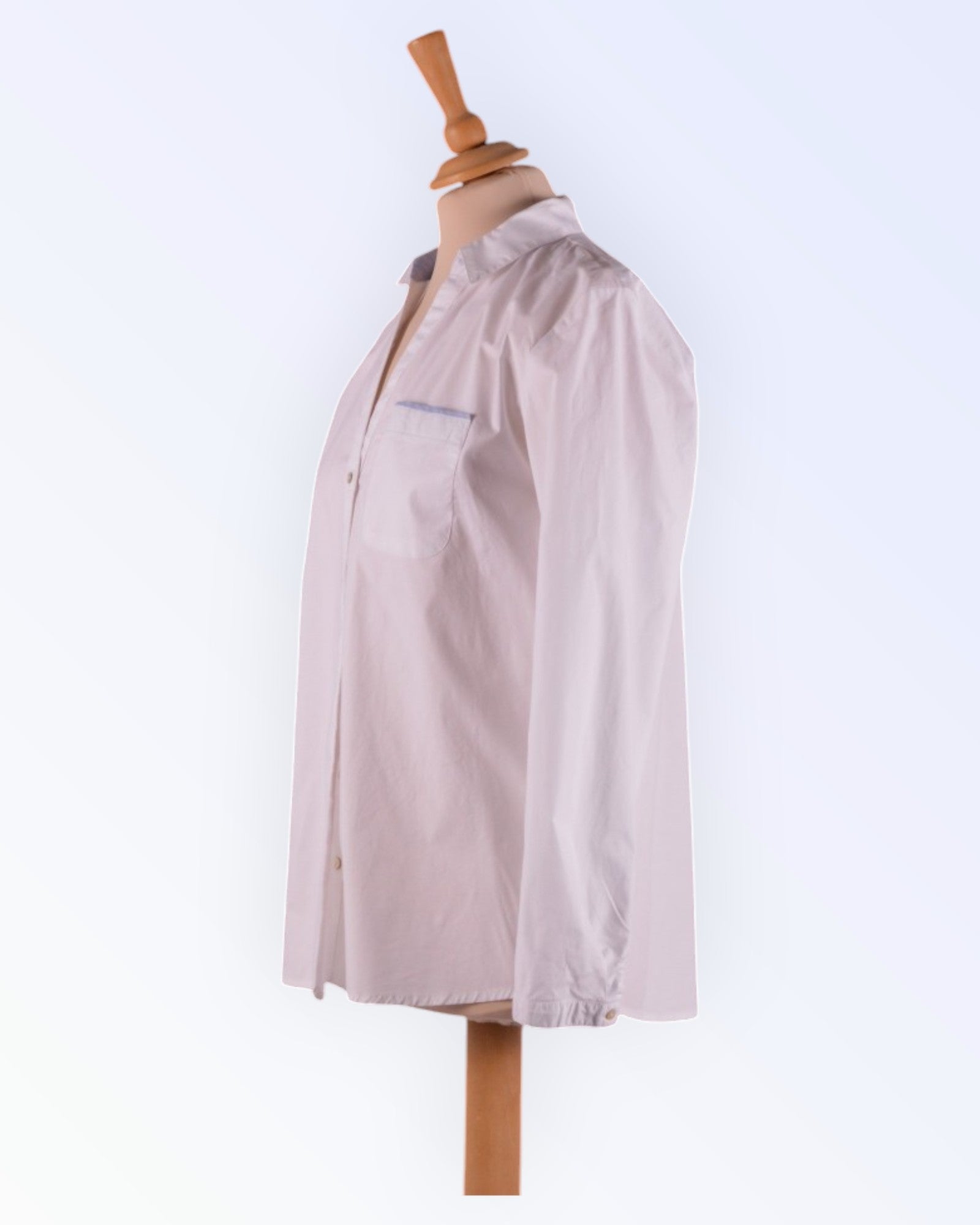 Women's loose-fitting cotton day shirt with long sleeves. The breast pocket edge and the inside of the collar heel are made of light blue fabric.