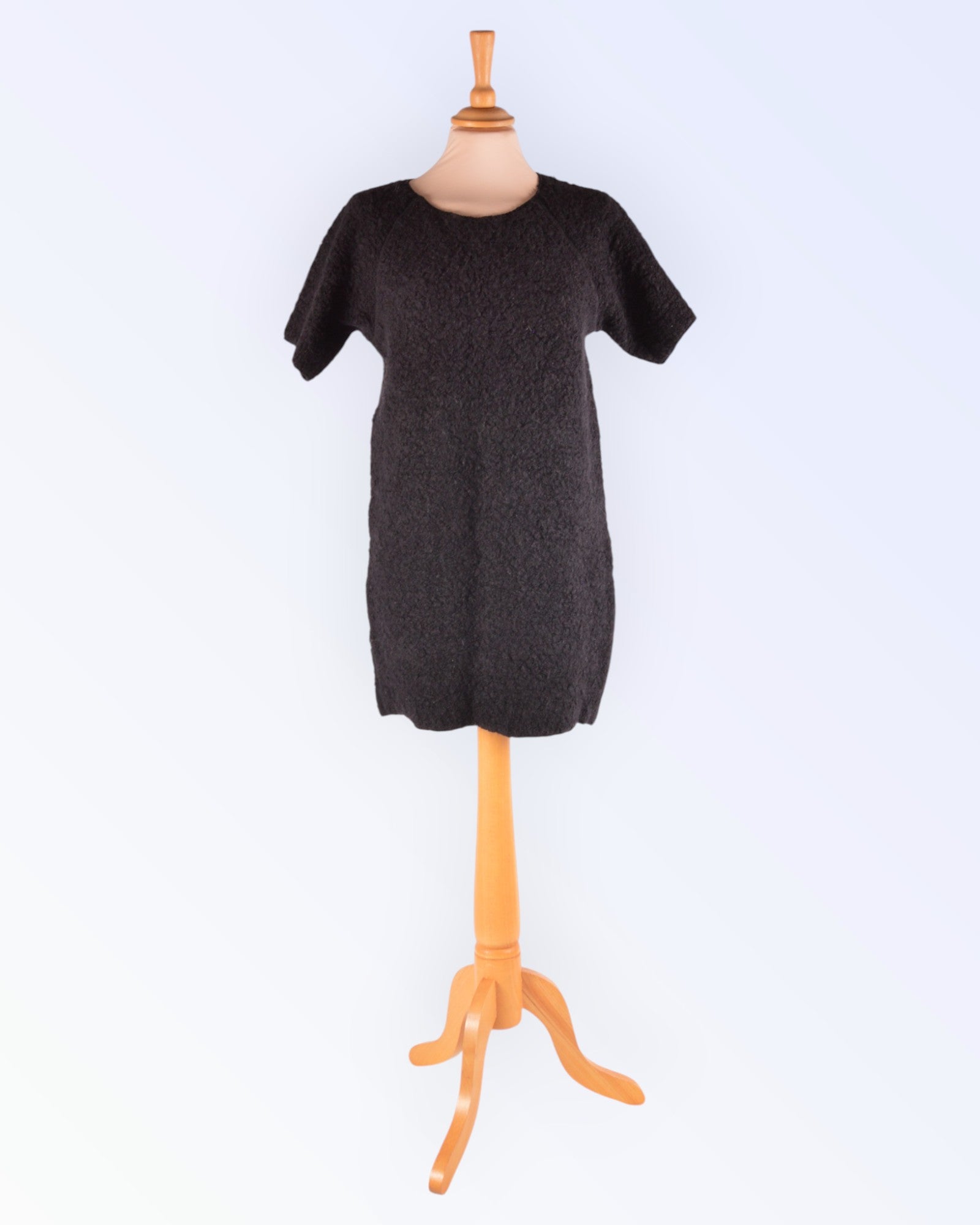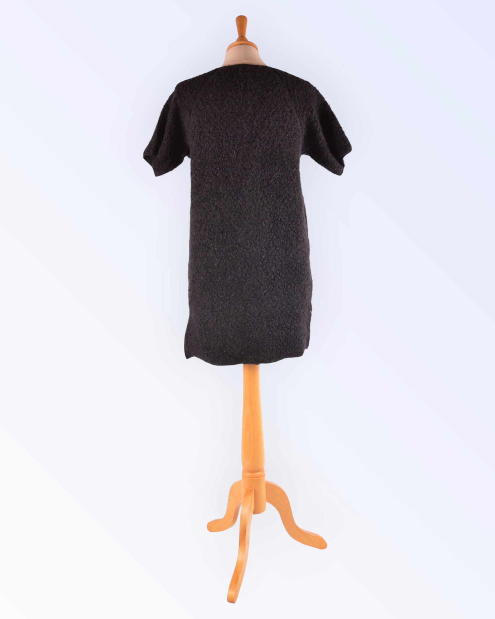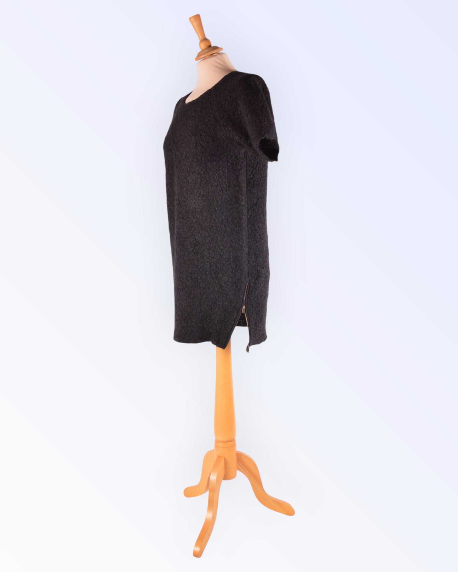 Black raglan tunic made of thick bouclé knit. Left side slit with metal zipper.