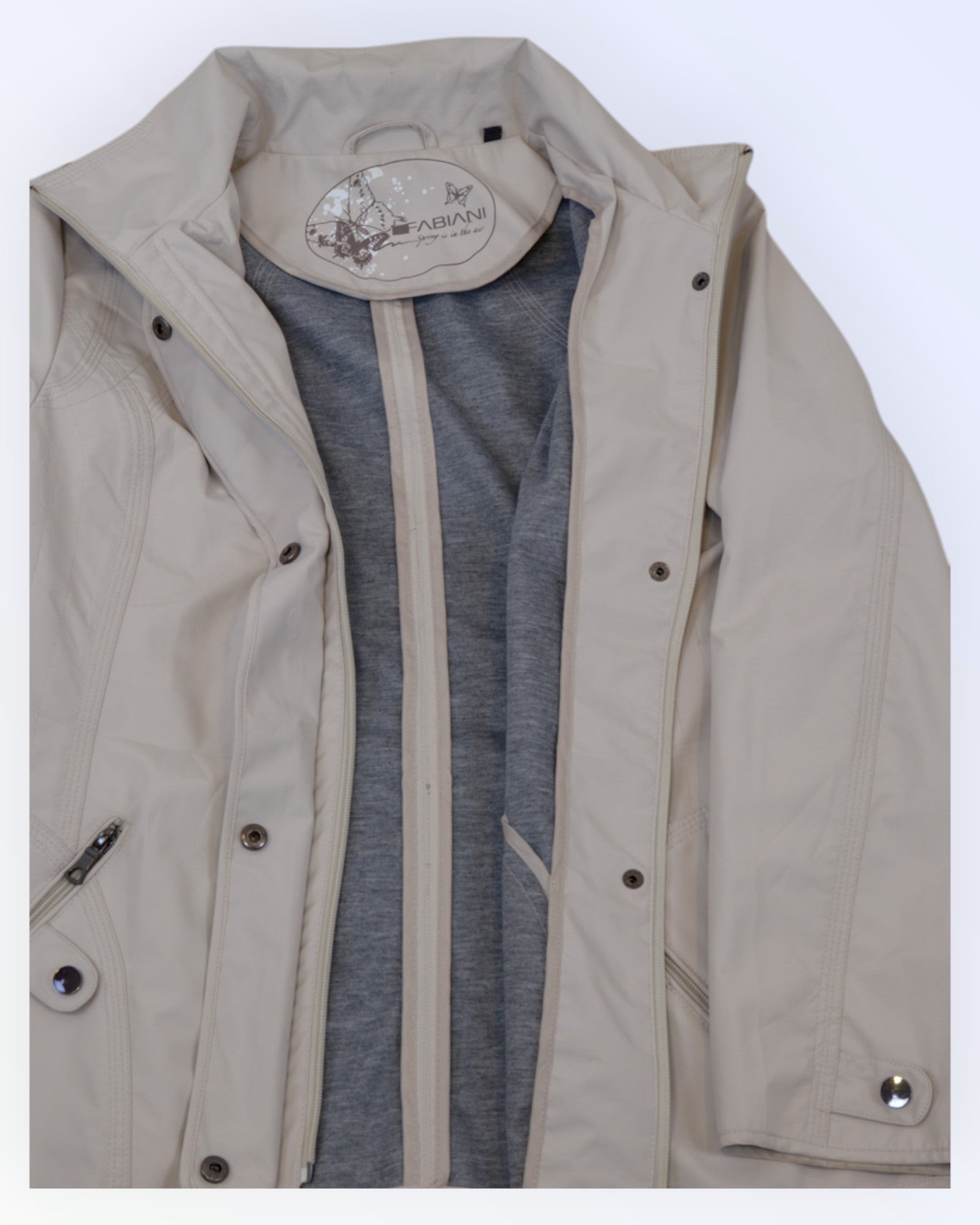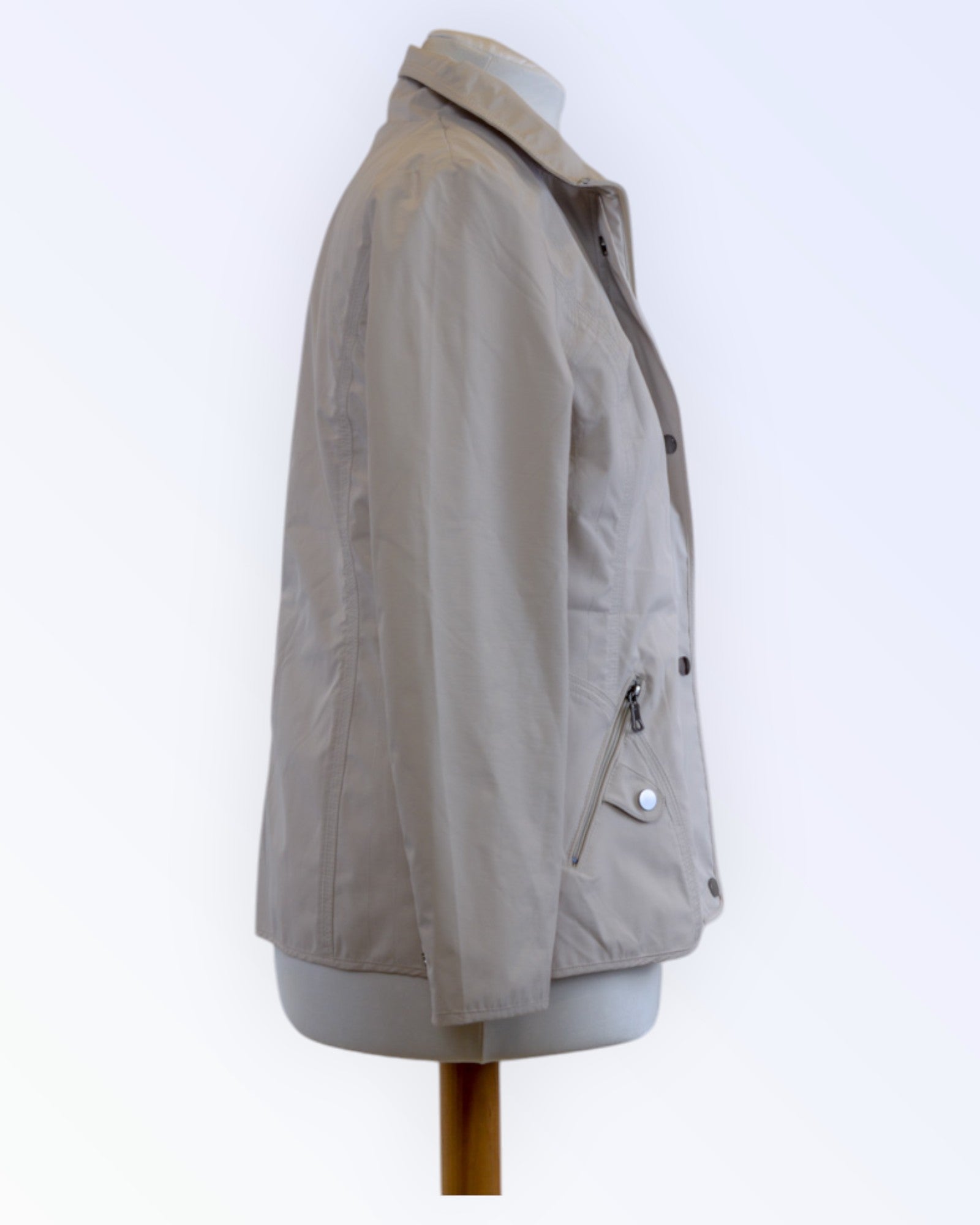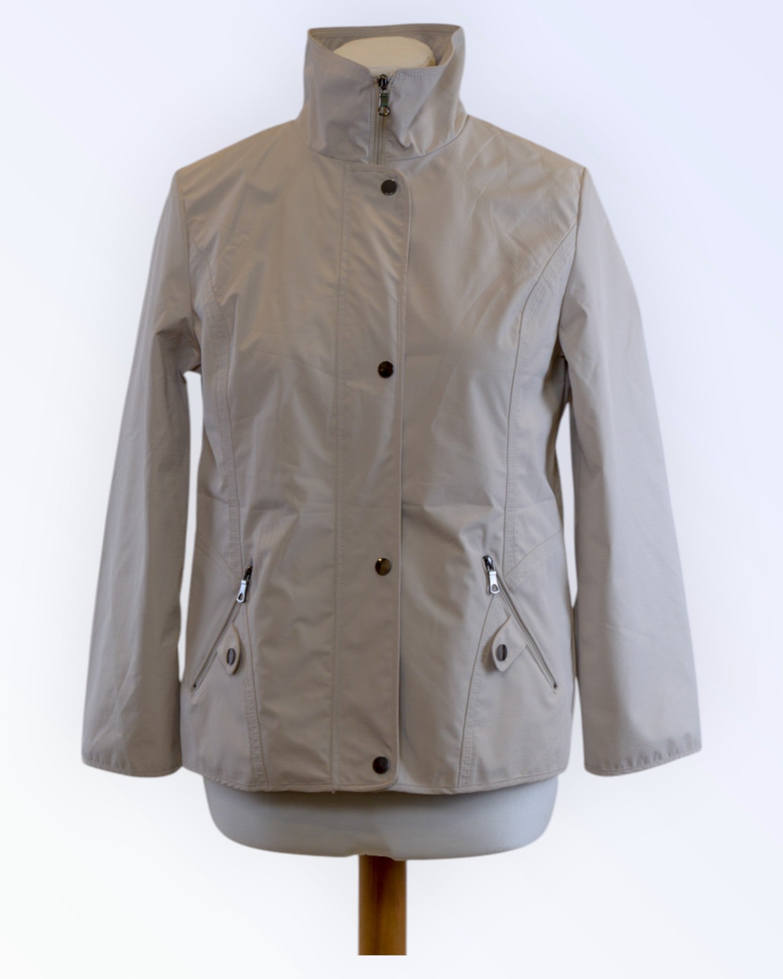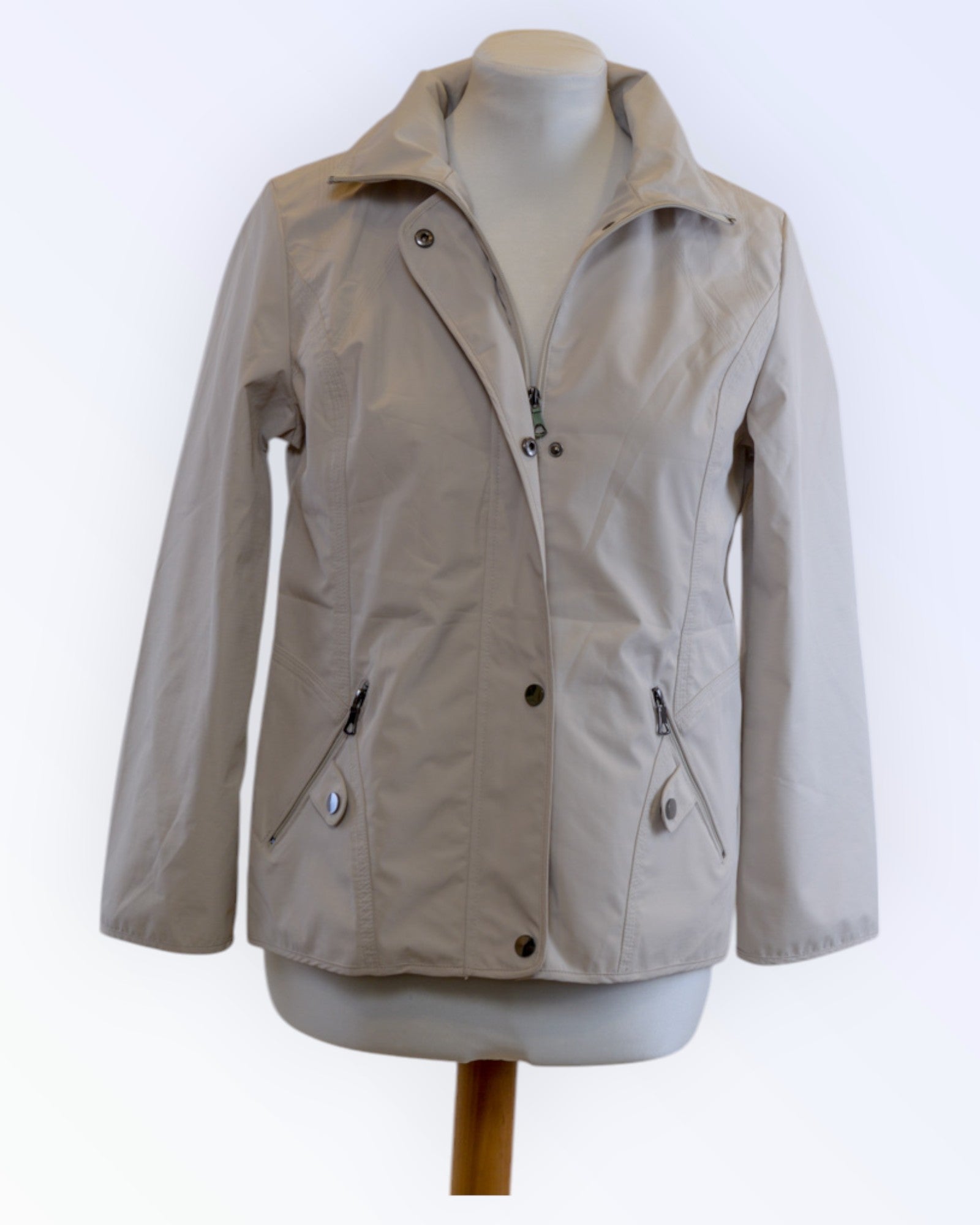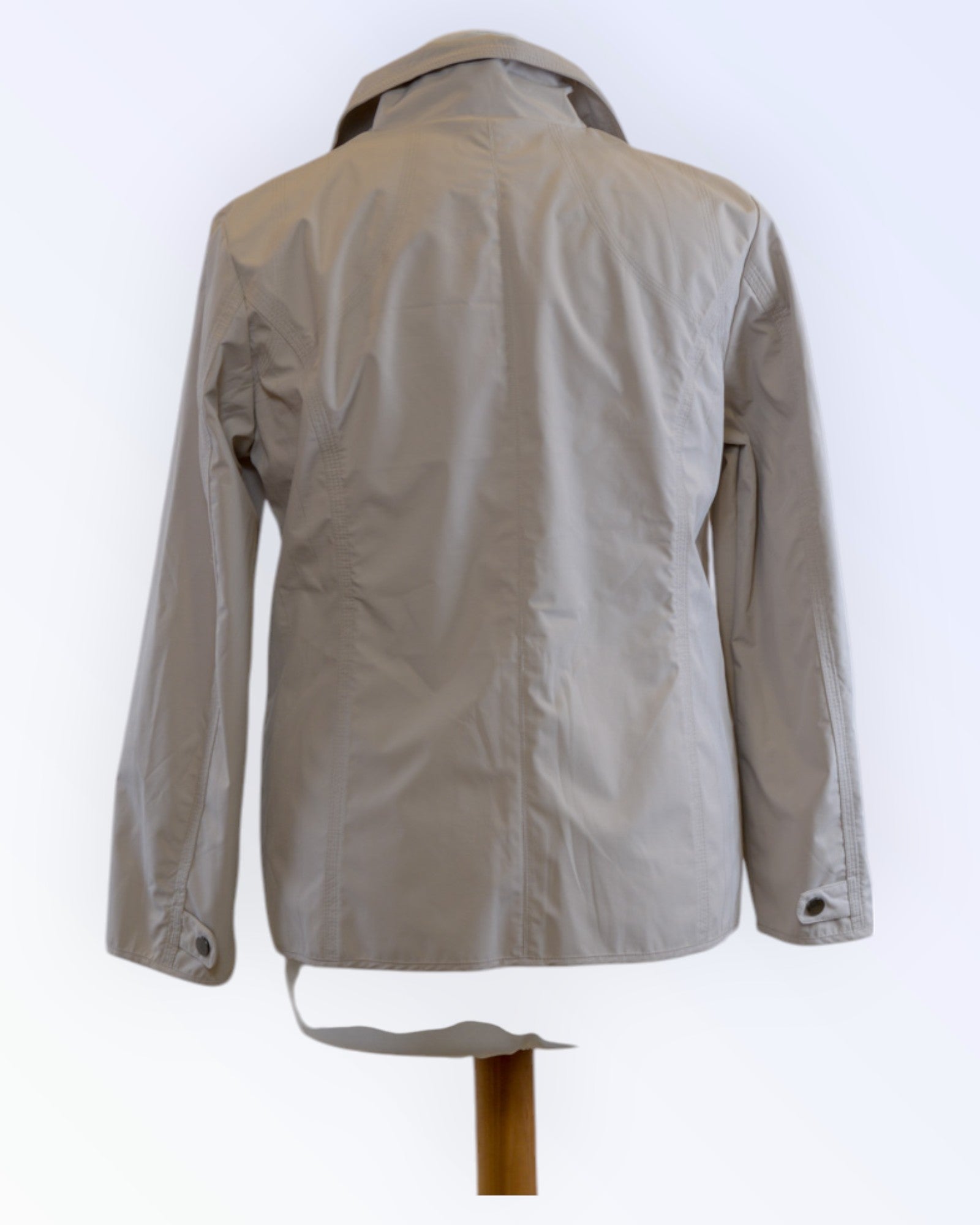 A sporty jacket made of light gray impregnated fabric. Made of weatherproof and water-repellent material, this jacket is indispensable for the fall season.
