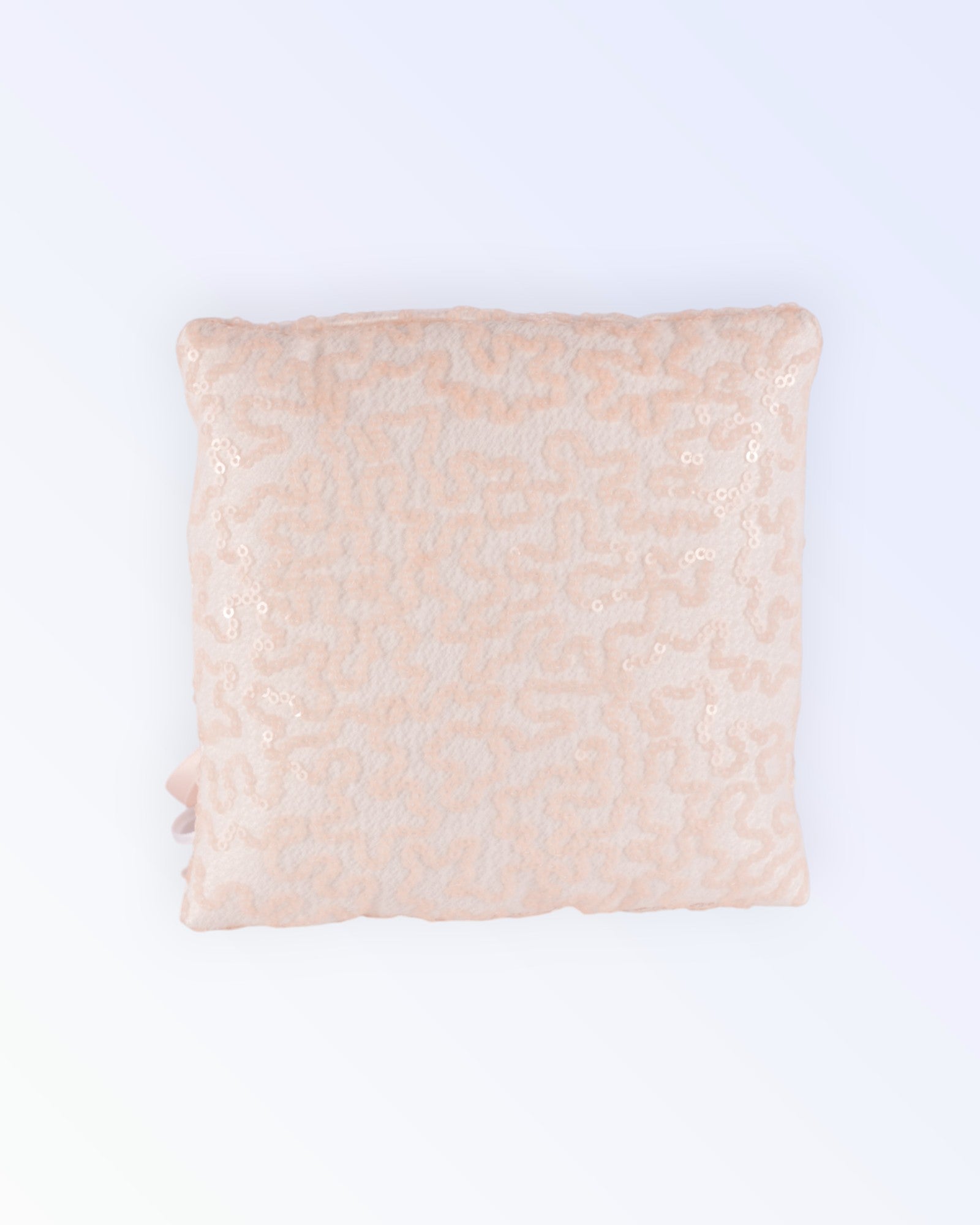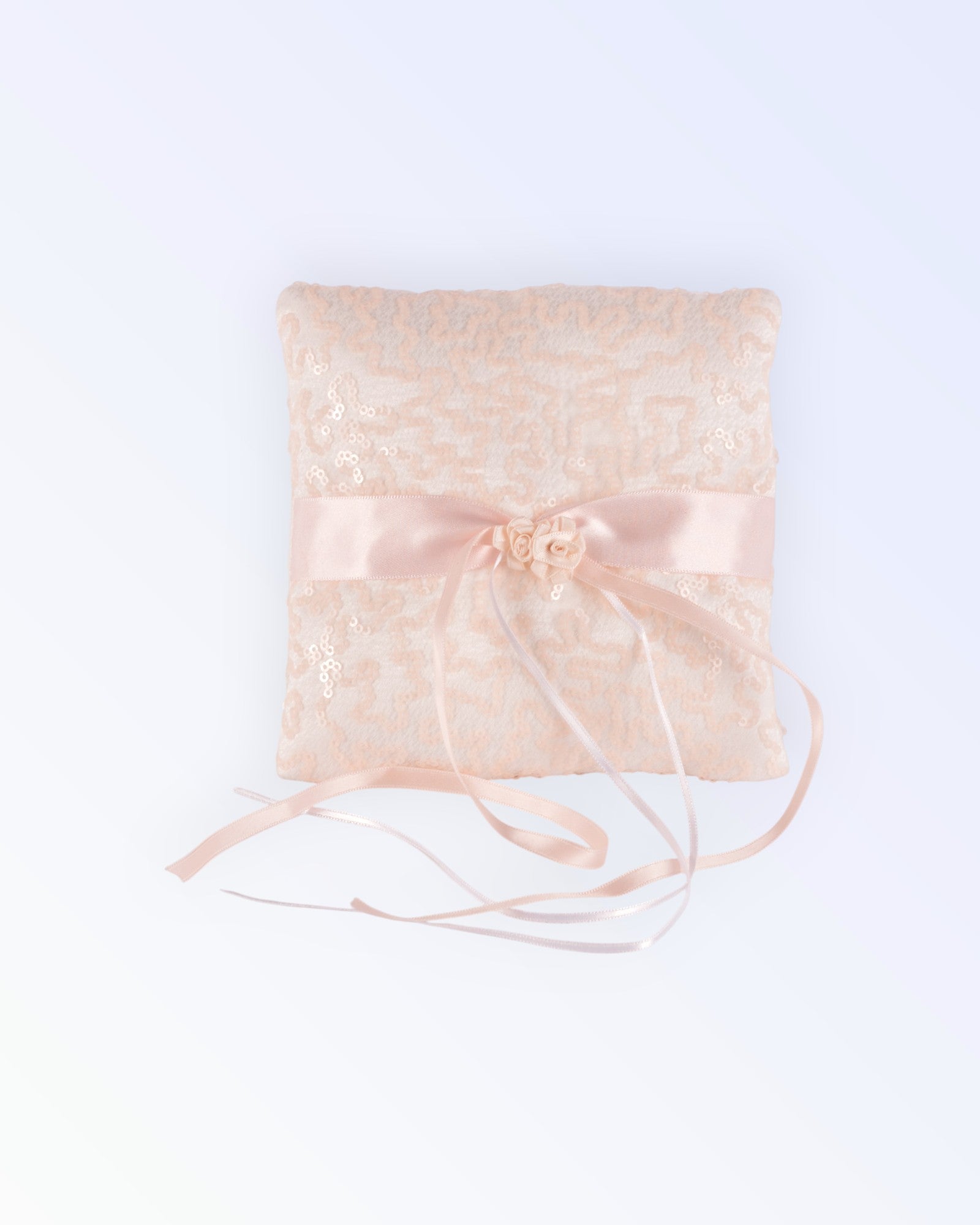 Ring pillow covered with sequin lace. The natural white satin ring pillow is covered on both sides with pink sequin embroidered lace. Roses and satin ribbons are decorated.
