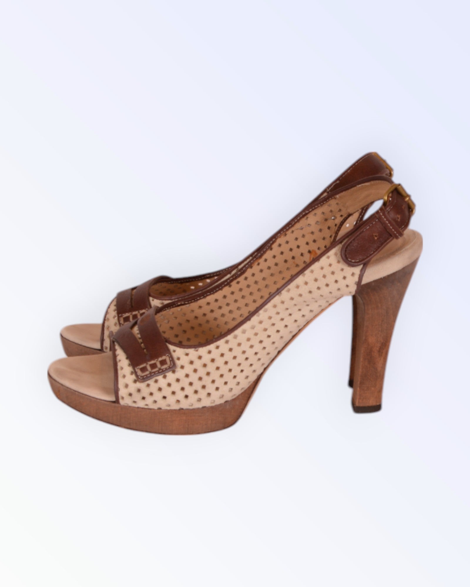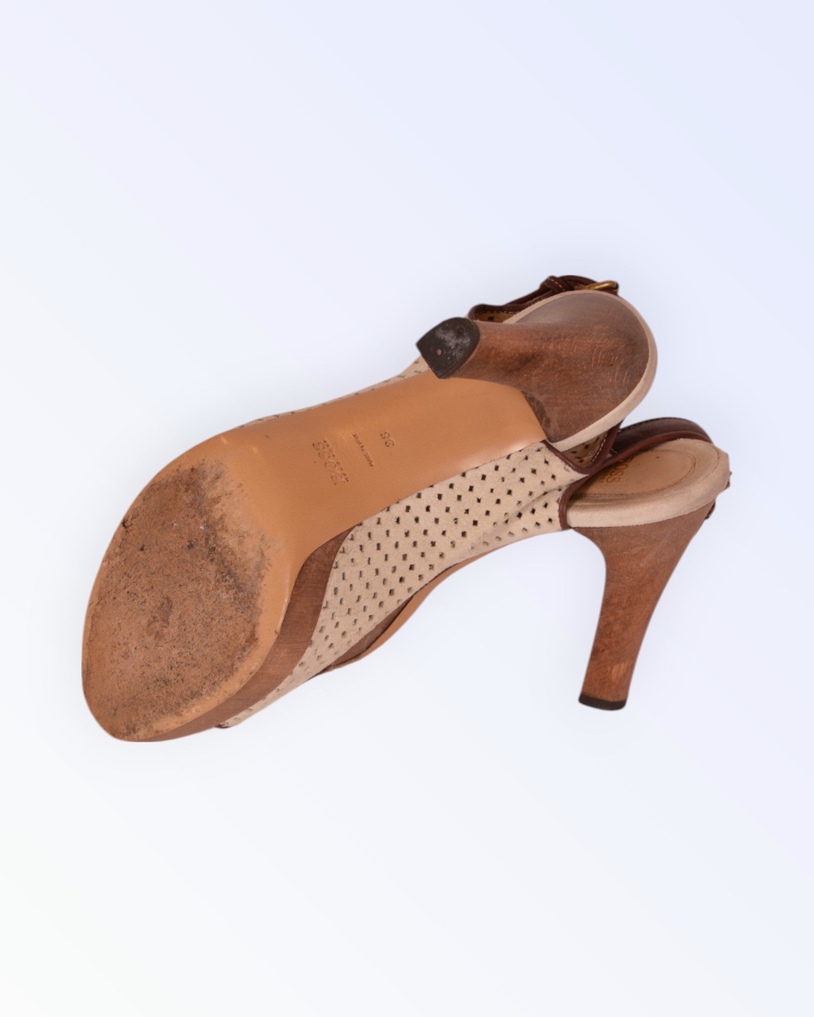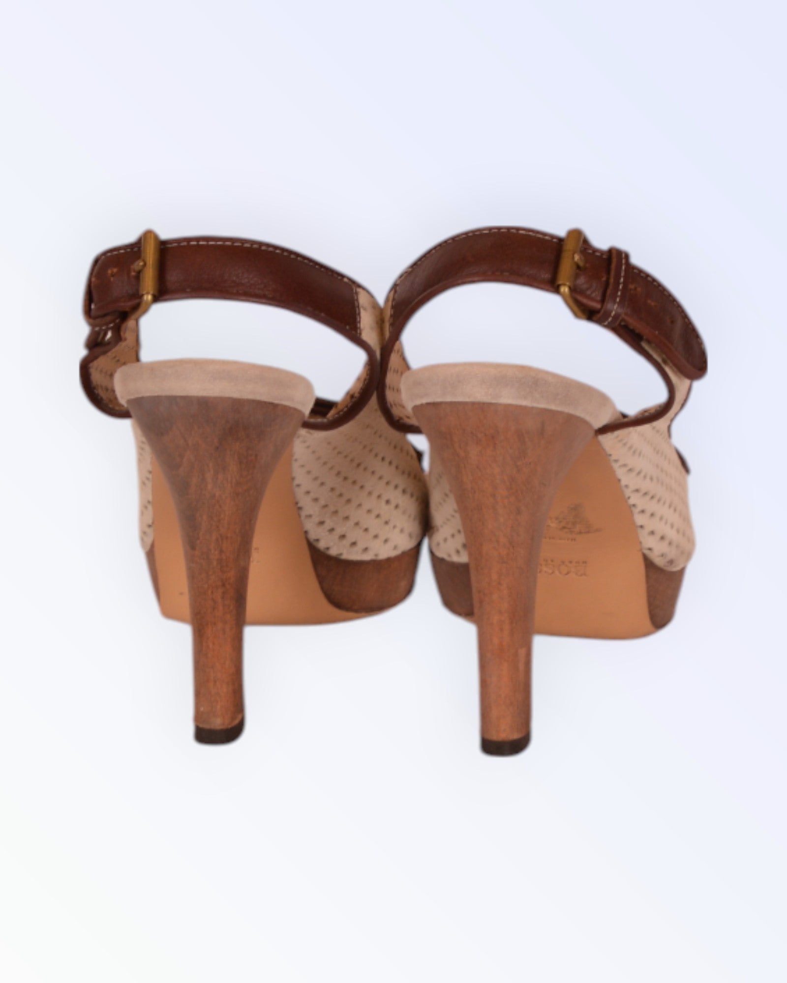 Beige and brown summer shoes. Genuine leather shoes with wooden heels and platform soles.
