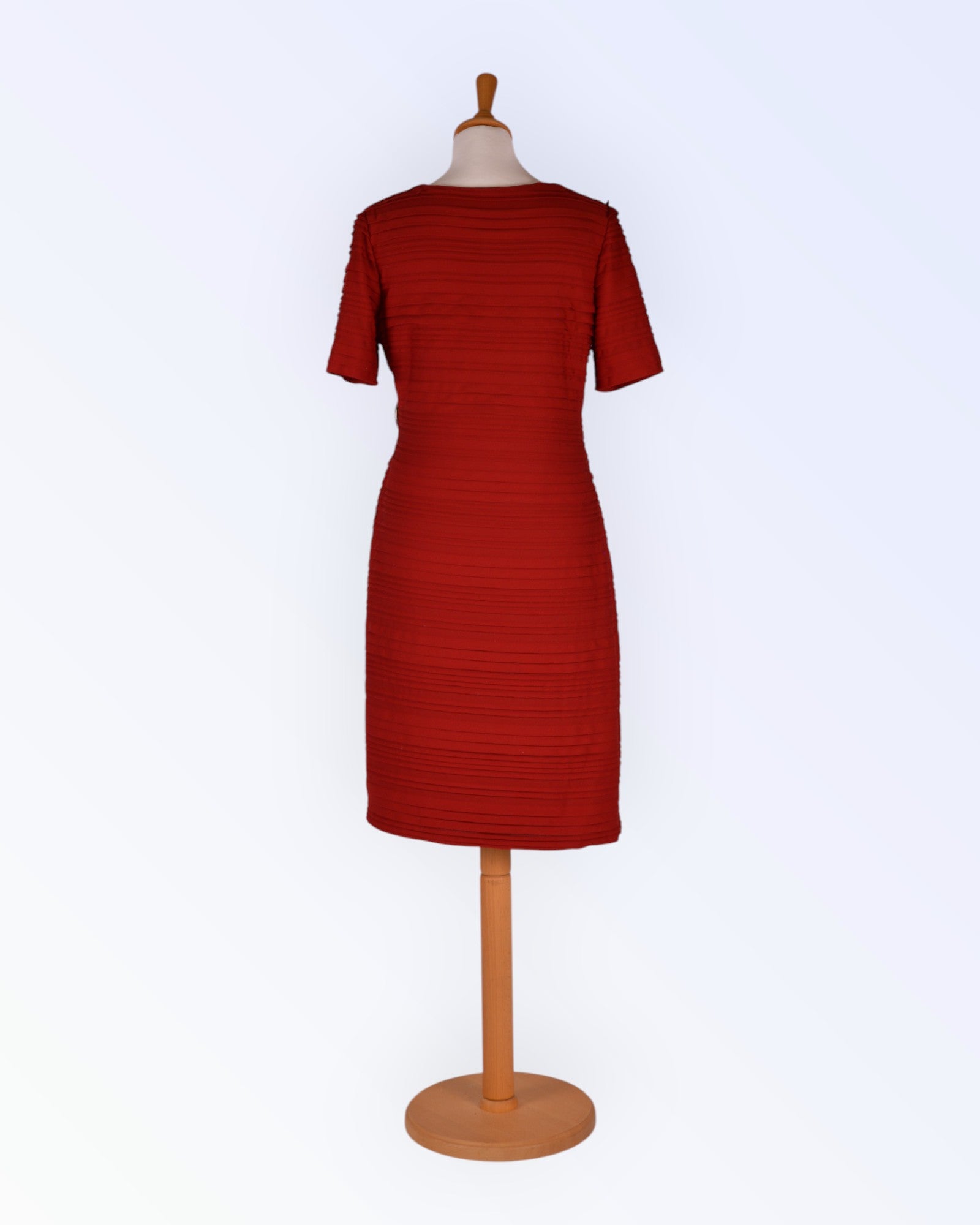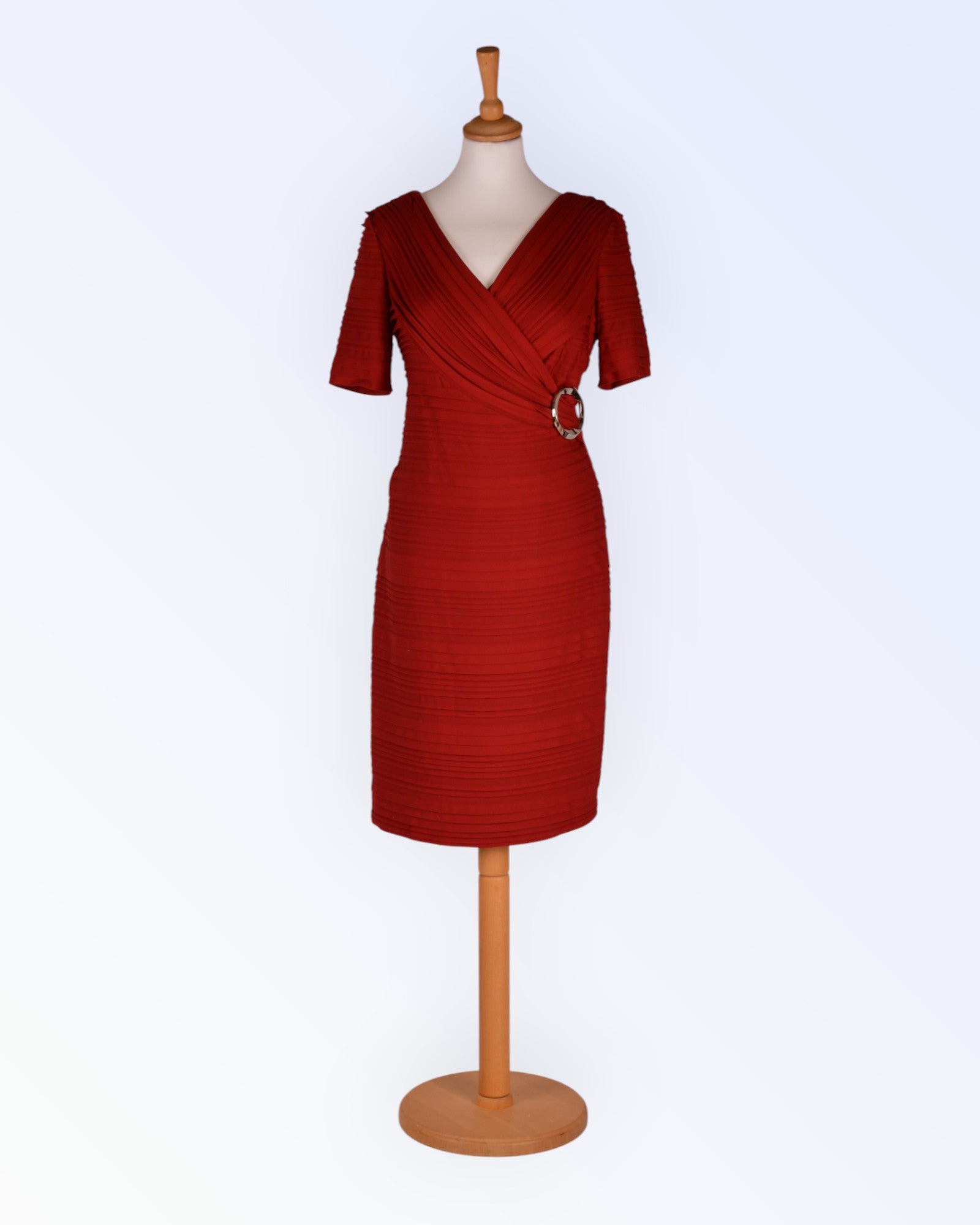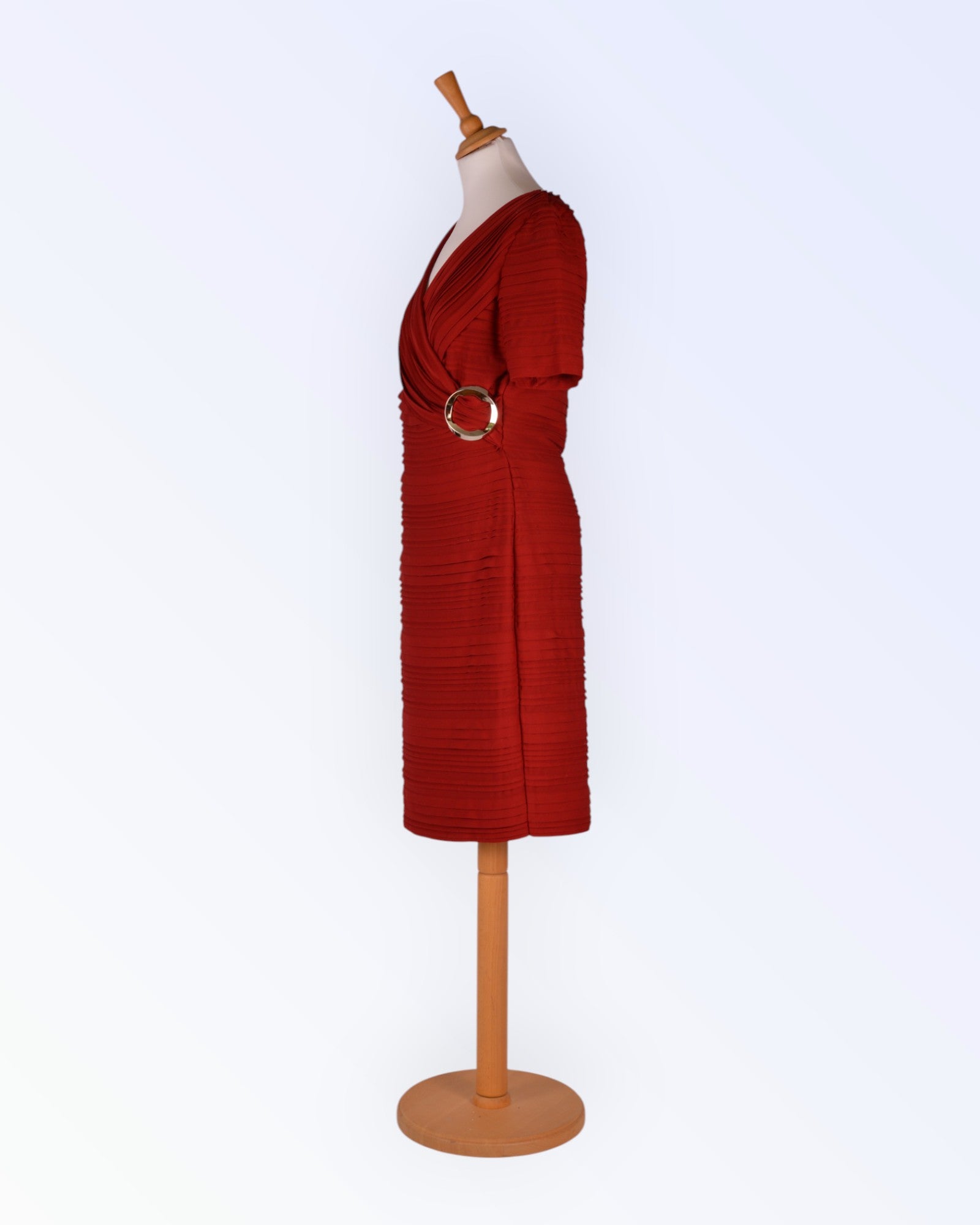 Cocktail dress in soft jersey with an asymmetrical design. The dress is accented by a large silver-colored plastic buckle. Lined product. Zipper on the left side.