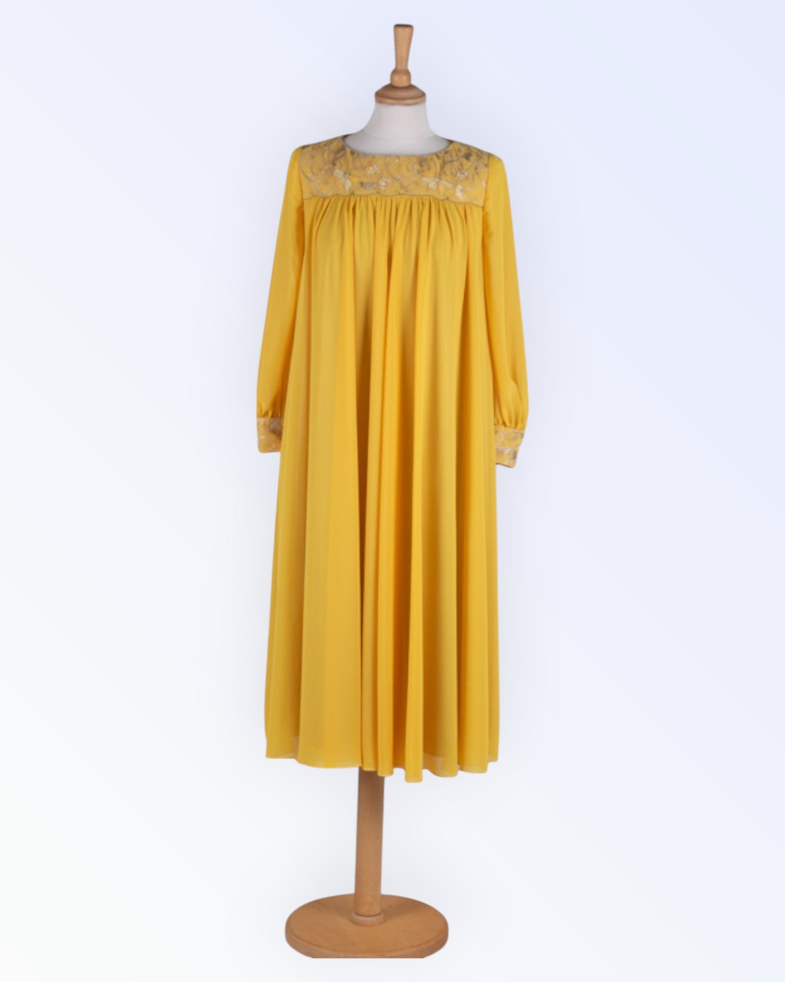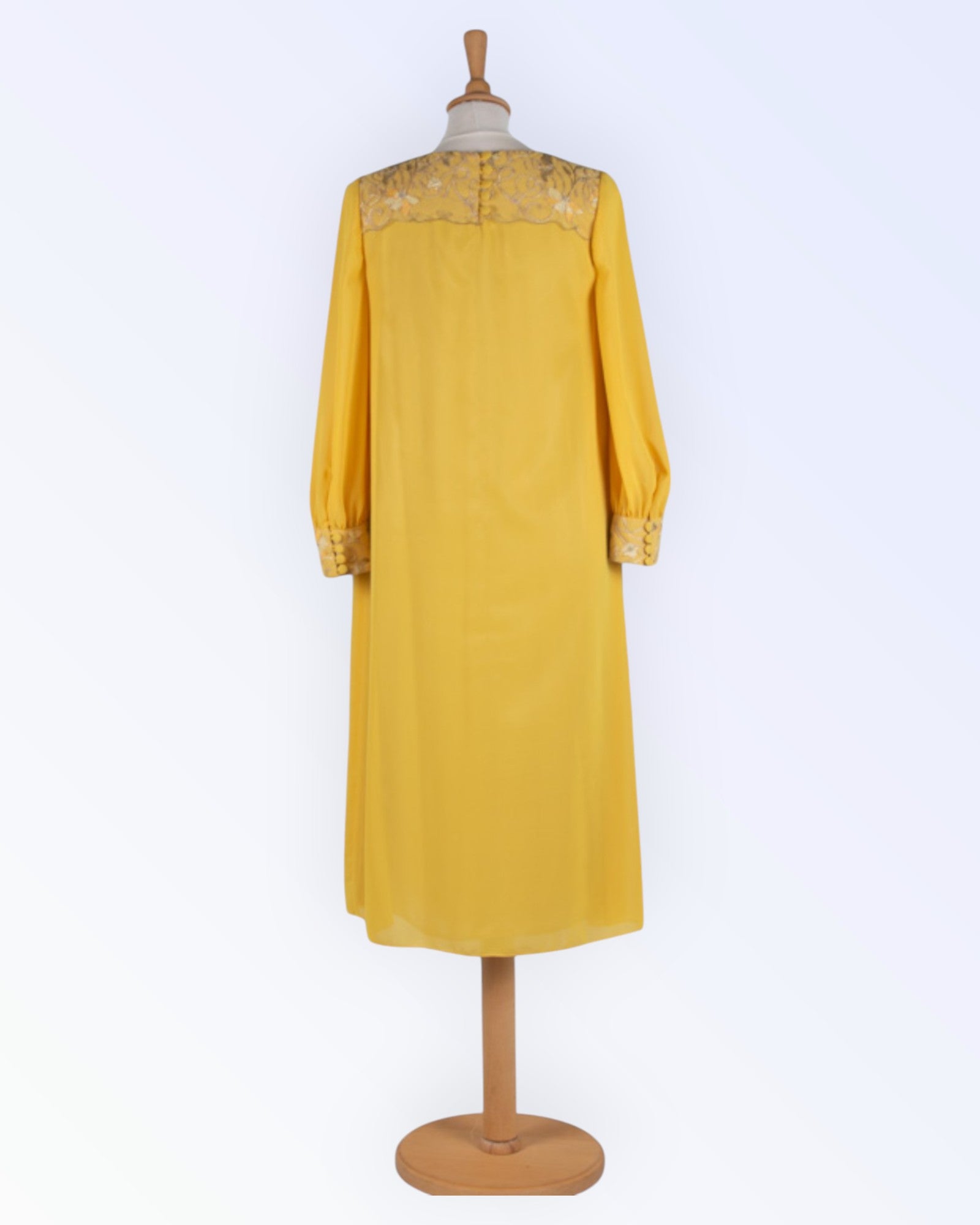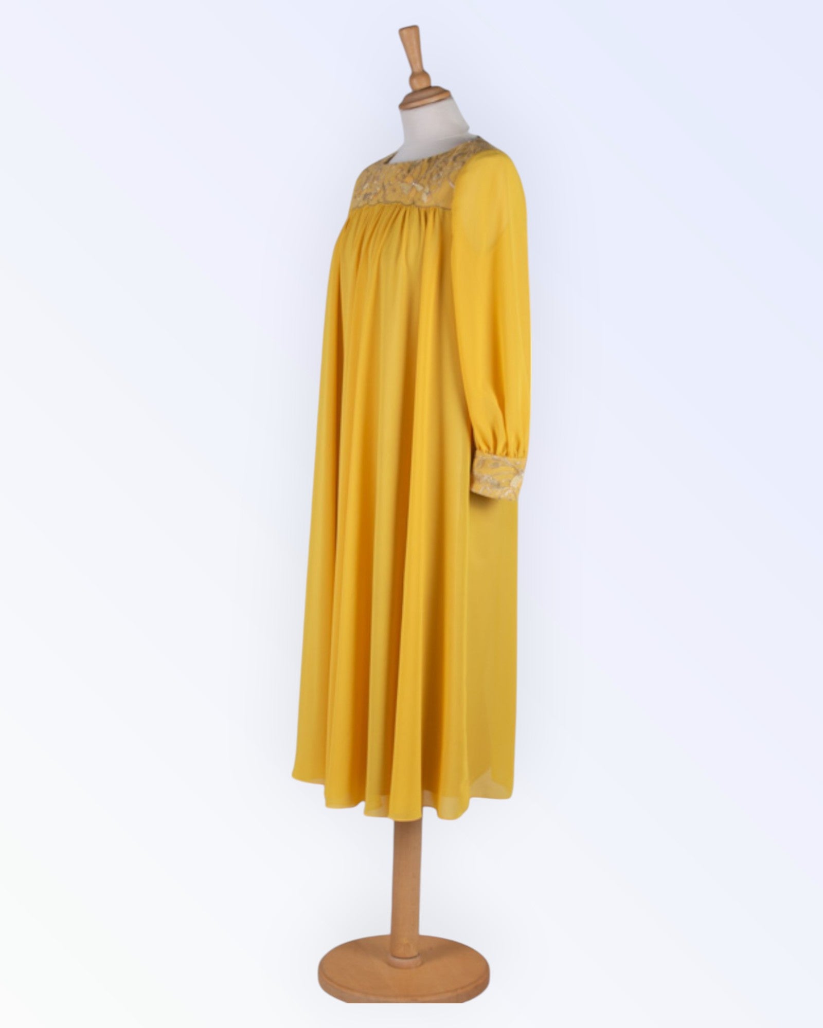 Yellow chiffon party dress with lace shoulder and cuffs decorated with rhinestones.