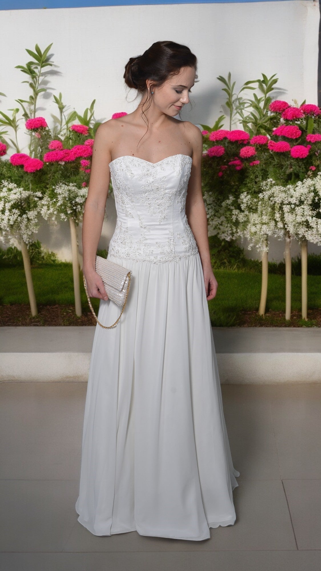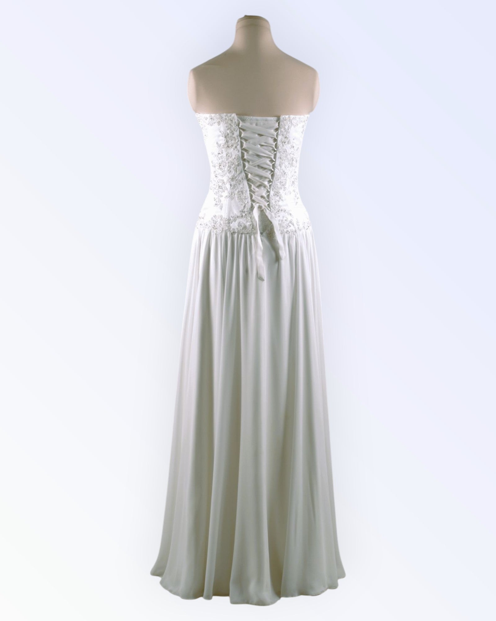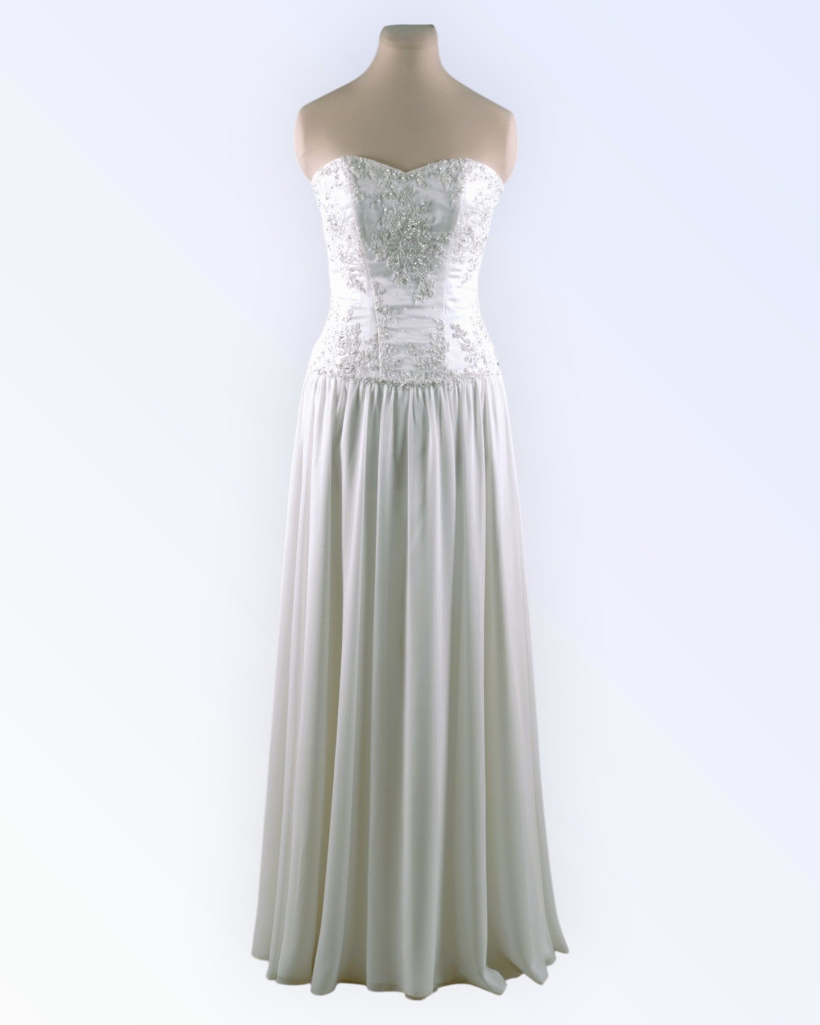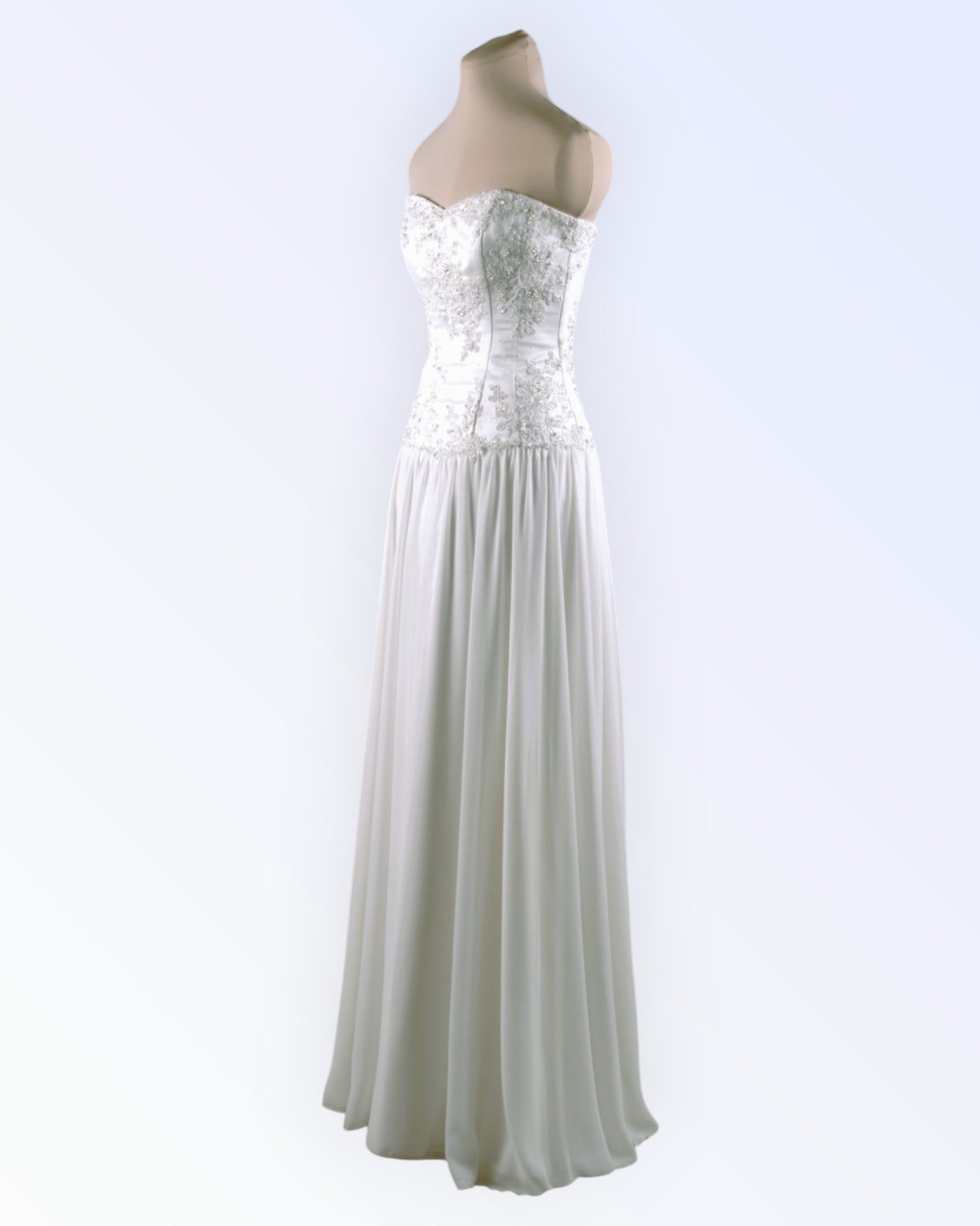 Off-white wedding dress with an embroidered top and a wide chiffon skirt.