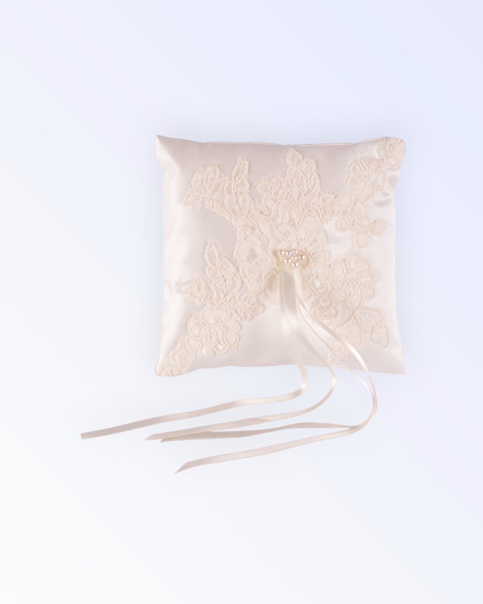 The top of the satin ring pillow is decorated with a lace motif and seven plastic pearls.