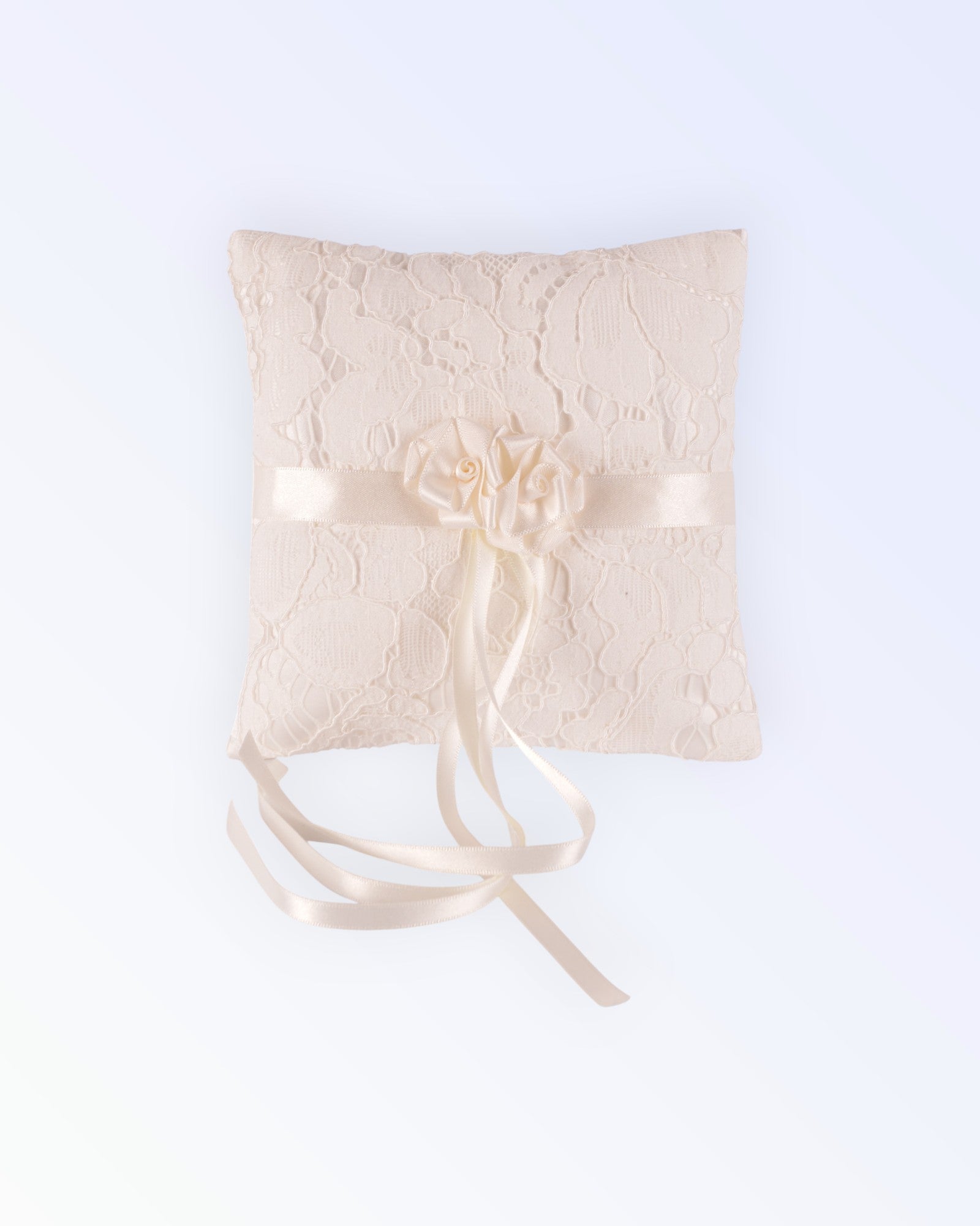 The top of the satin ring pillow is covered with lace. It is decorated with two handmade satin ribbon roses.