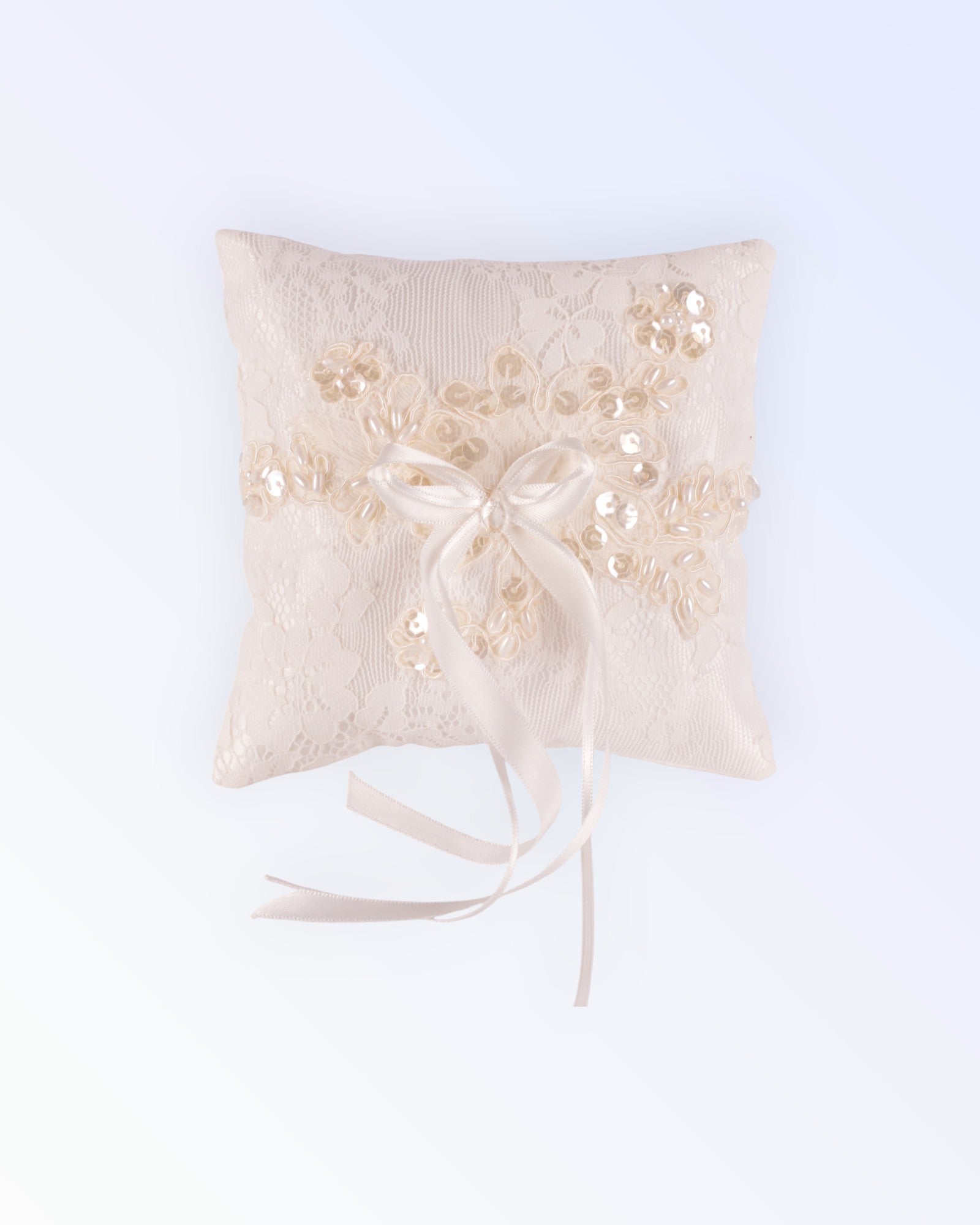 Ring pillow covered with natural white thin lace. Decorated with lace applique, pearls, sequins and satin ribbons.