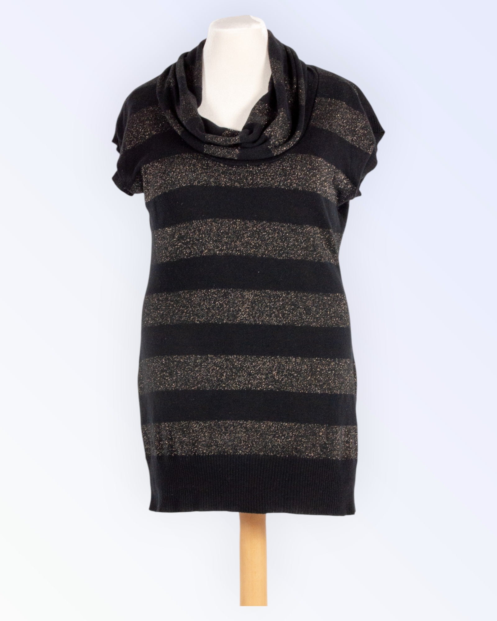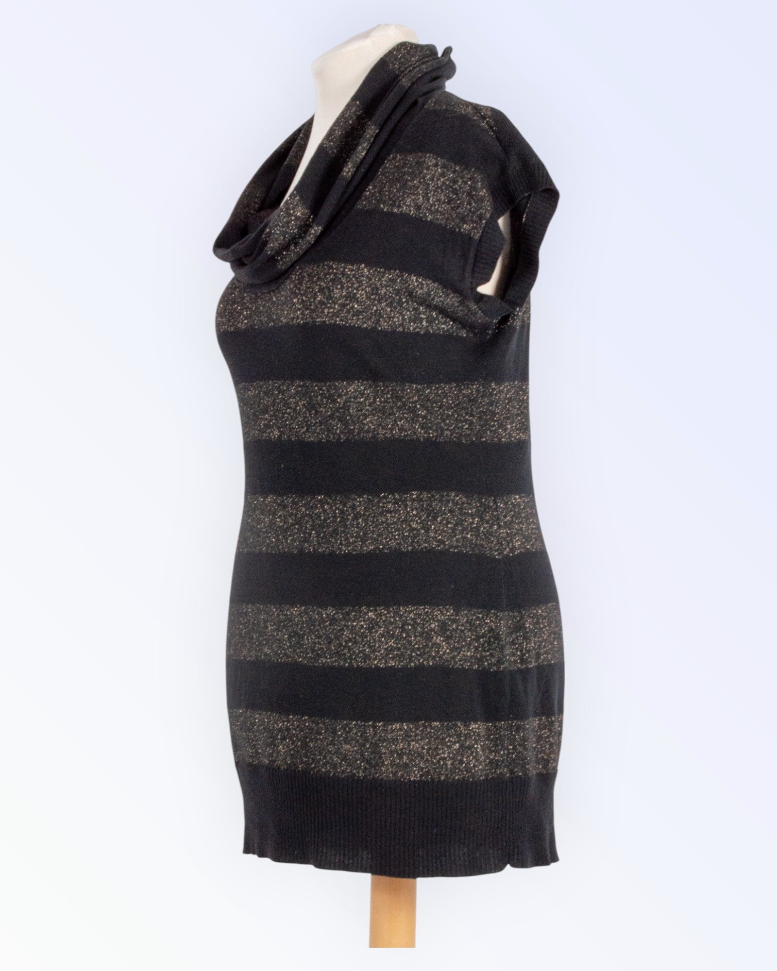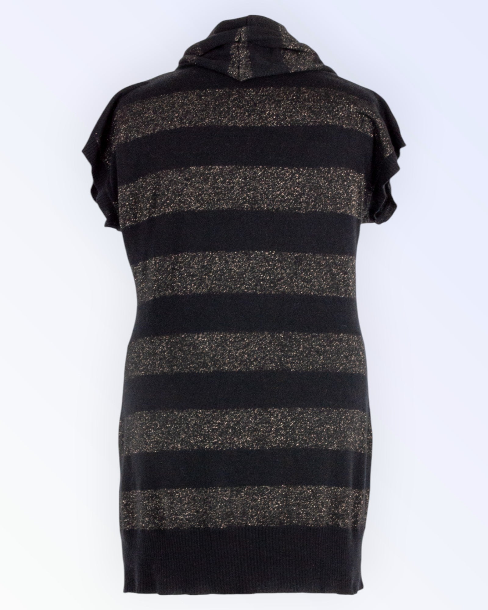 Knitted tunic with a shawl collar in horizontal stripes. The product is made of black and silver metallic thread yarn.
