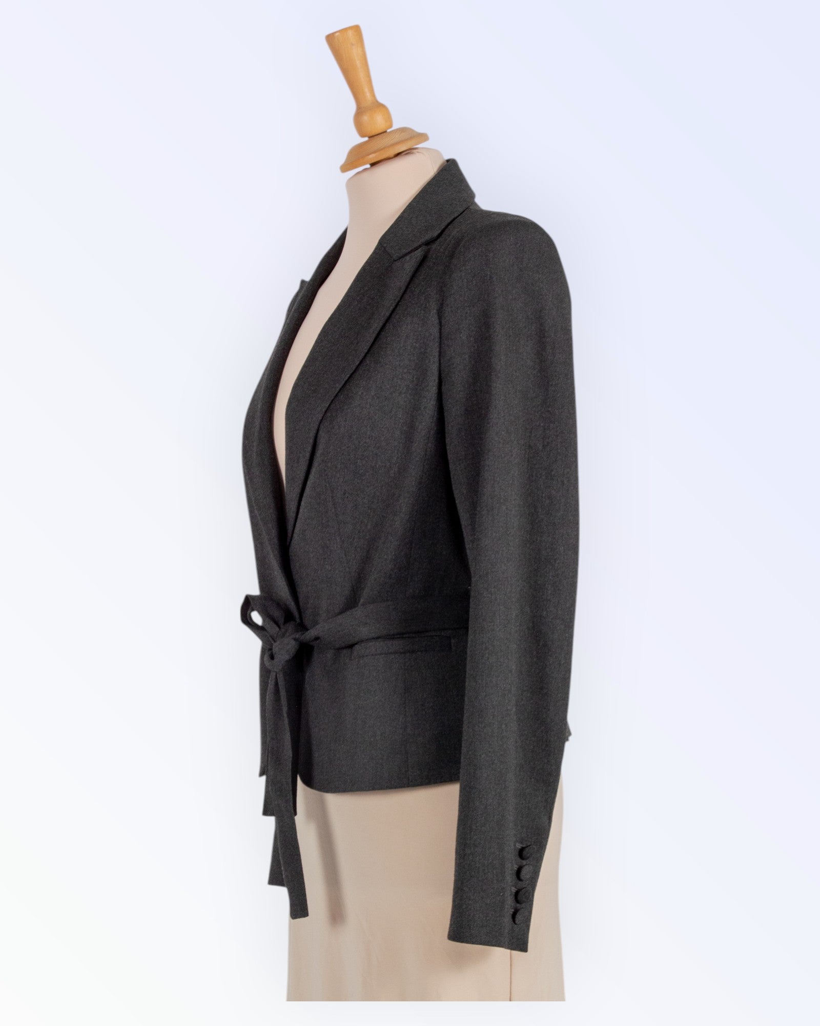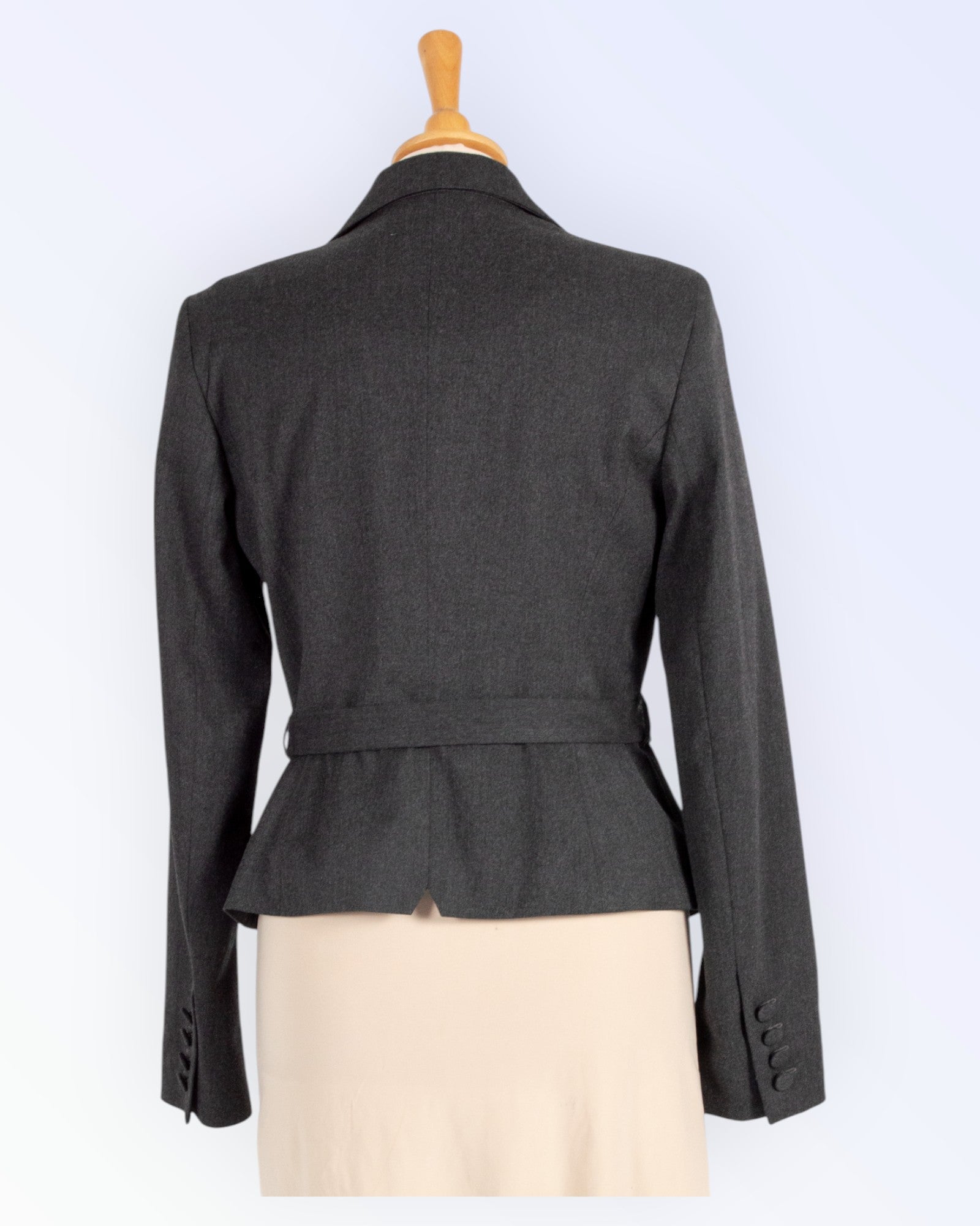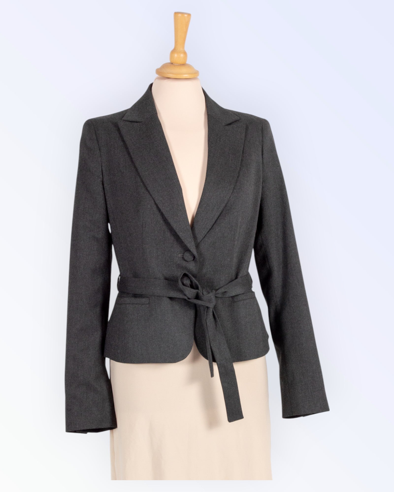 Dark gray suit jacket with belt. An elegant jacket for everyday work wardrobe.