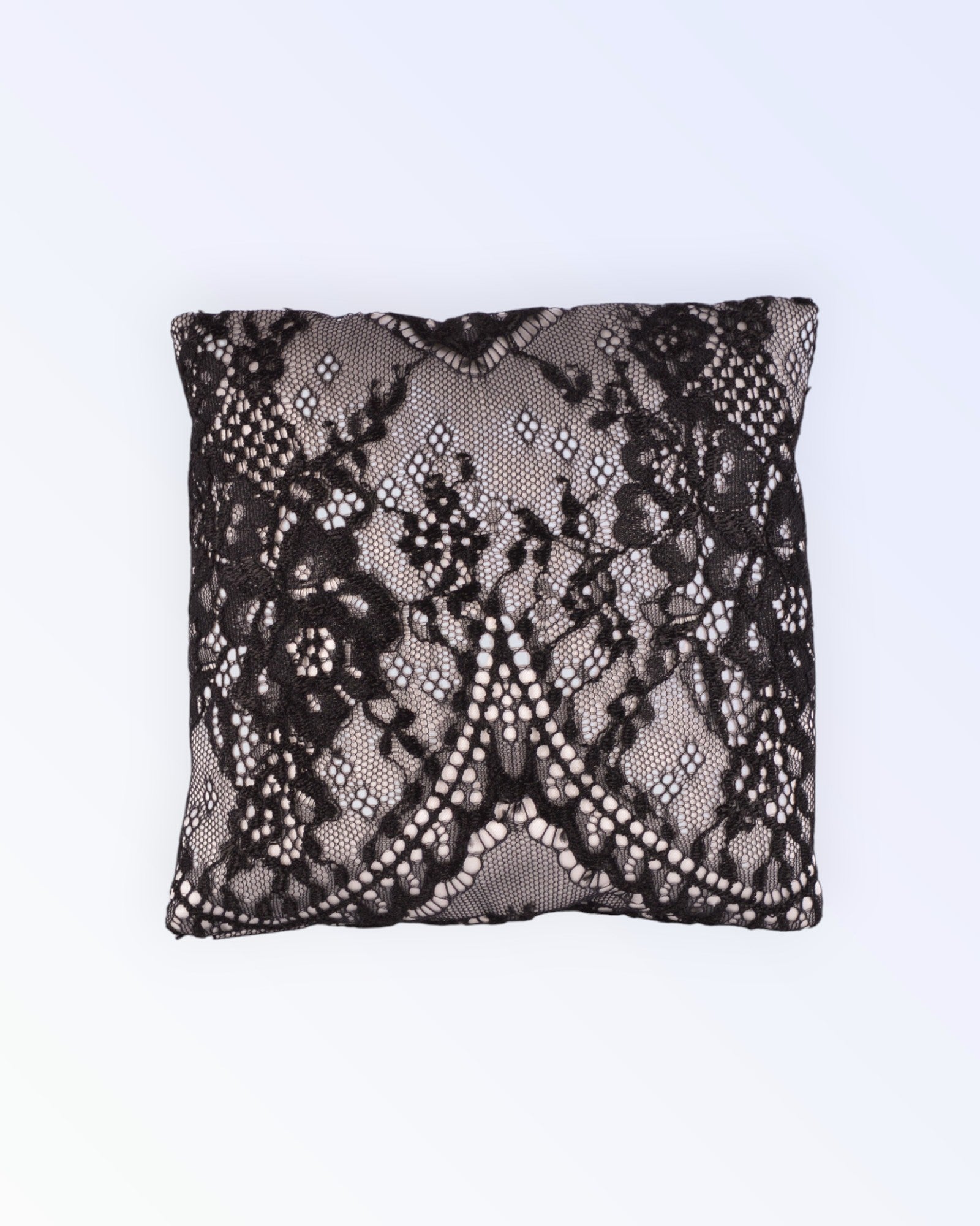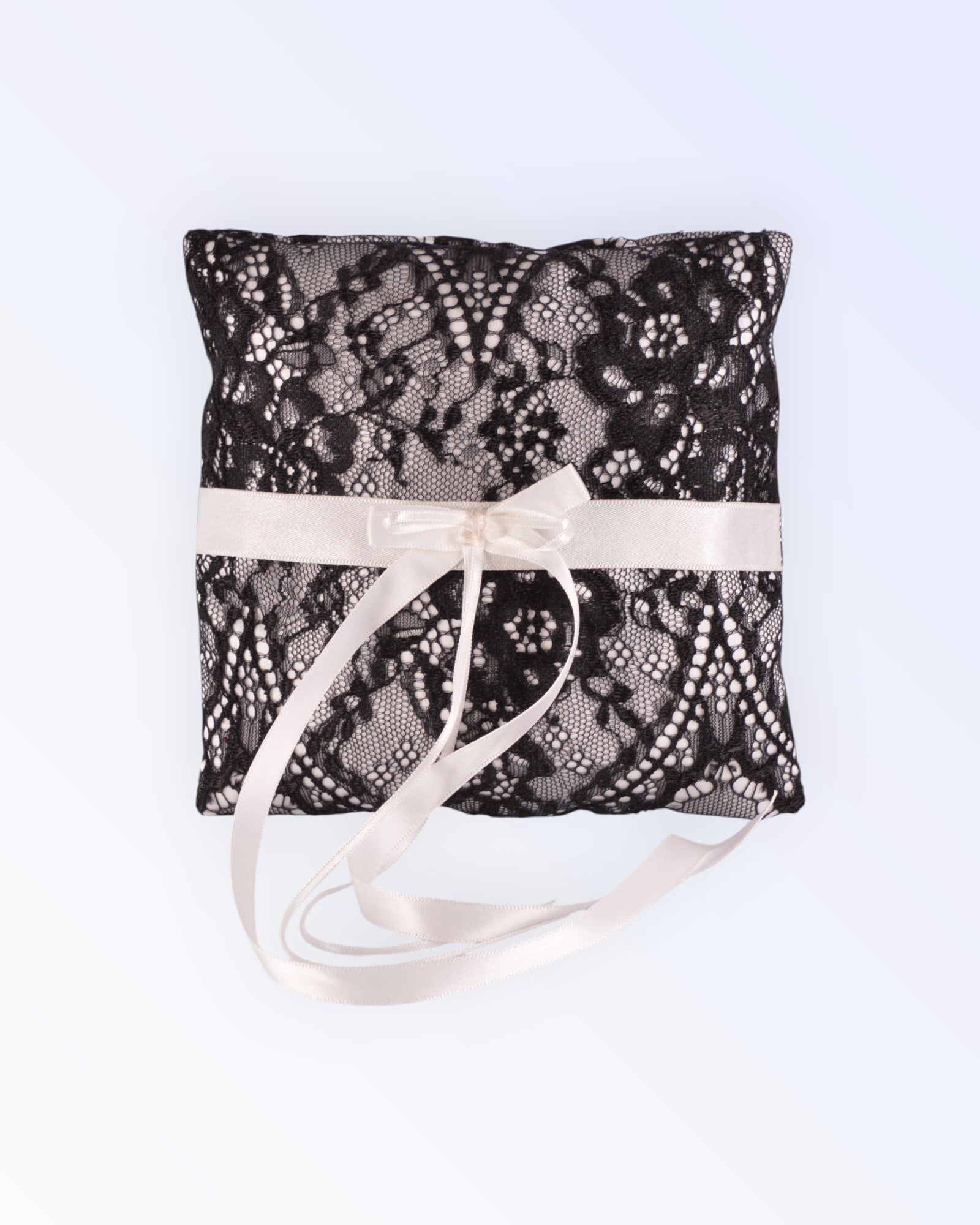 Black and white ring pillow. The natural white satin ring pillow is covered with black lace on both sides. Decorated with satin ribbons and glass beads.