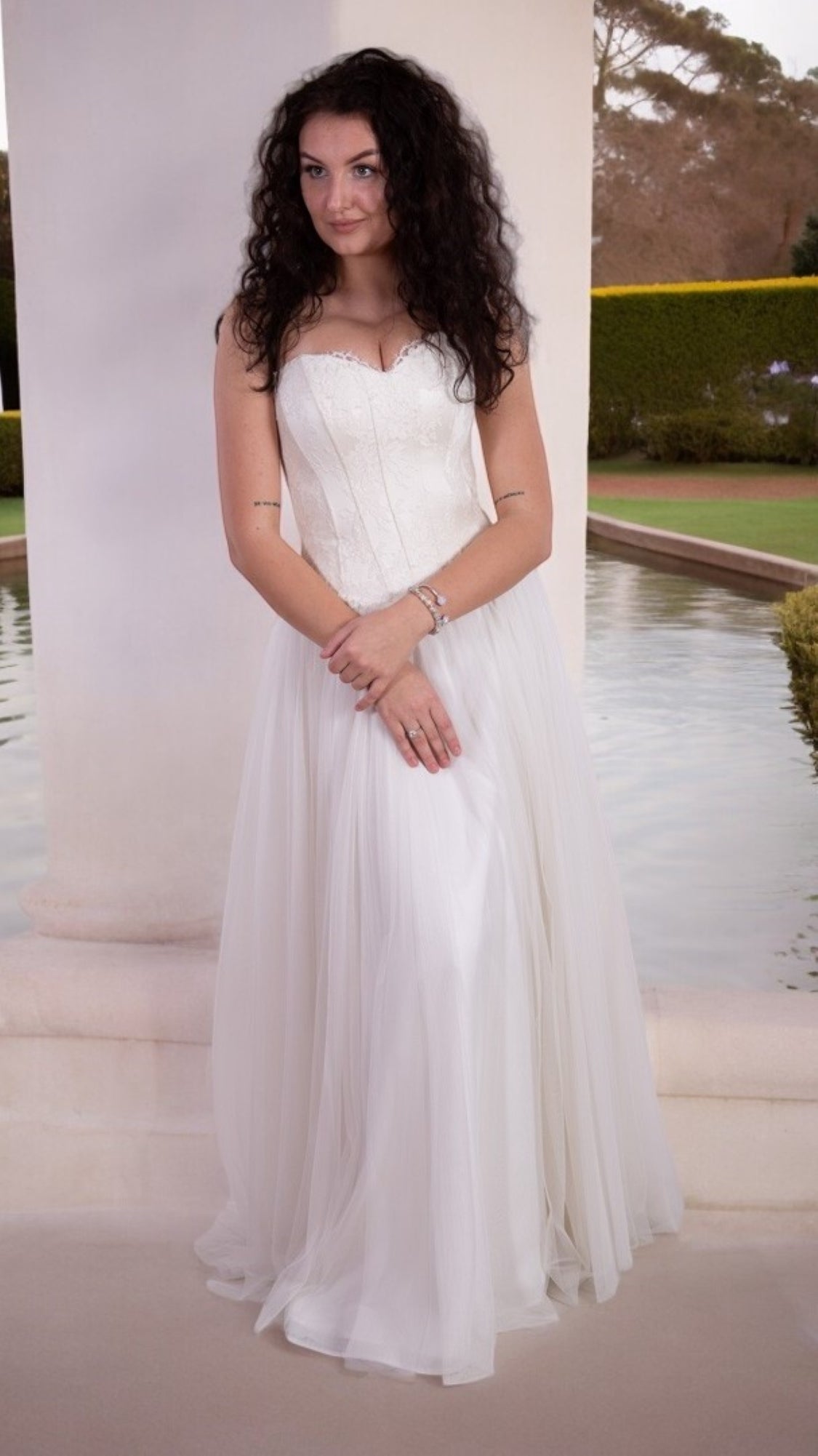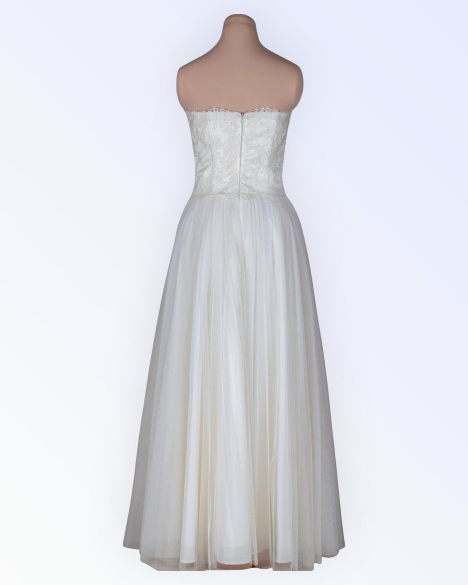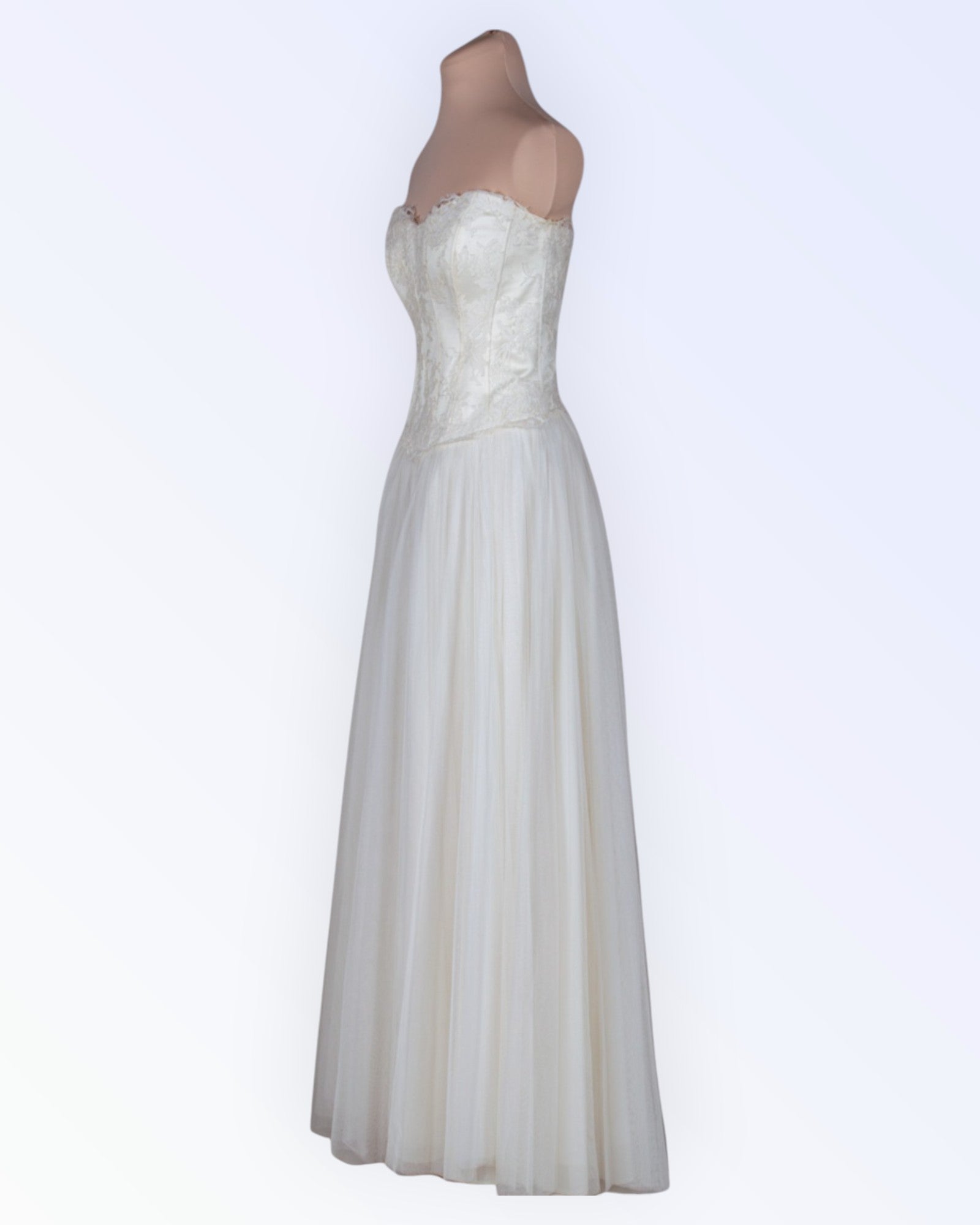 Romantic wedding dress with a fluffy tulle skirt. The corset part with a heart-shaped neckline is made of exclusive French lace.