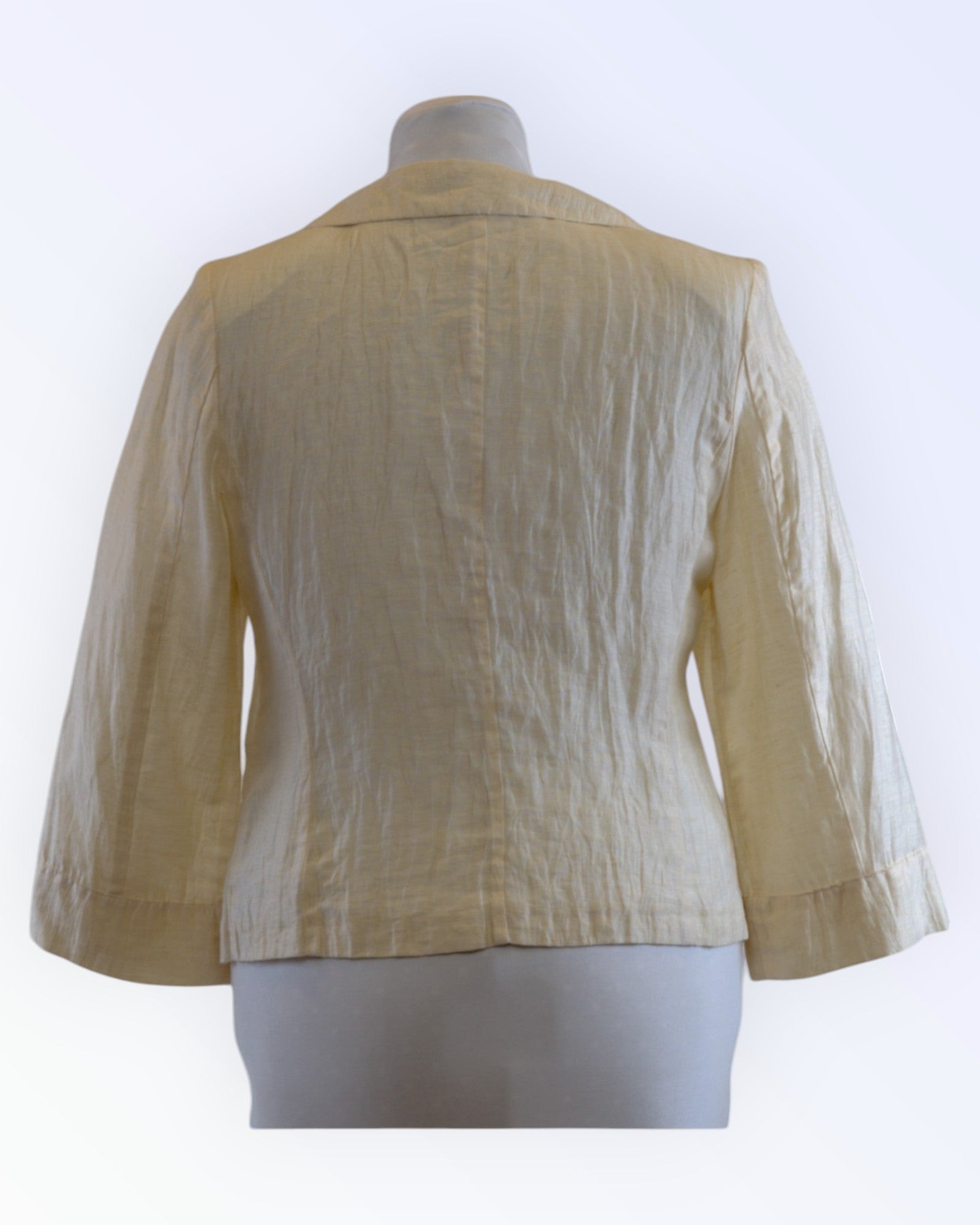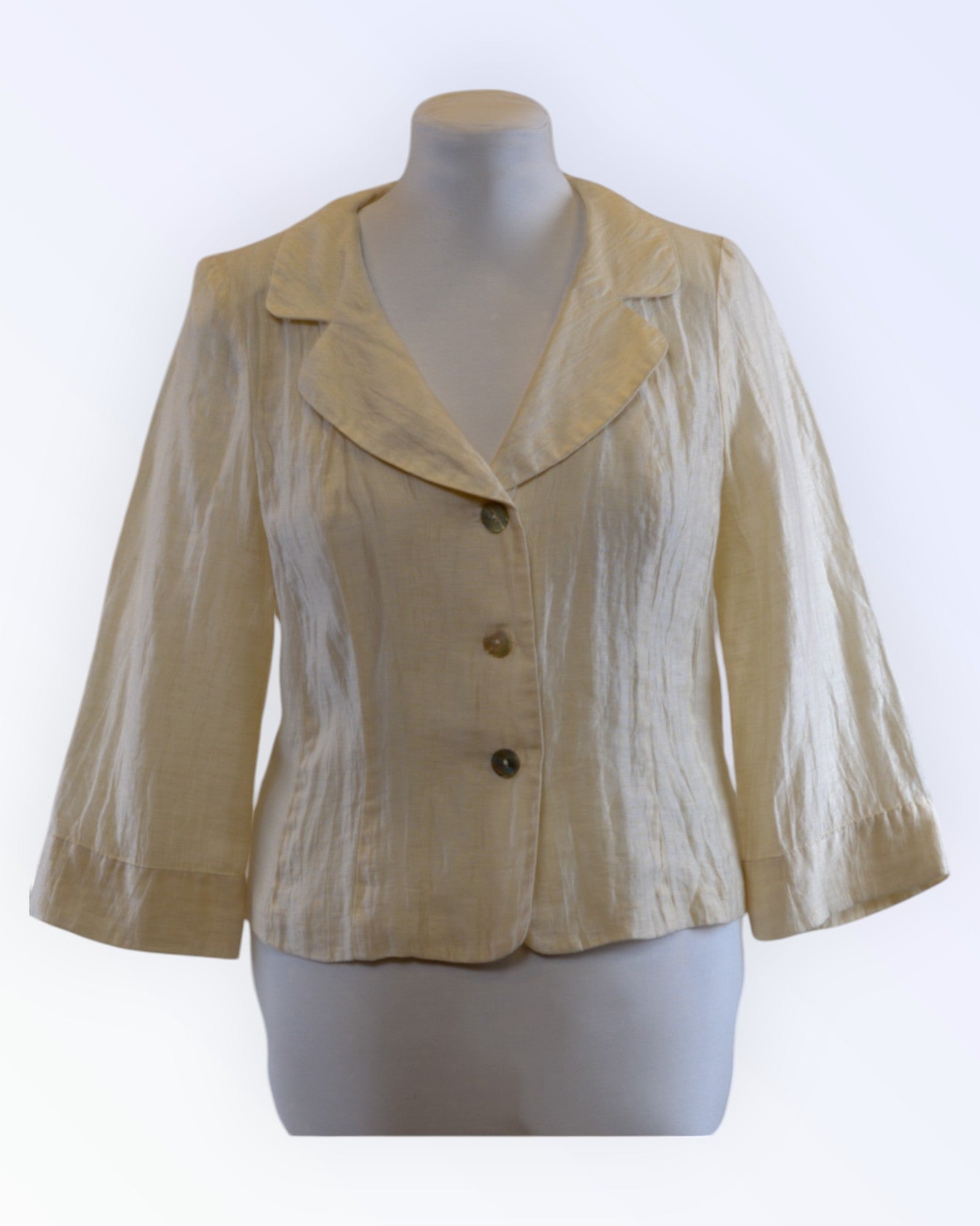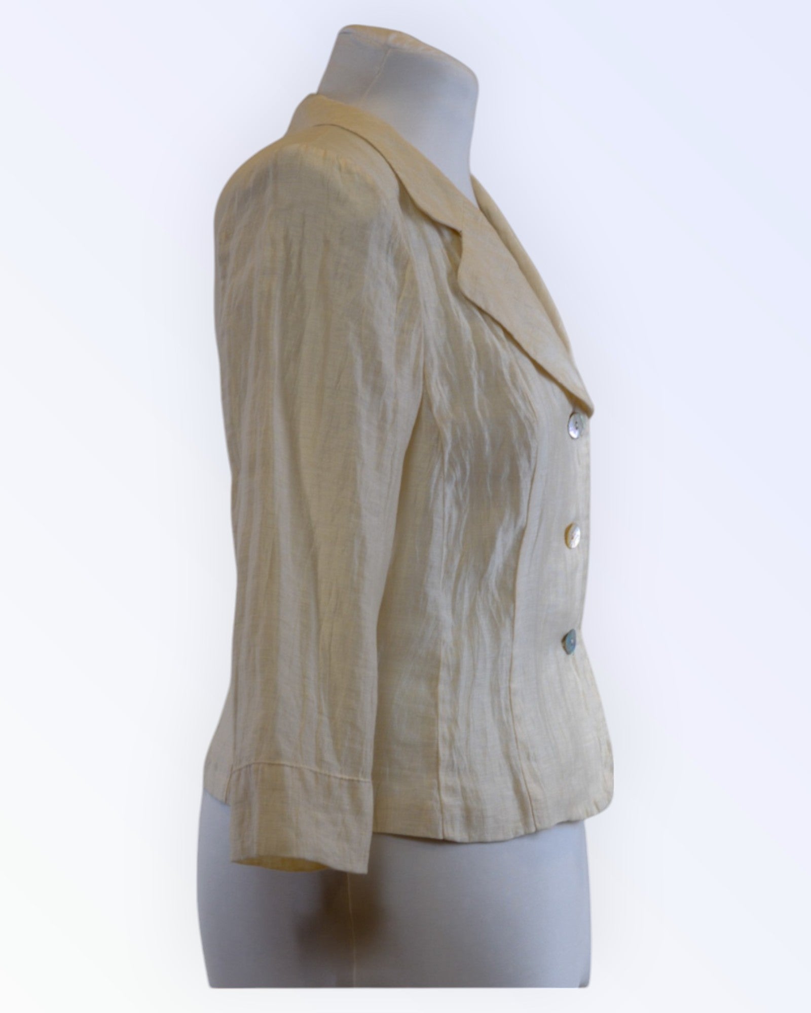 Cream colored formal jacket with lapel collar. A good addition to a formal outfit.