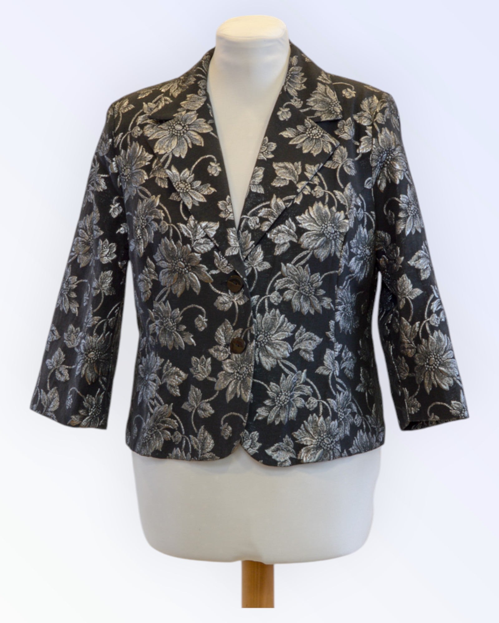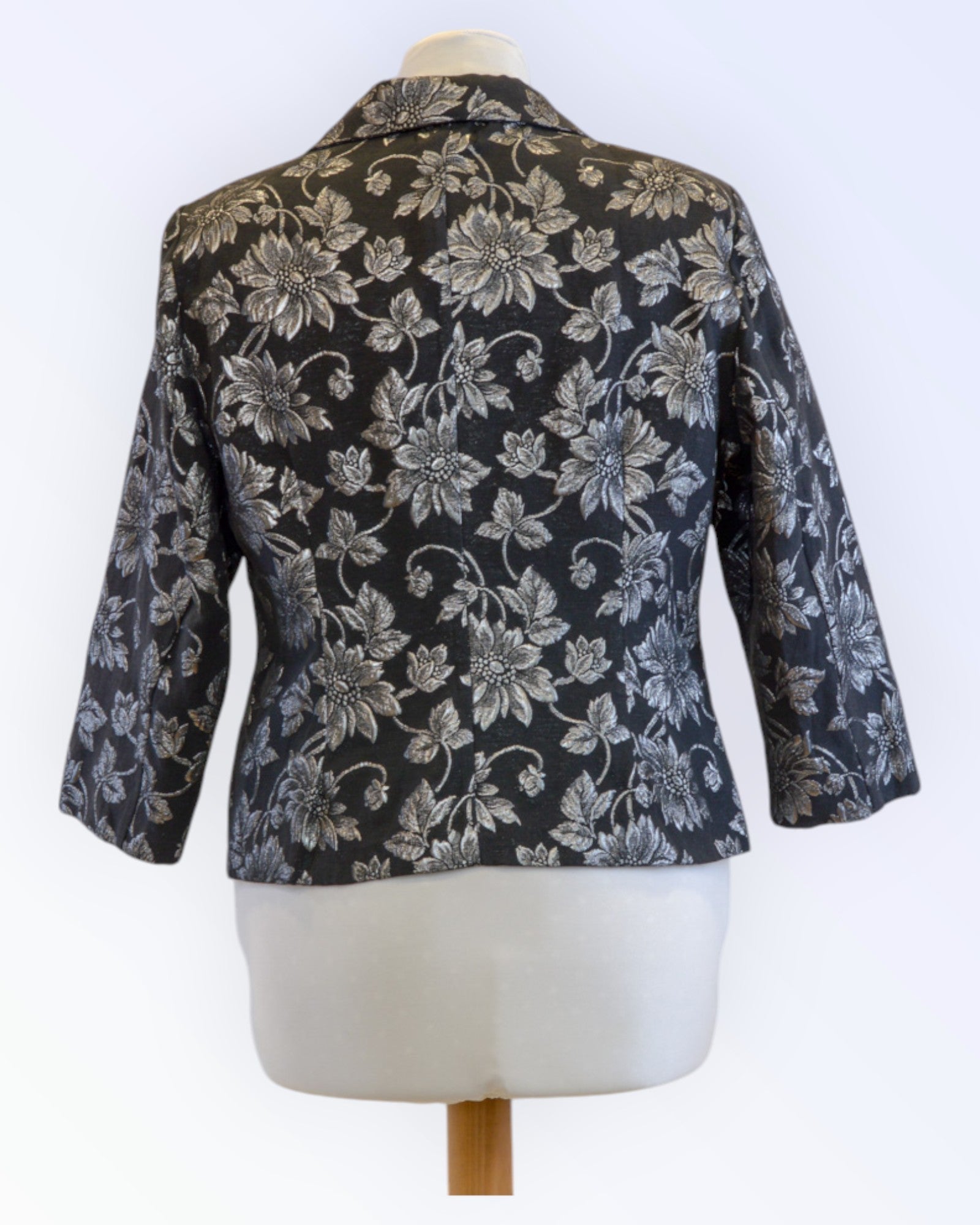 A formal jacket with a lapel collar made of brocade fabric. A good addition to a formal outfit.