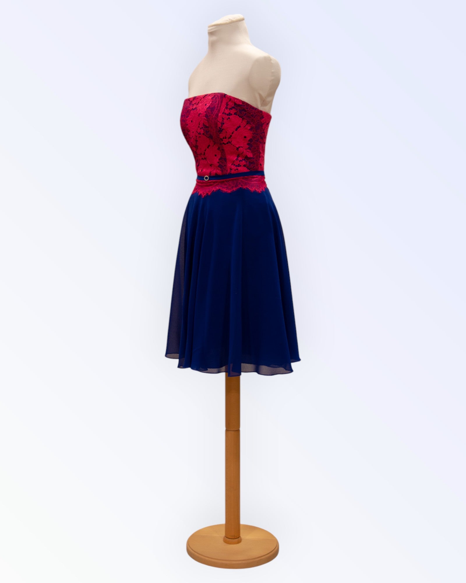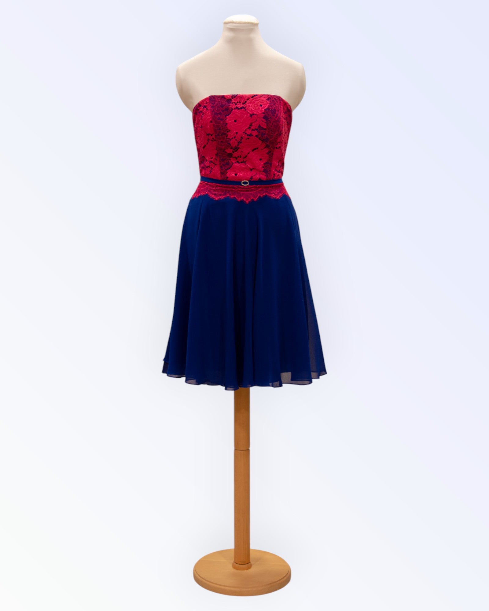 Two-tone cocktail dress with a chiffon skirt and a belt with a glittering buckle.