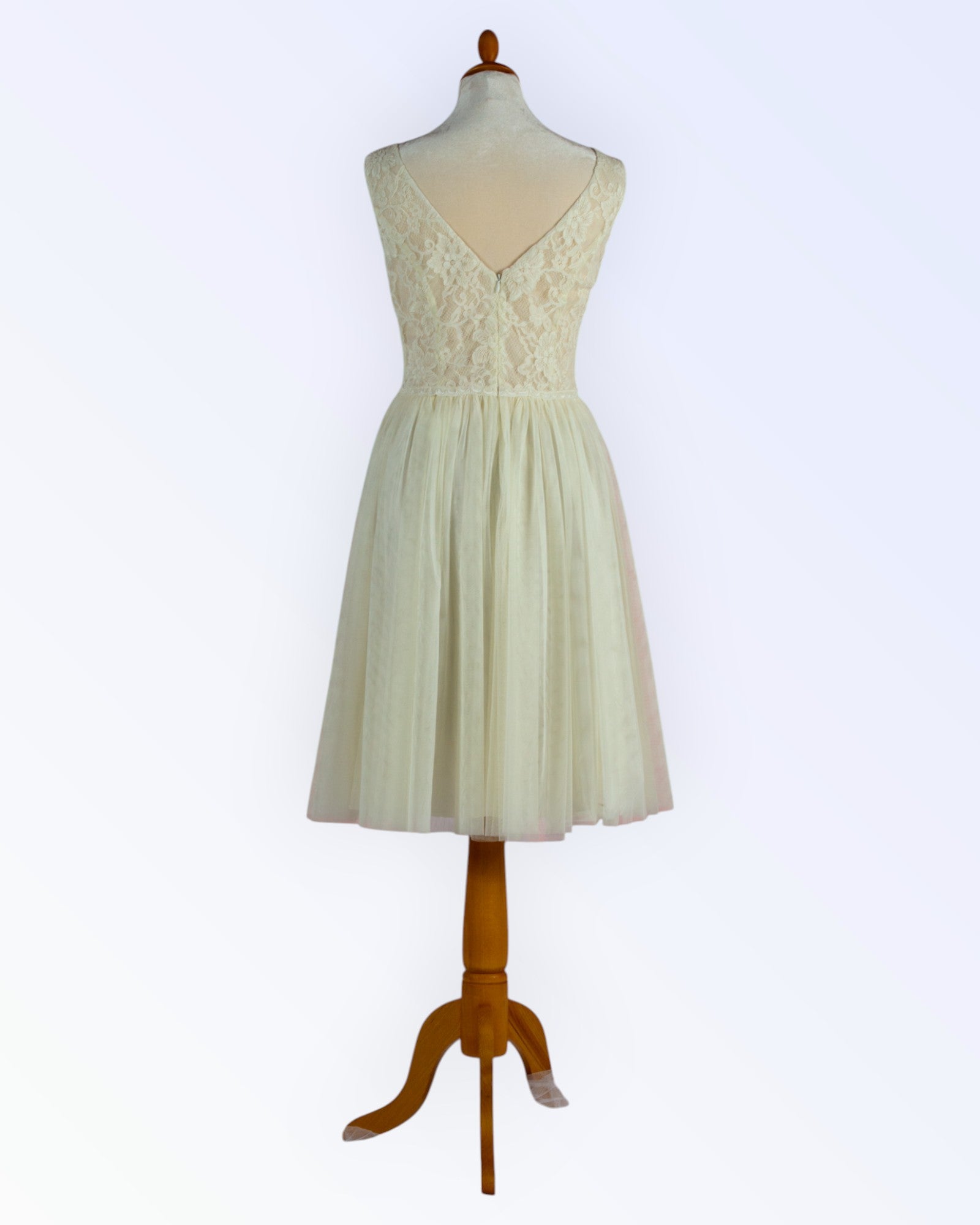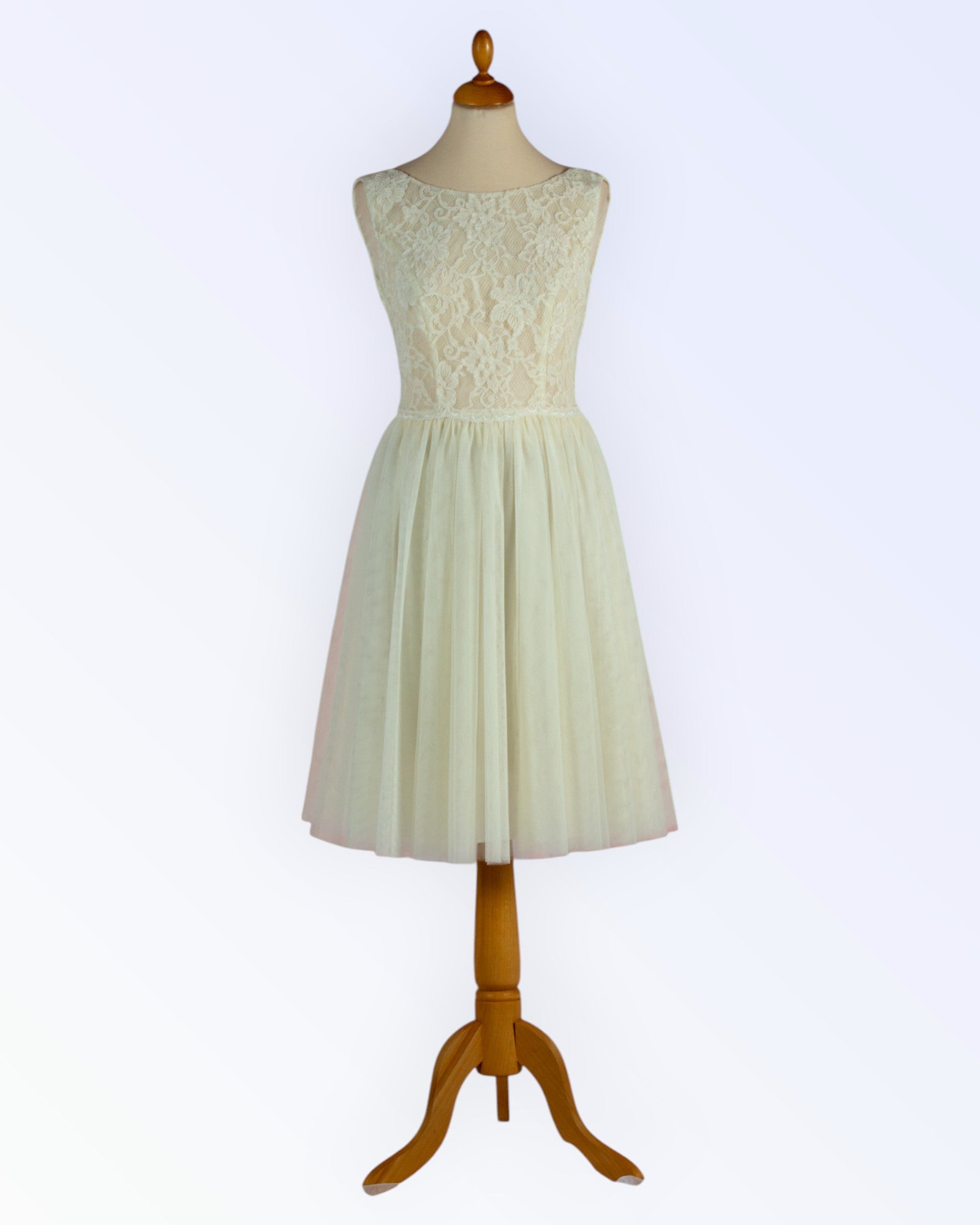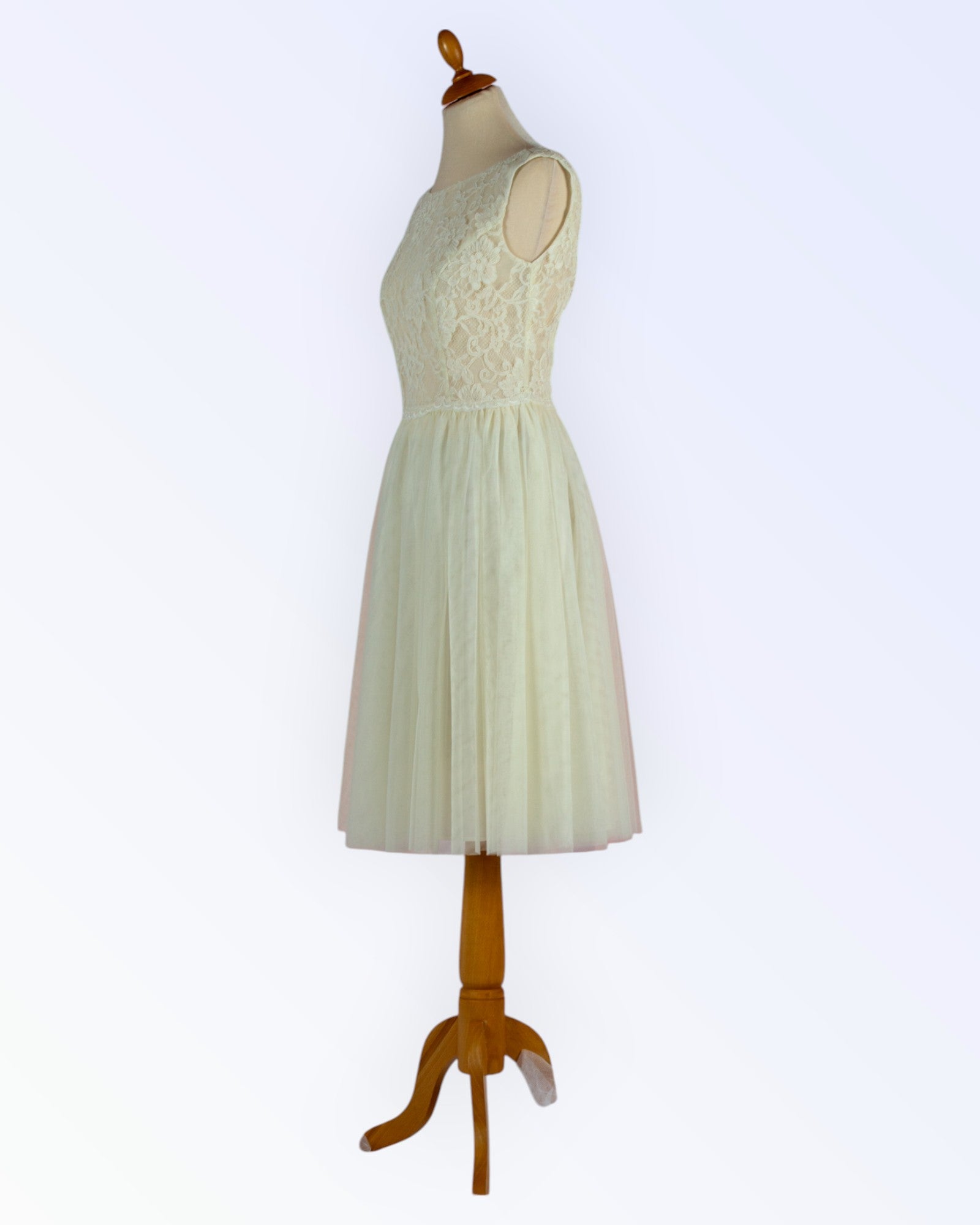 A small off-white dress made of lace and soft tulle with a corded hem.
