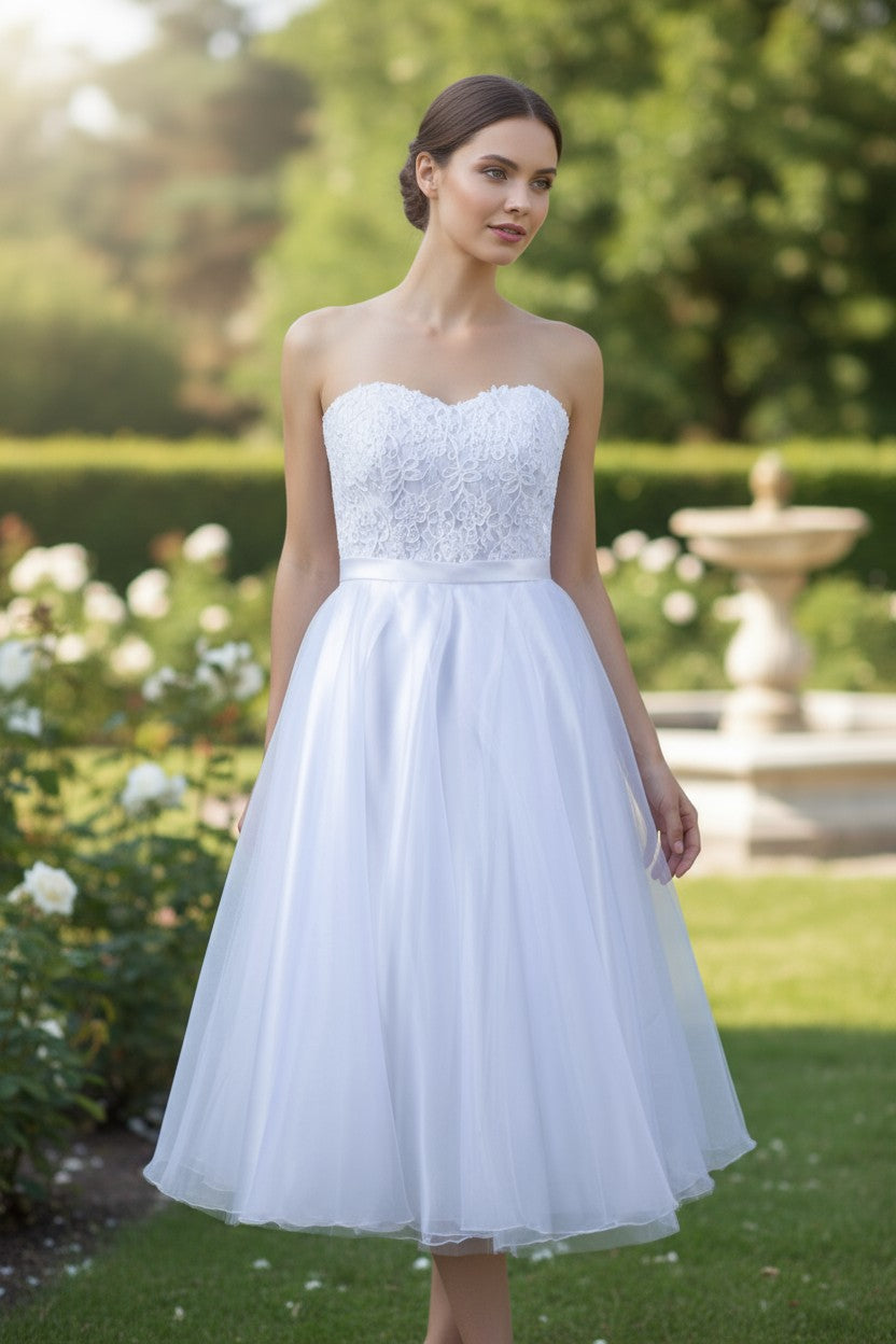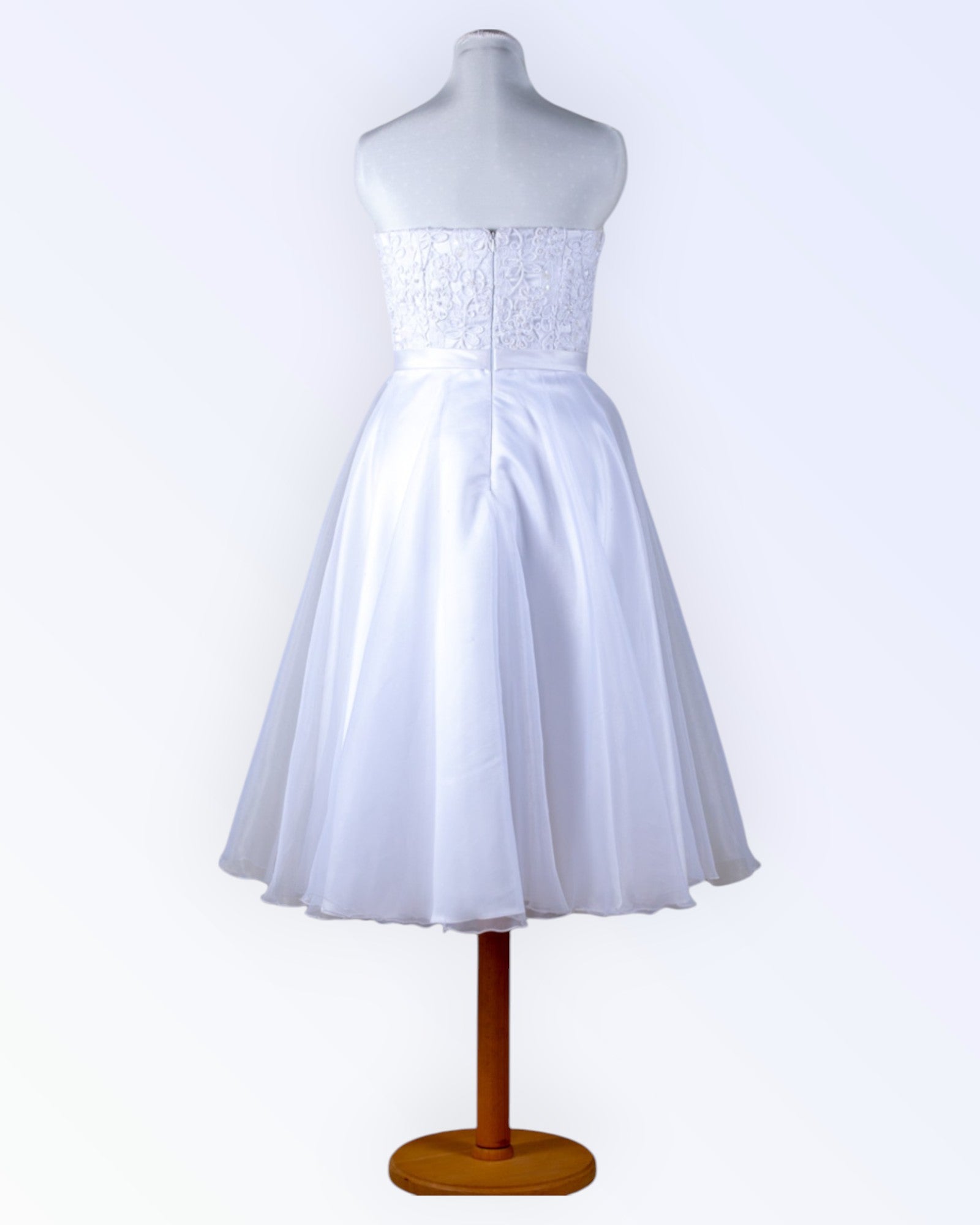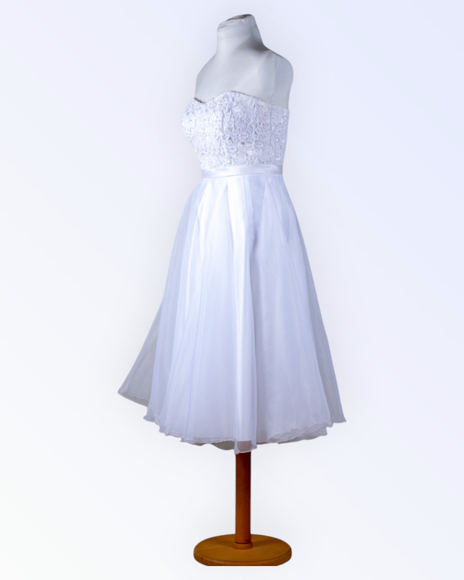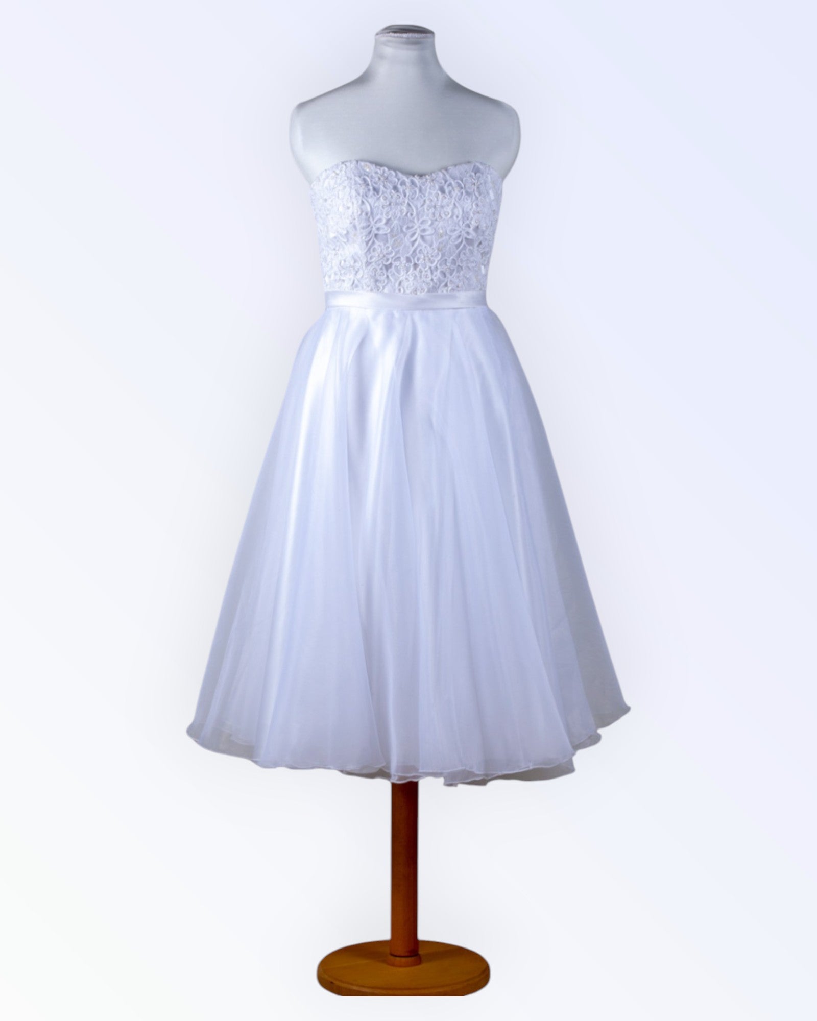 White dress with a fluffy organza skirt and pearl lace corset. Also suitable as a wedding dress.