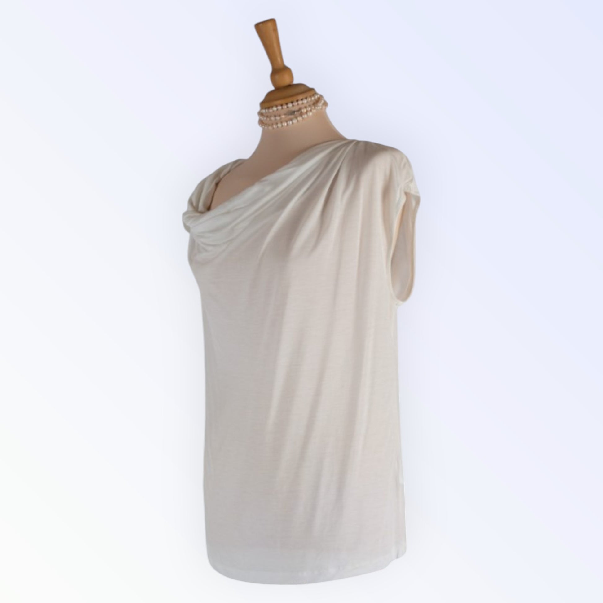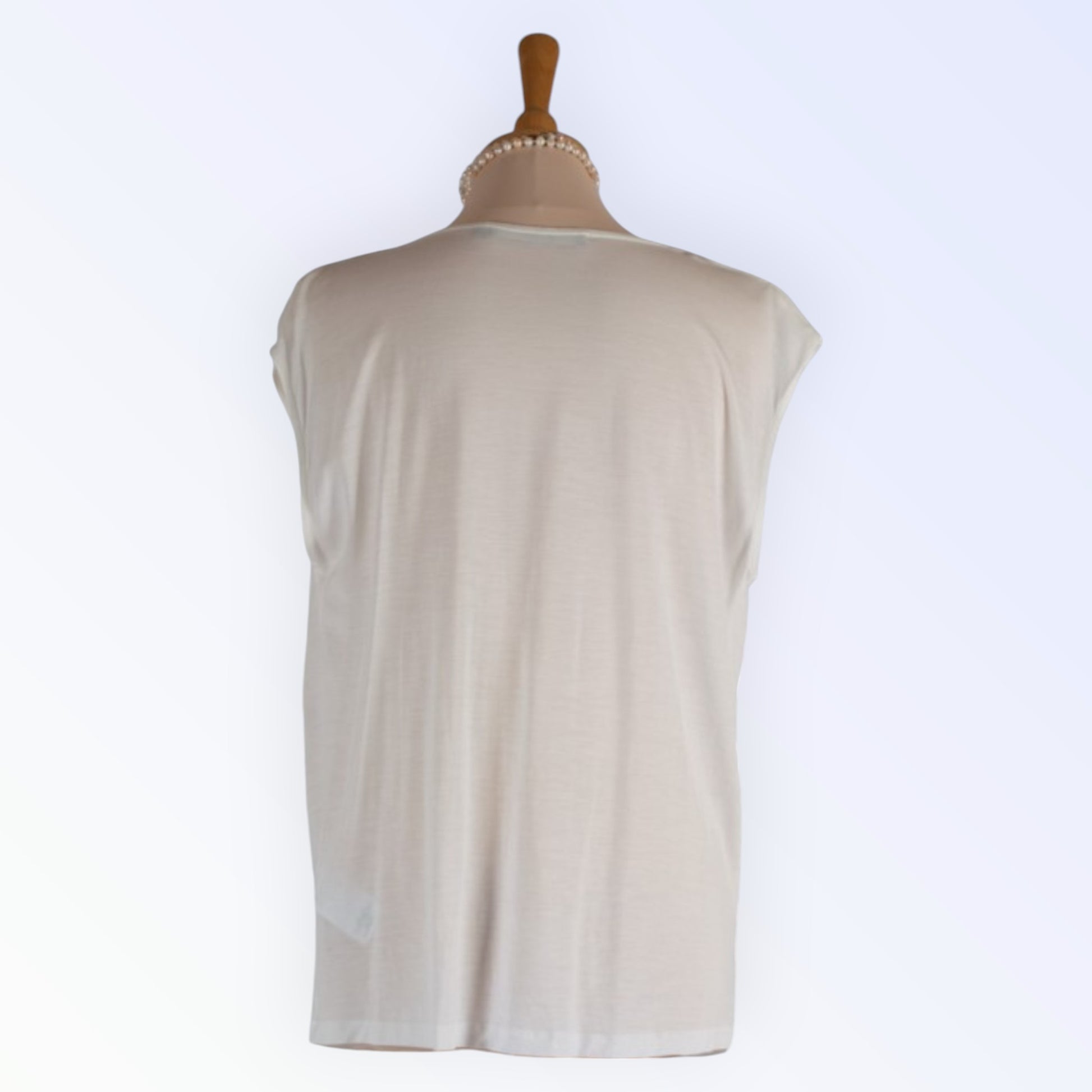 A loose-fitting summer top made of soft off-white jersey with a plunging neckline.