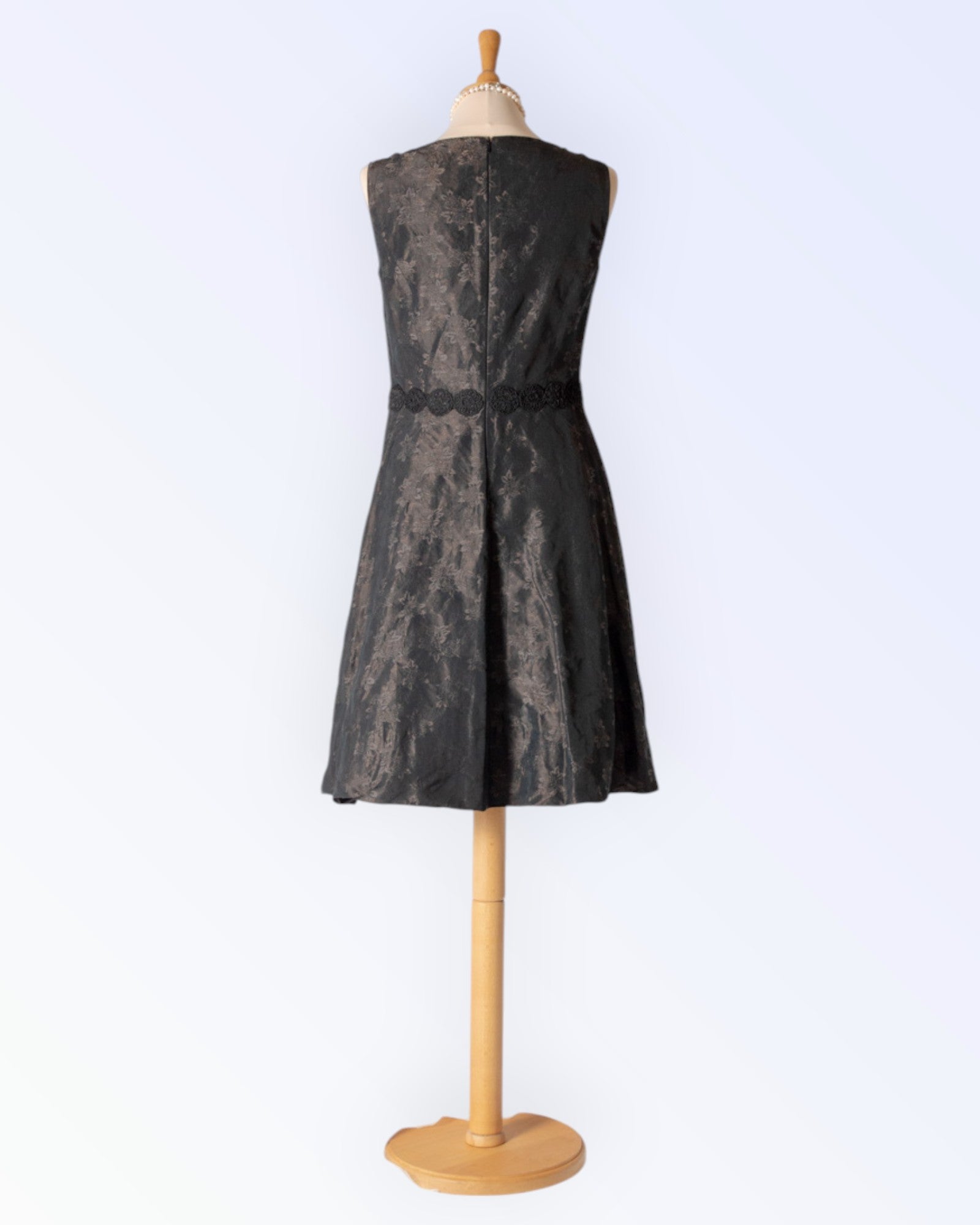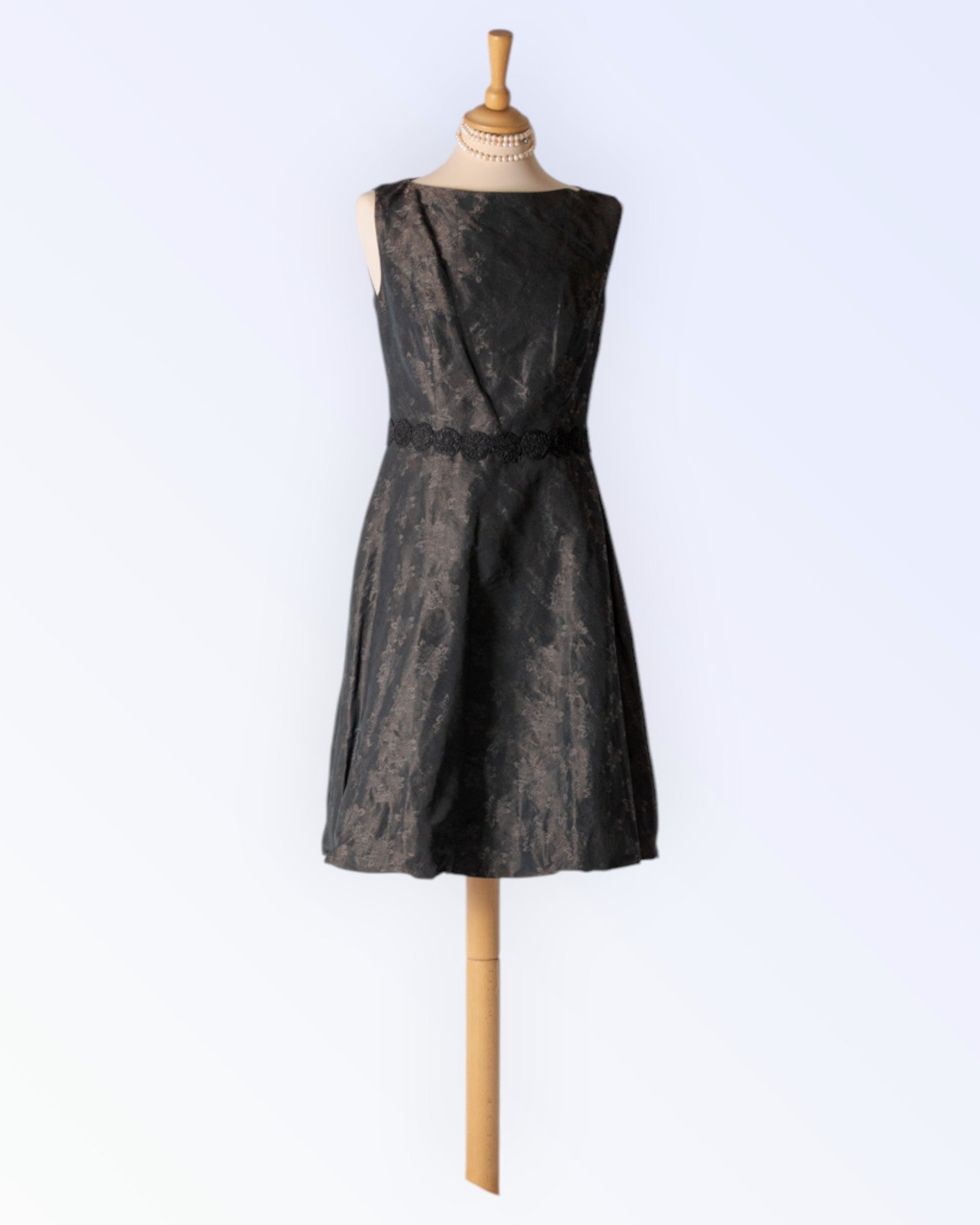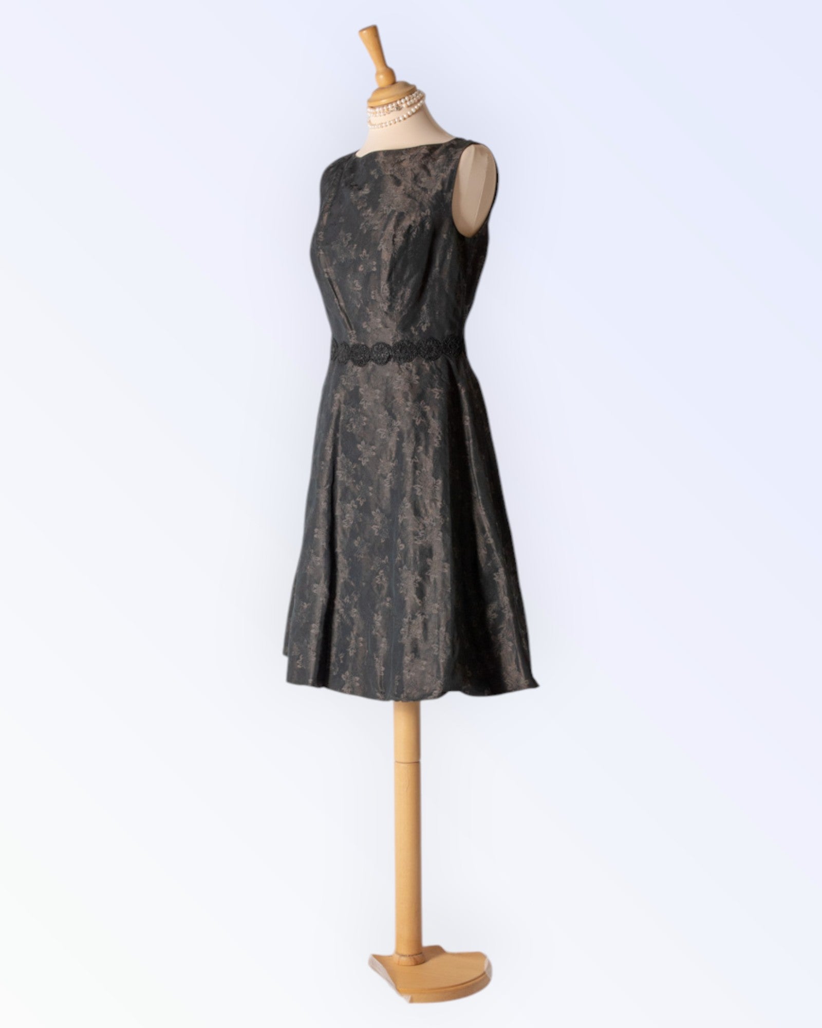 Dark brown cocktail dress made of taffeta with metallic threads.