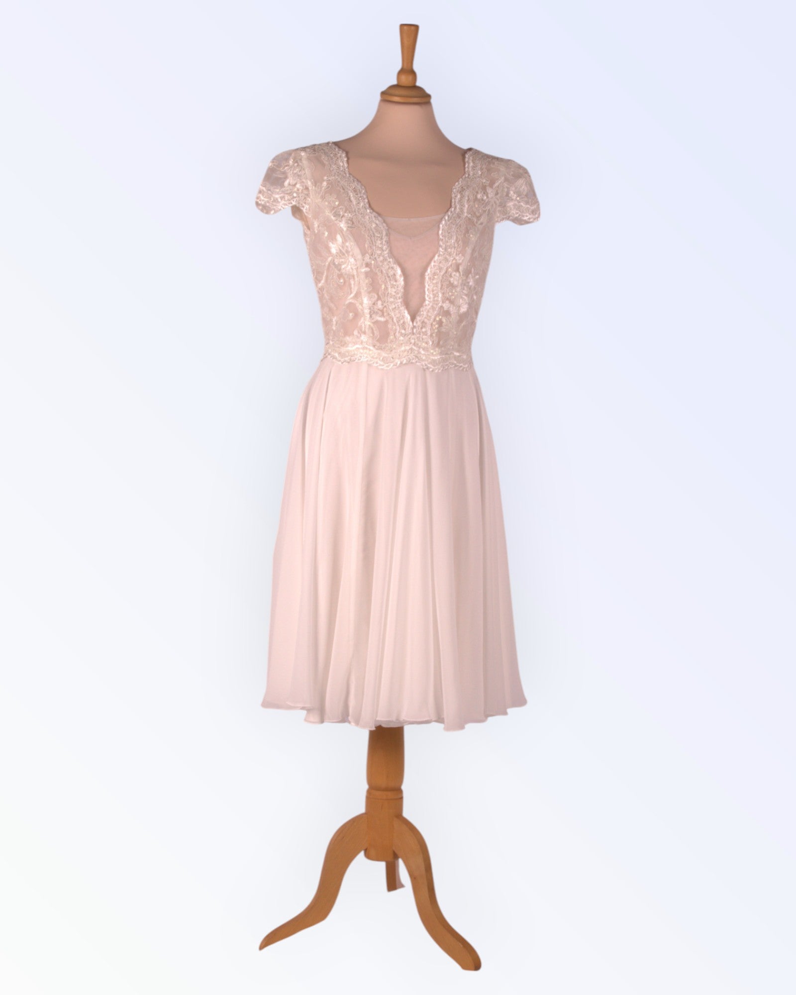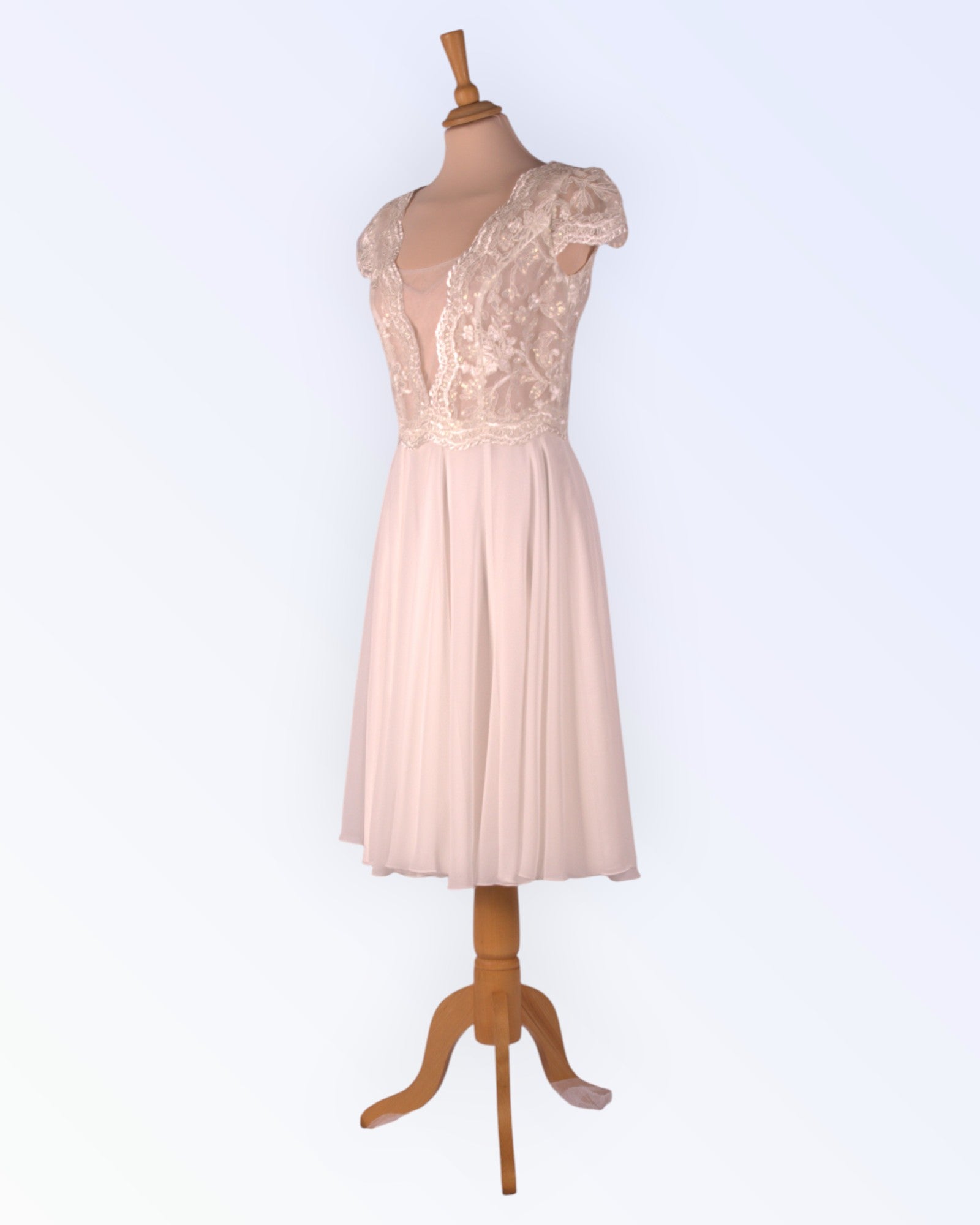 A little dress made of lace and chiffon decorated with sequins. Also suitable as a wedding dress.