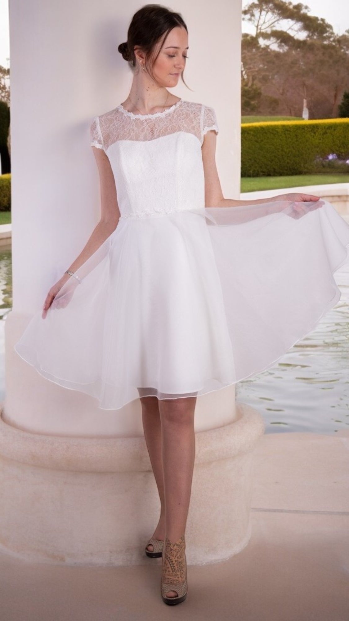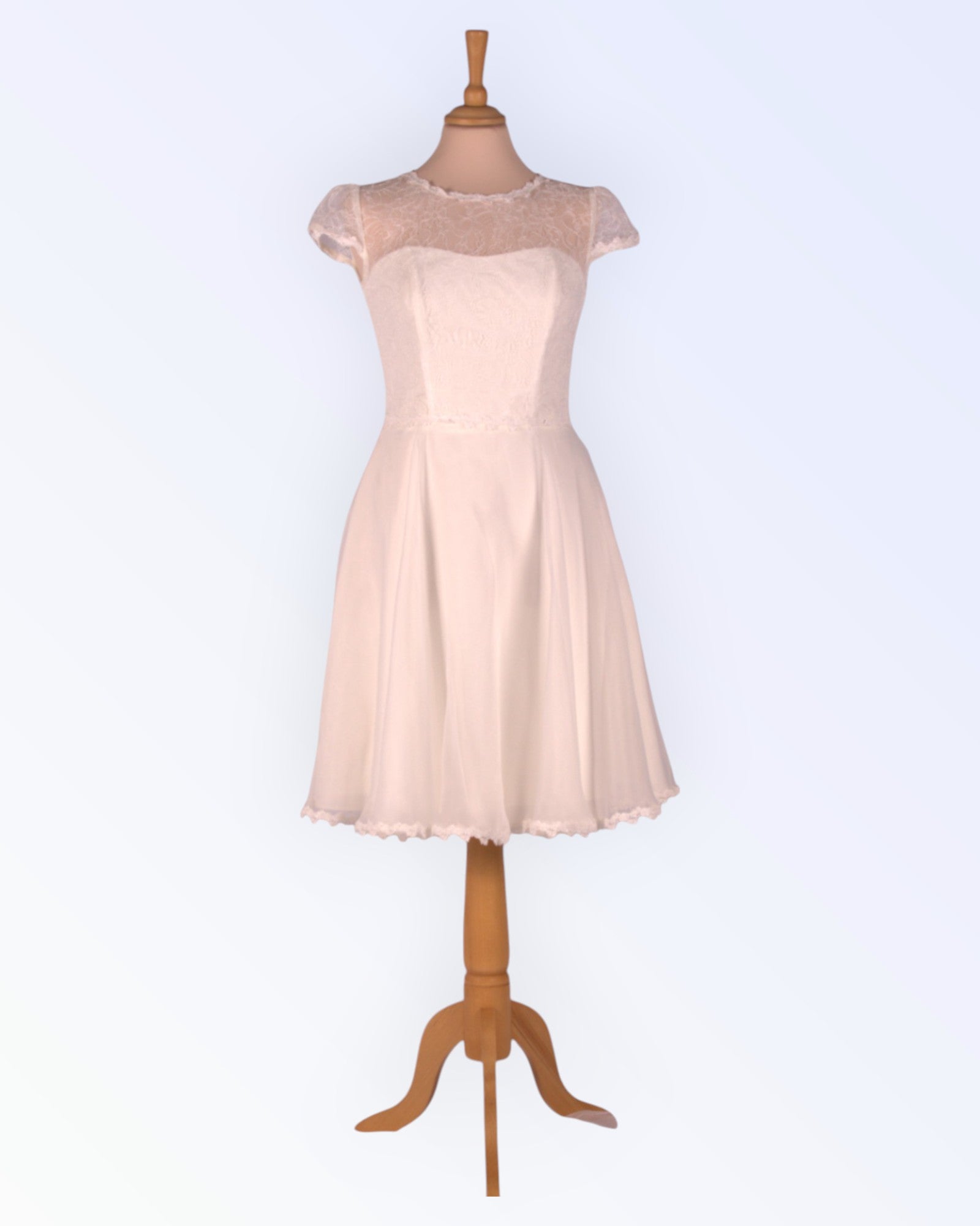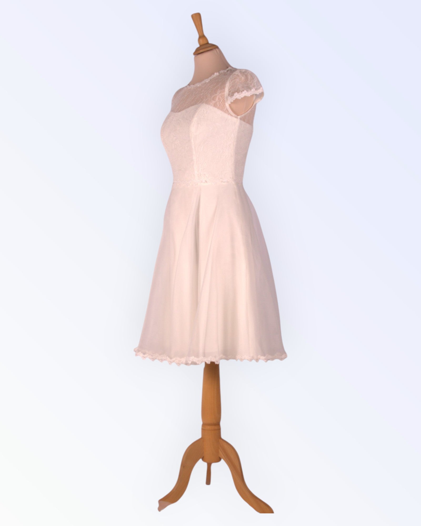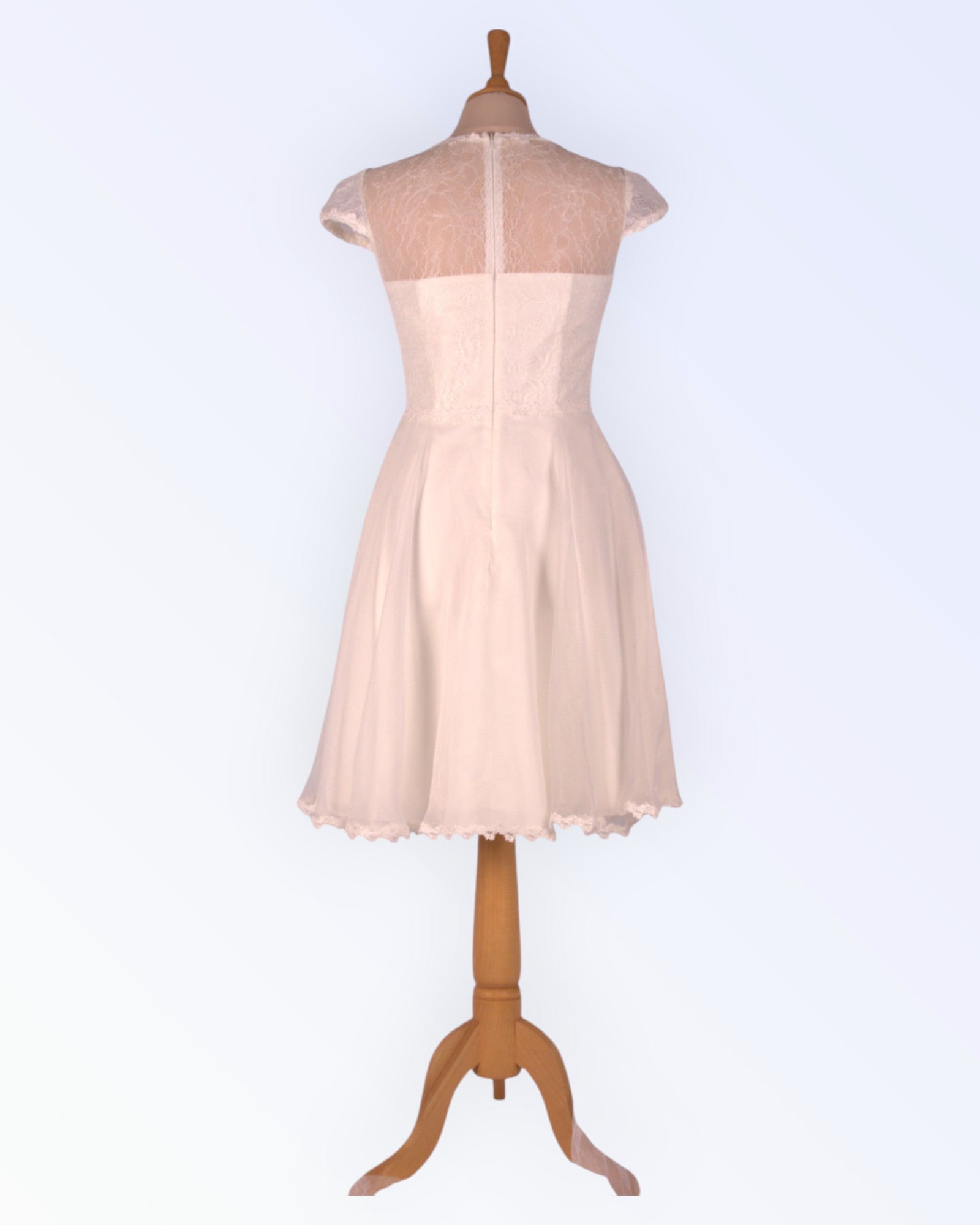 A small off-white dress with an organza skirt and lace bodice. Also suitable as a wedding dress.