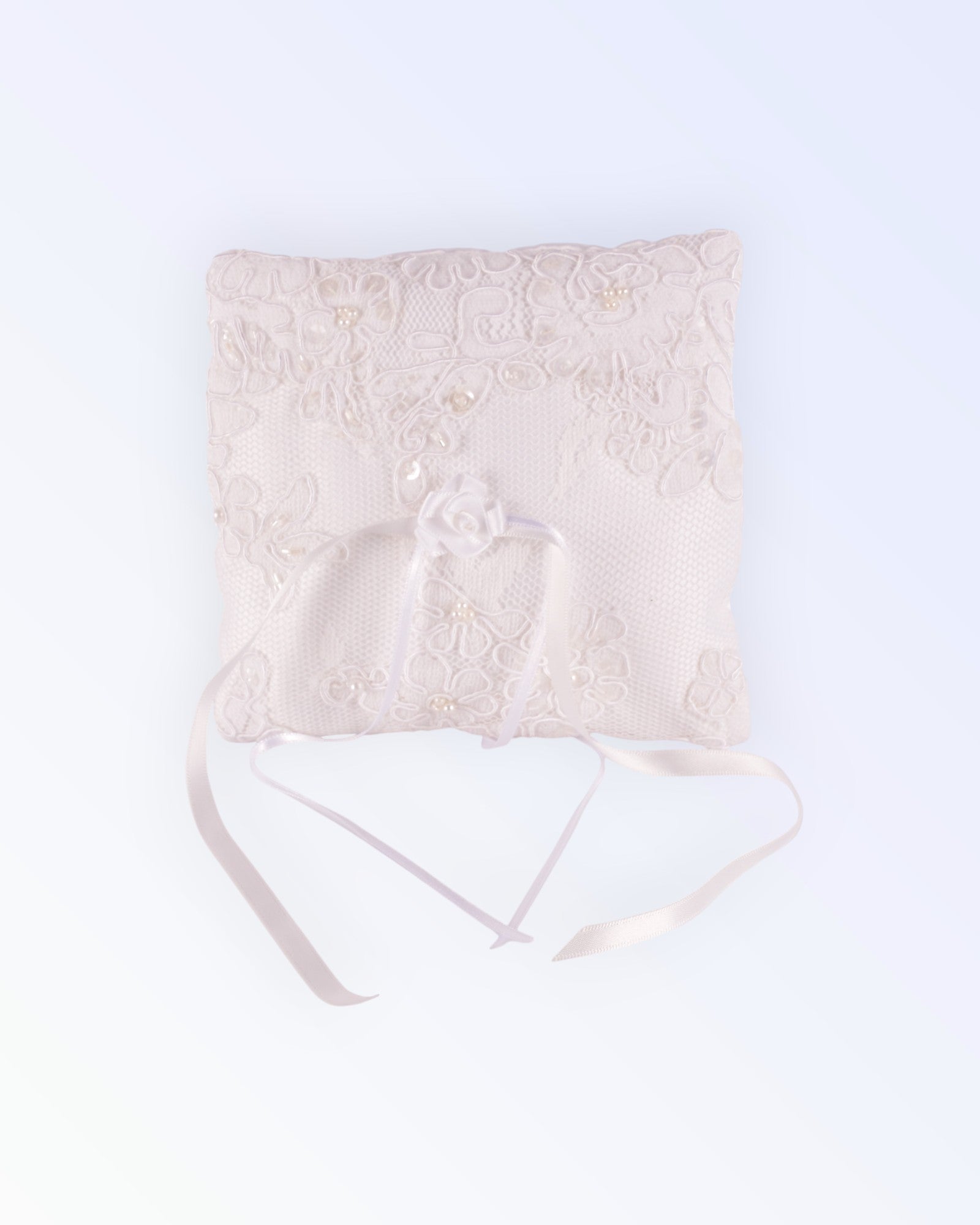 White satin lace covered ring pillow. Decorated with pearls, sequins, a small rose and satin ribbons.