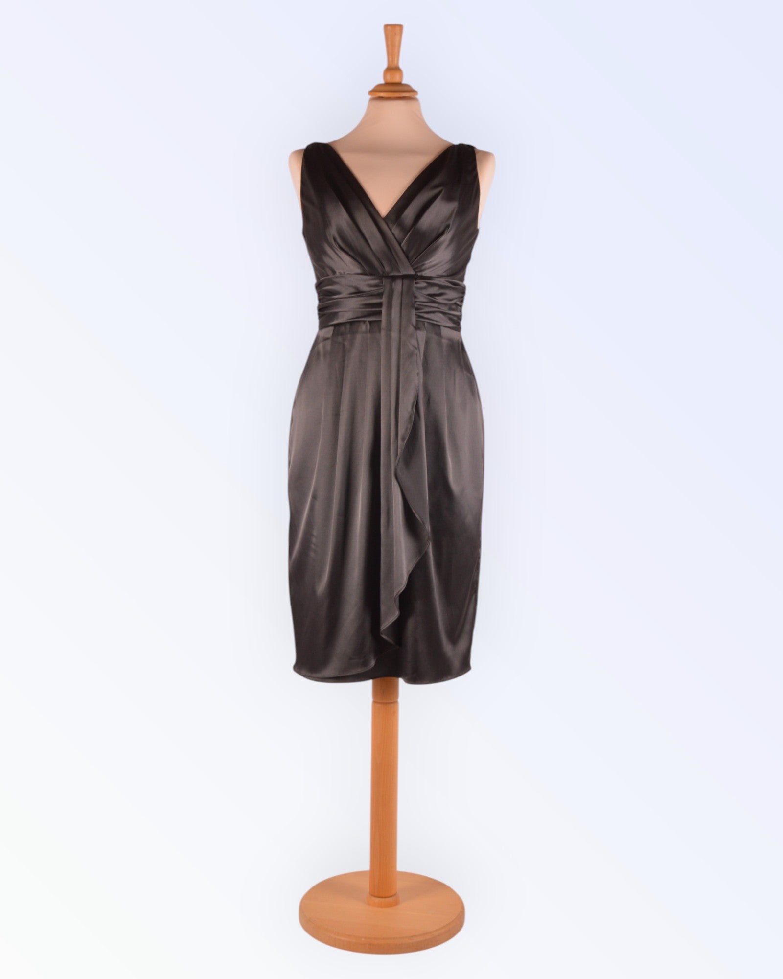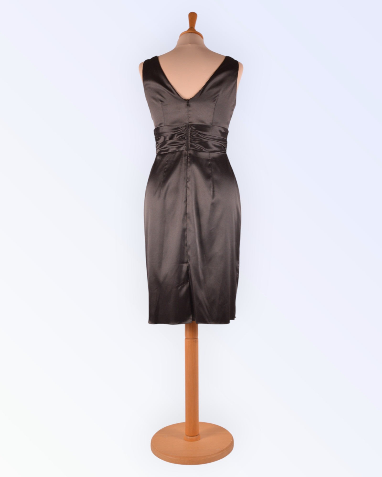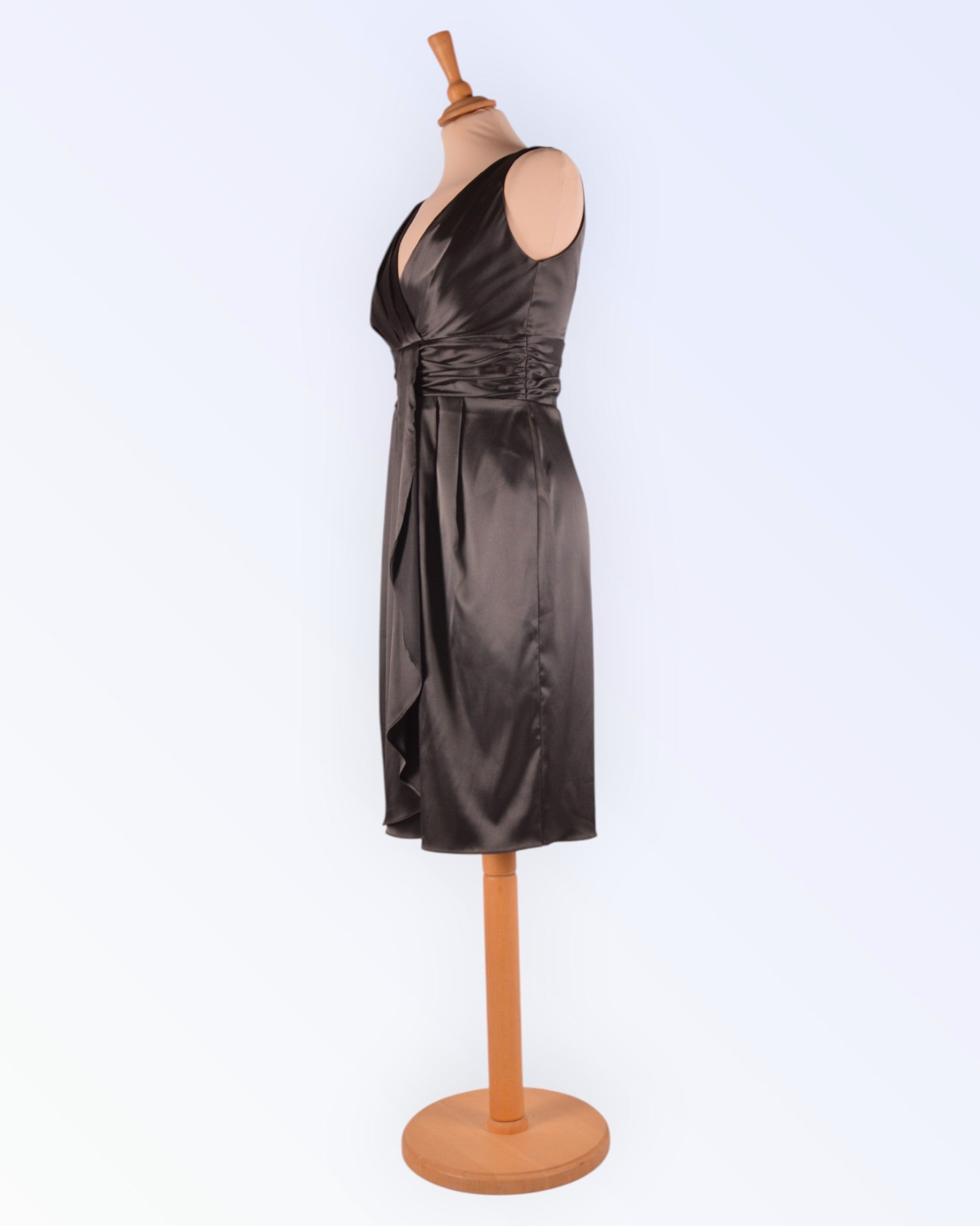 Tummanharmaa satiininen cocktailmekko epäsymmetrisellä mallilla. Vuorattu tuote.