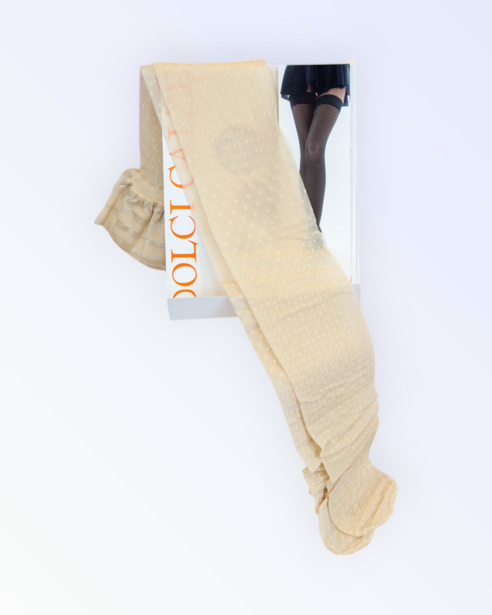 Õhukesed elastsed šampanjatooni rombimustriga sukad. Ääres 5 cm laiune silikoonkummiga pits