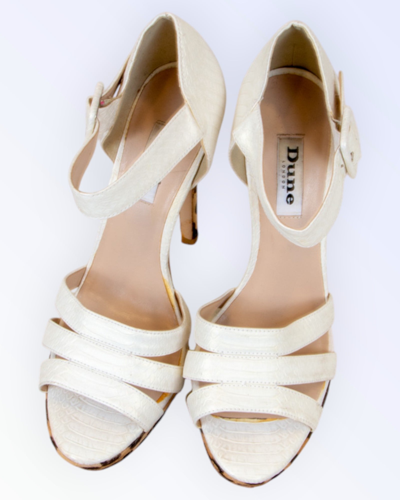 Dune-valkoiset avoimet kesäkengät. Korko ja koropinta on päällystetty karvaisella leopardinnahkajäljitelmällä.