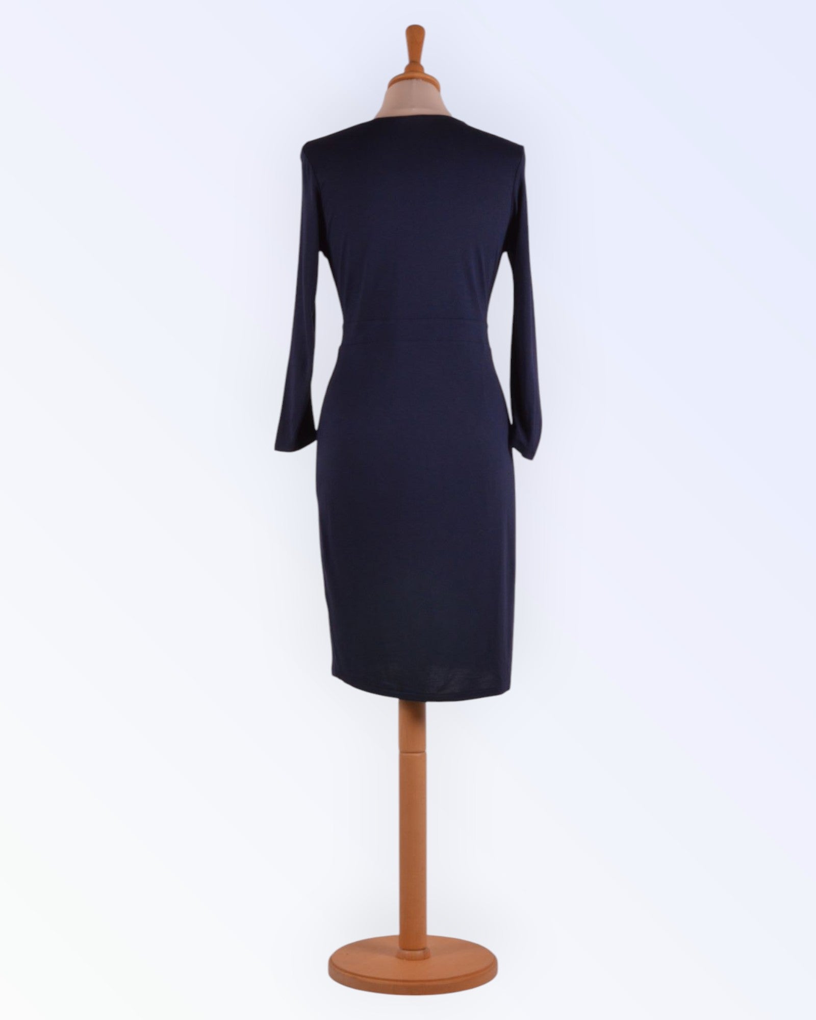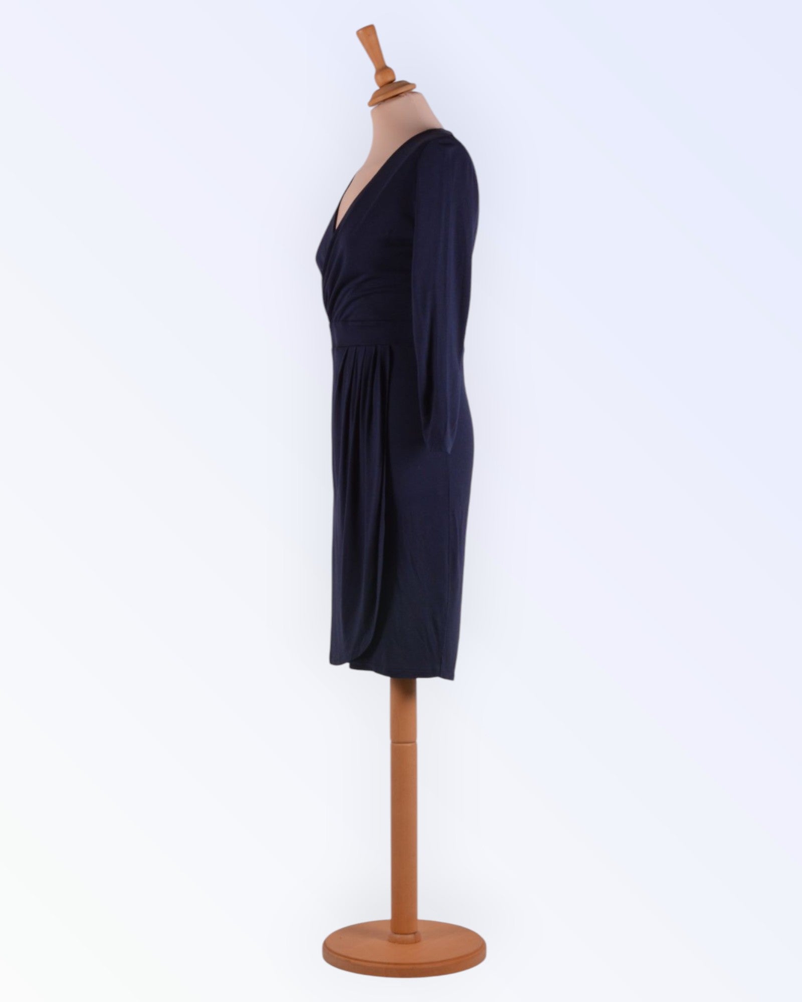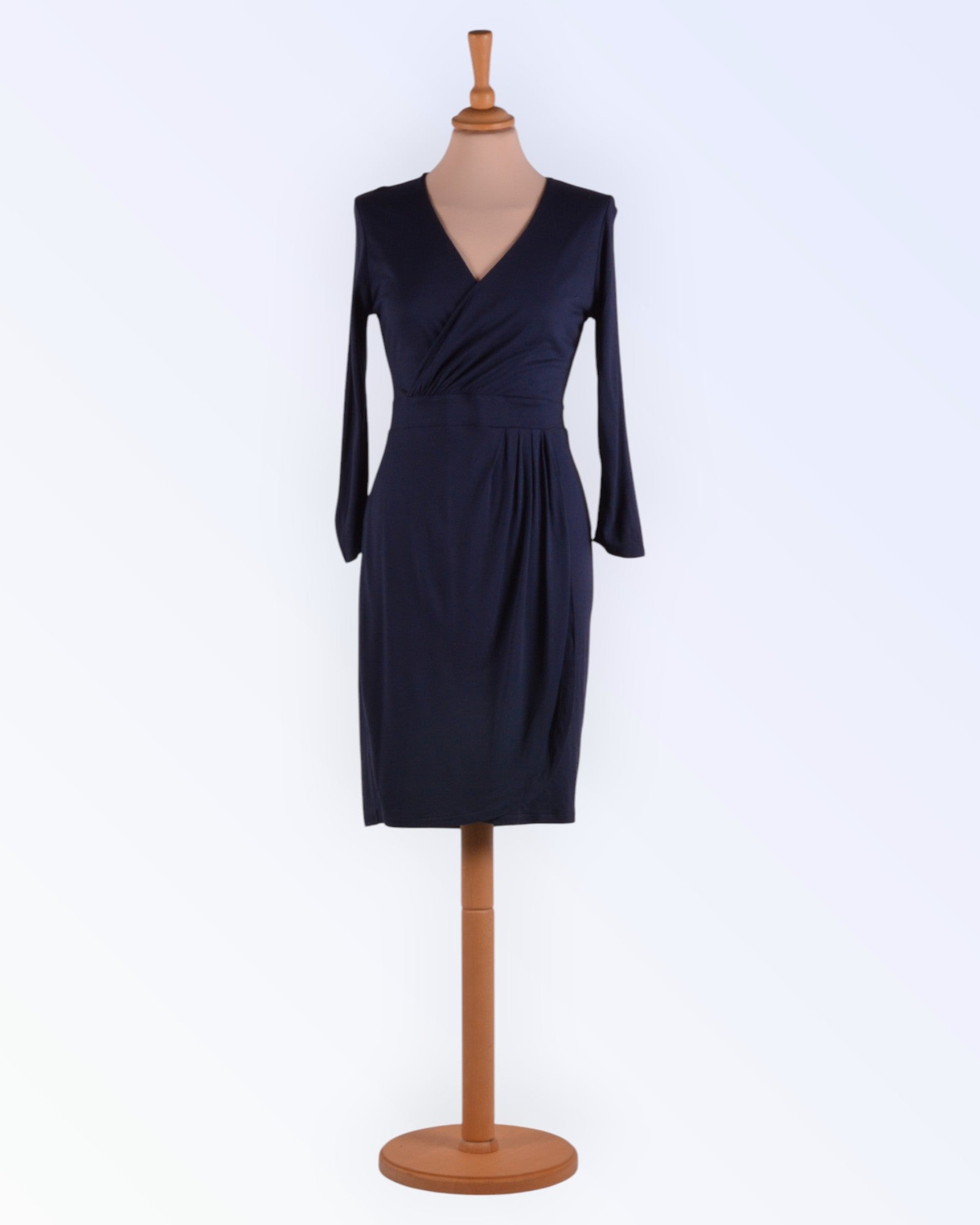 Epäsymmetrinen mekko tummansinisestä pehmeästä jerseystä. Vartaloa myötäilevä malli. Hyvä mekko mukaan matkalle.
