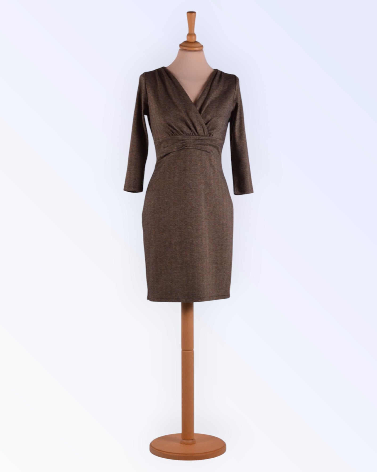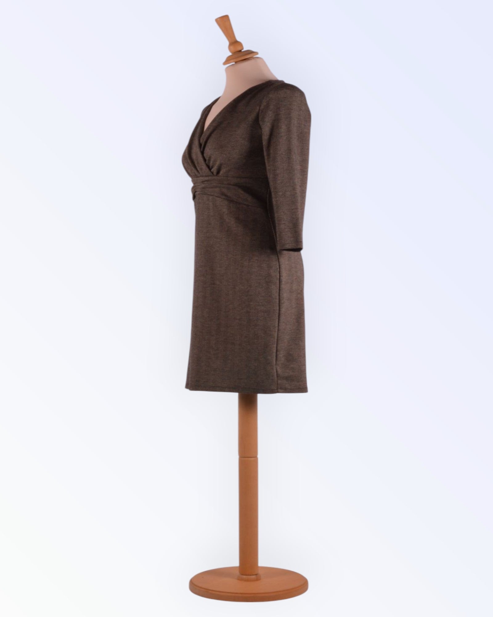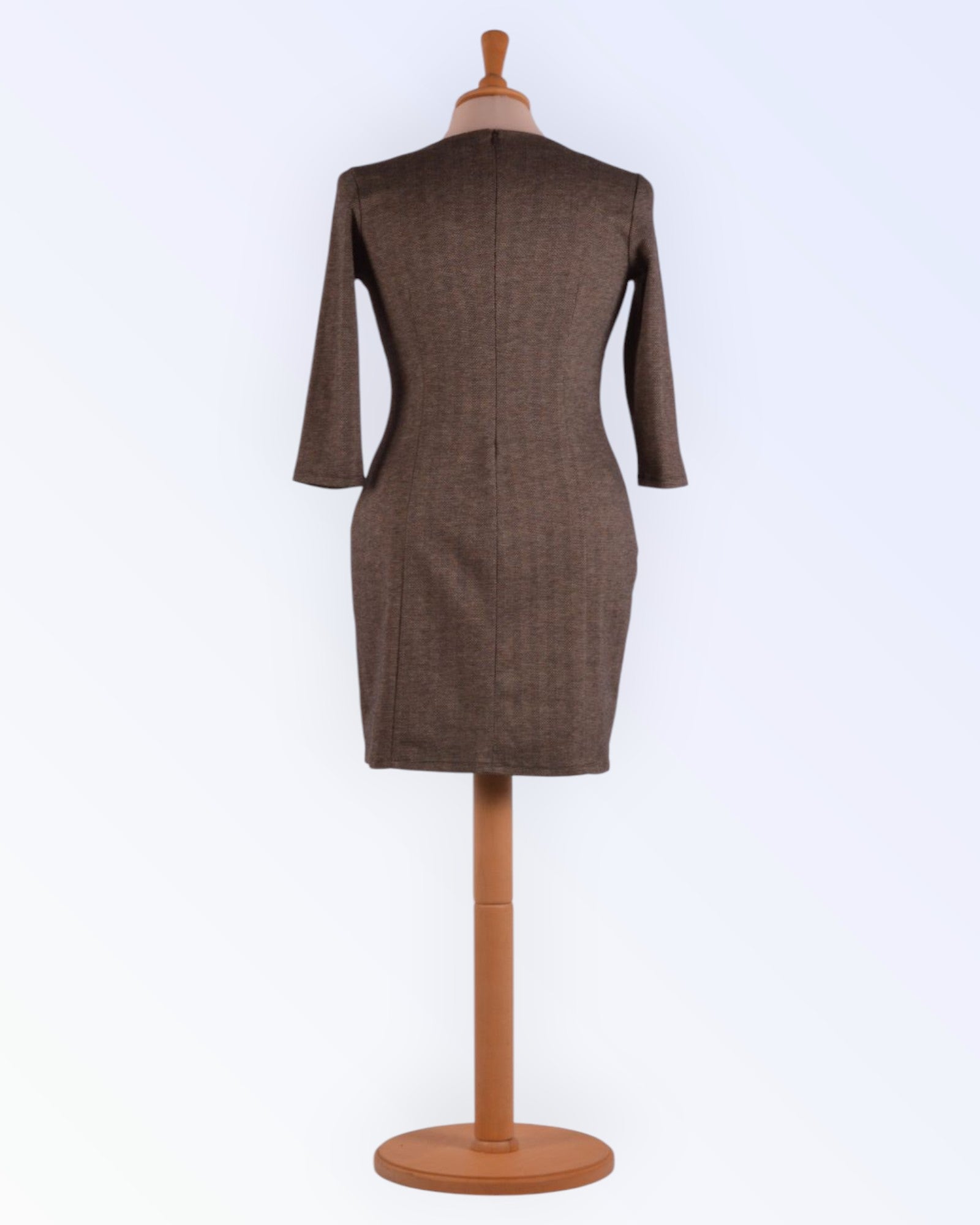 Epäsymmetrinen mekko paksumpaa ruskeaa neulosta. Vartaloa myötäilevä malli. Hyvä mekko mukaan matkalle.