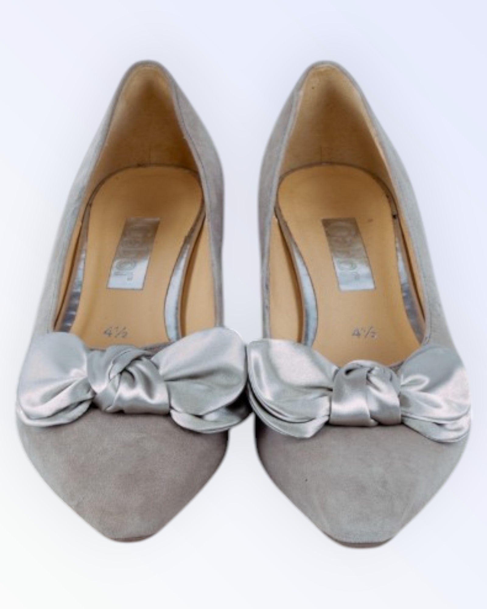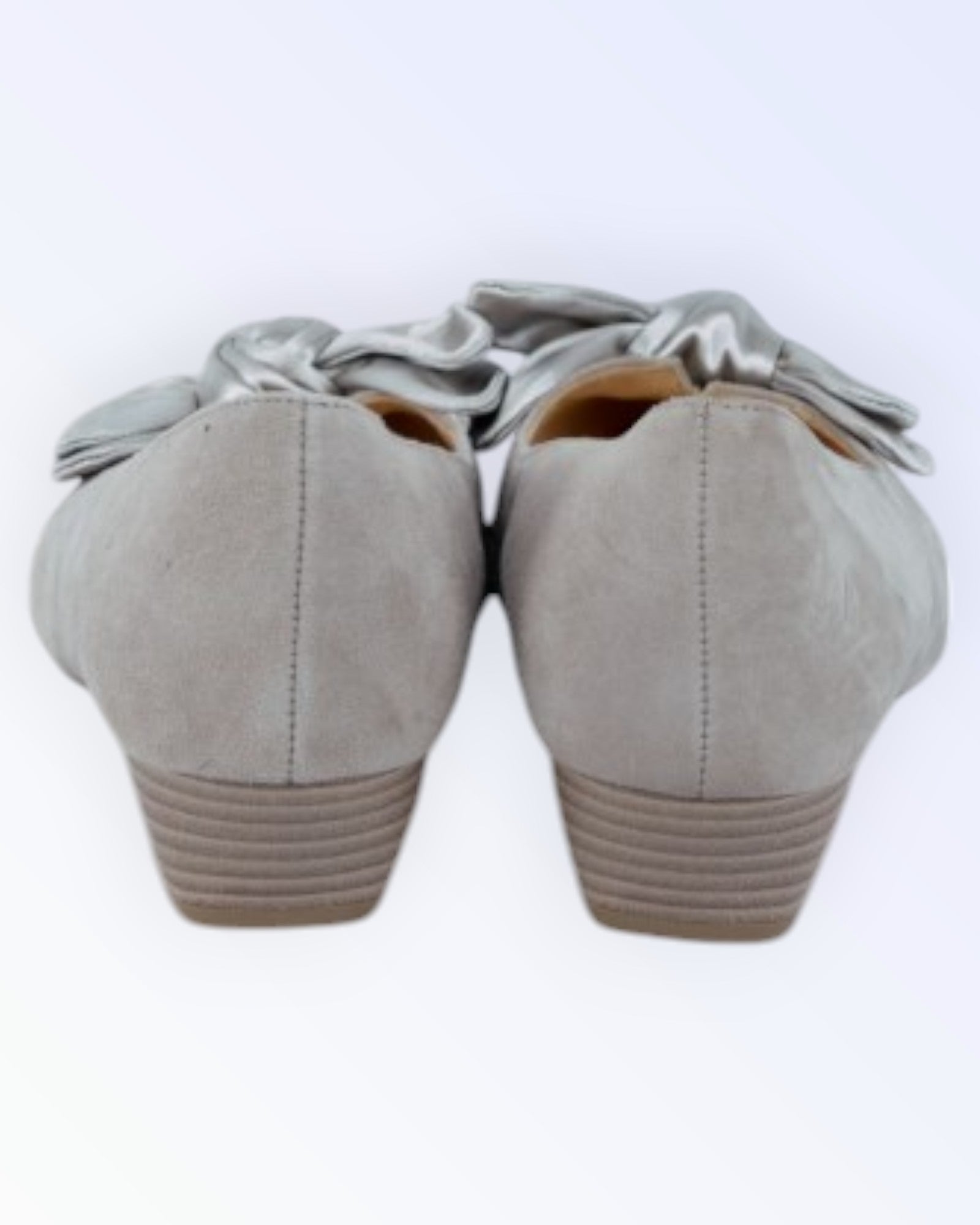 Harmaat säämiskänahkaiset matalakorkoiset kengät.