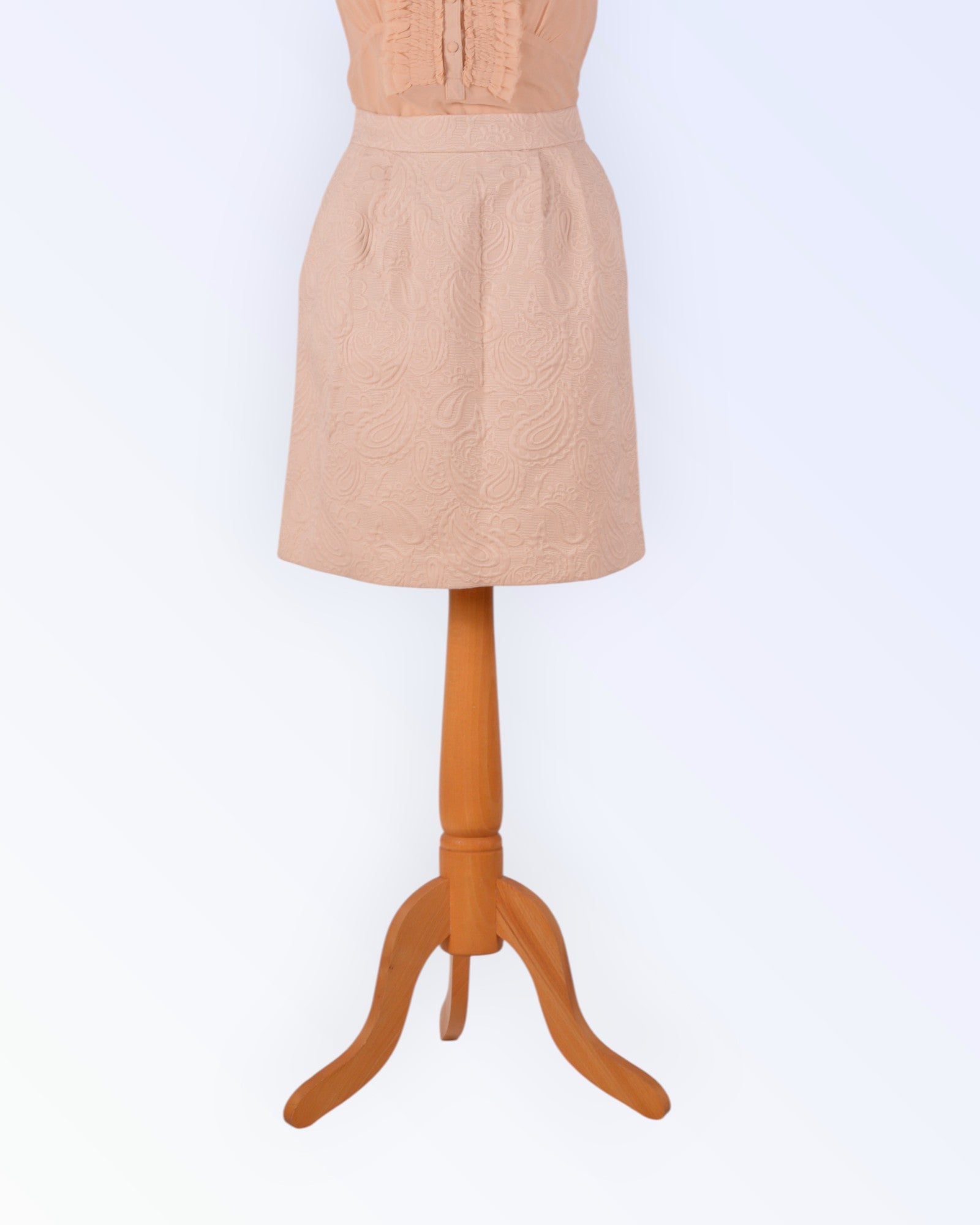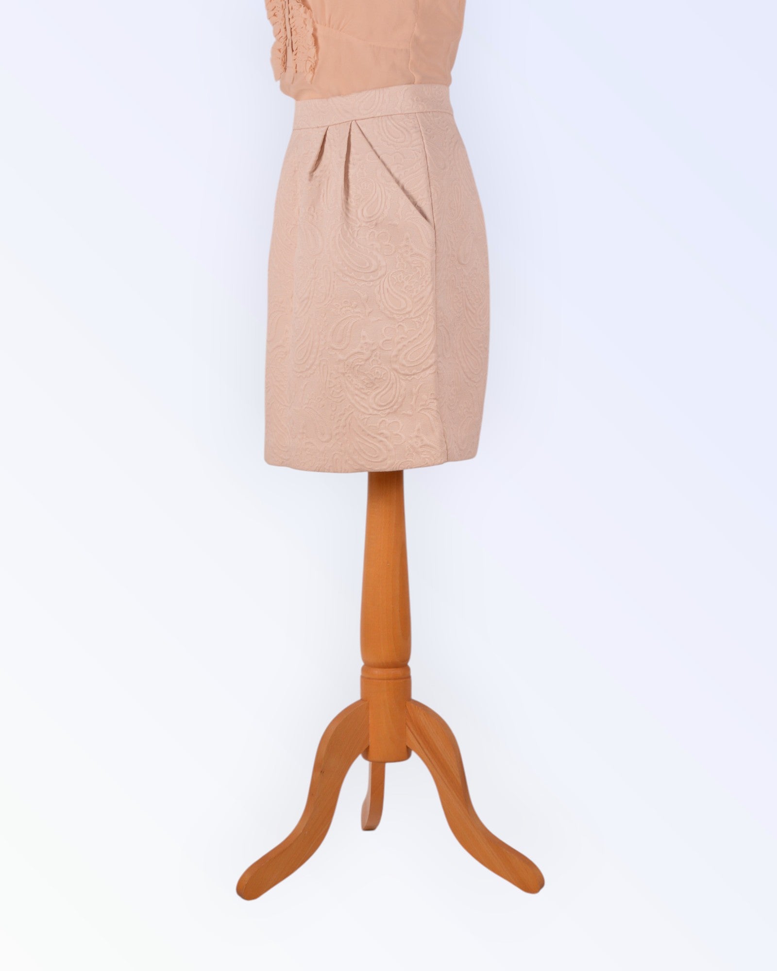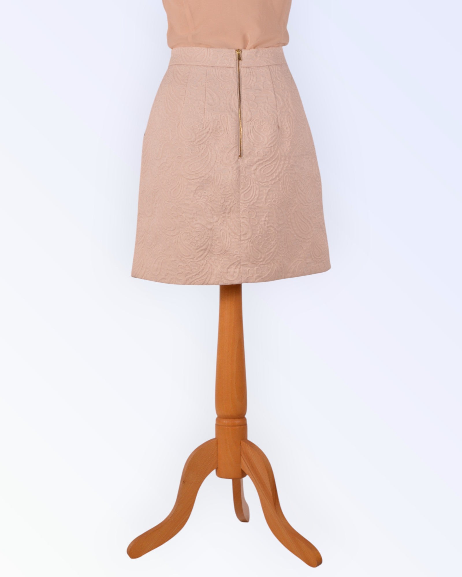 Vaaleanpunainen jacquard-kynähame. Vuorittomassa hameessa on laskokset edessä ja viistot sivutaskut. Takana keskellä saumassa on huomiota herättävä kultainen metallinen vetoketju.