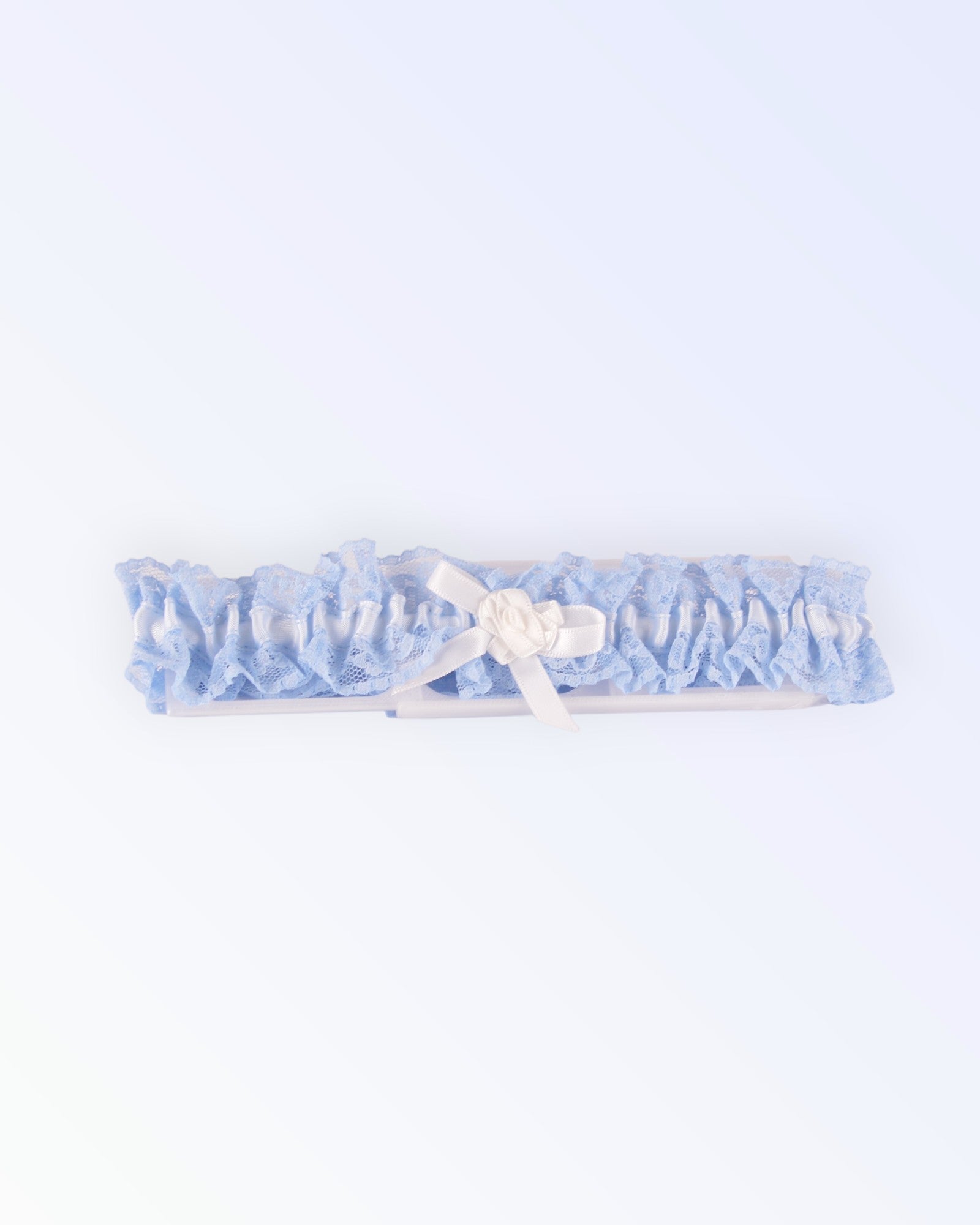 Vaaleansininen pitsinen sukkanauha on koristeltu käsintehdyllä ruusulla ja valkoisesta satiininauhasta valmistetulla rusetilla.