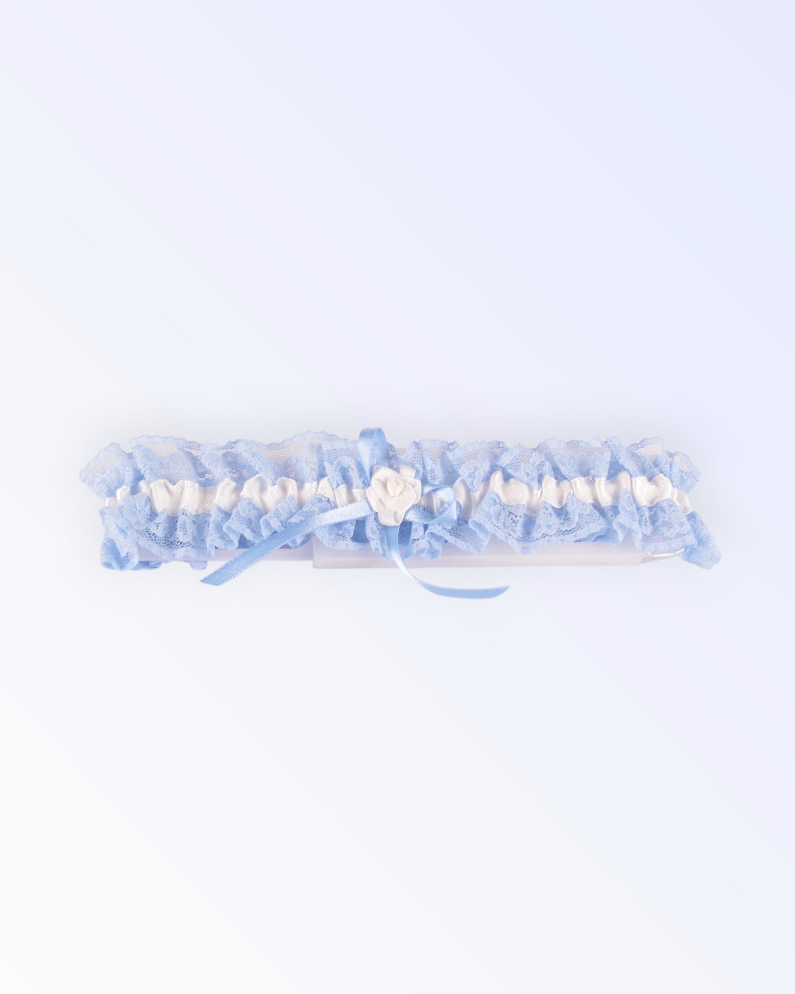 Vaaleansininen pitsinen sukkanauha on koristeltu valkoisesta satiininauhasta tehdyllä käsintehdyllä ruusulla ja vaaleansinisellä nauhalla.