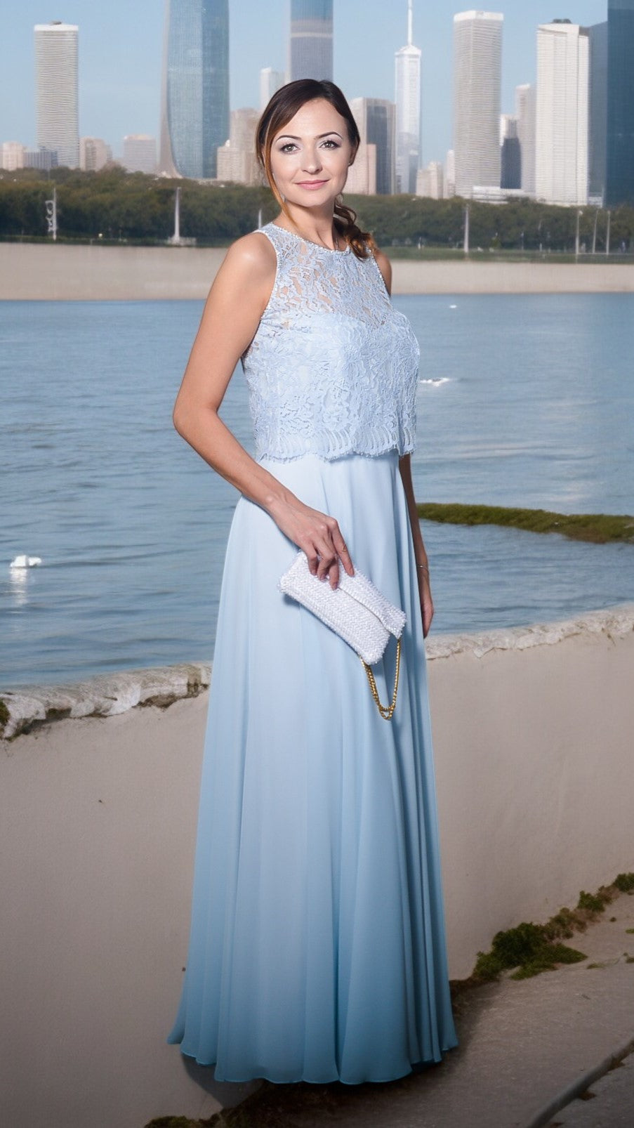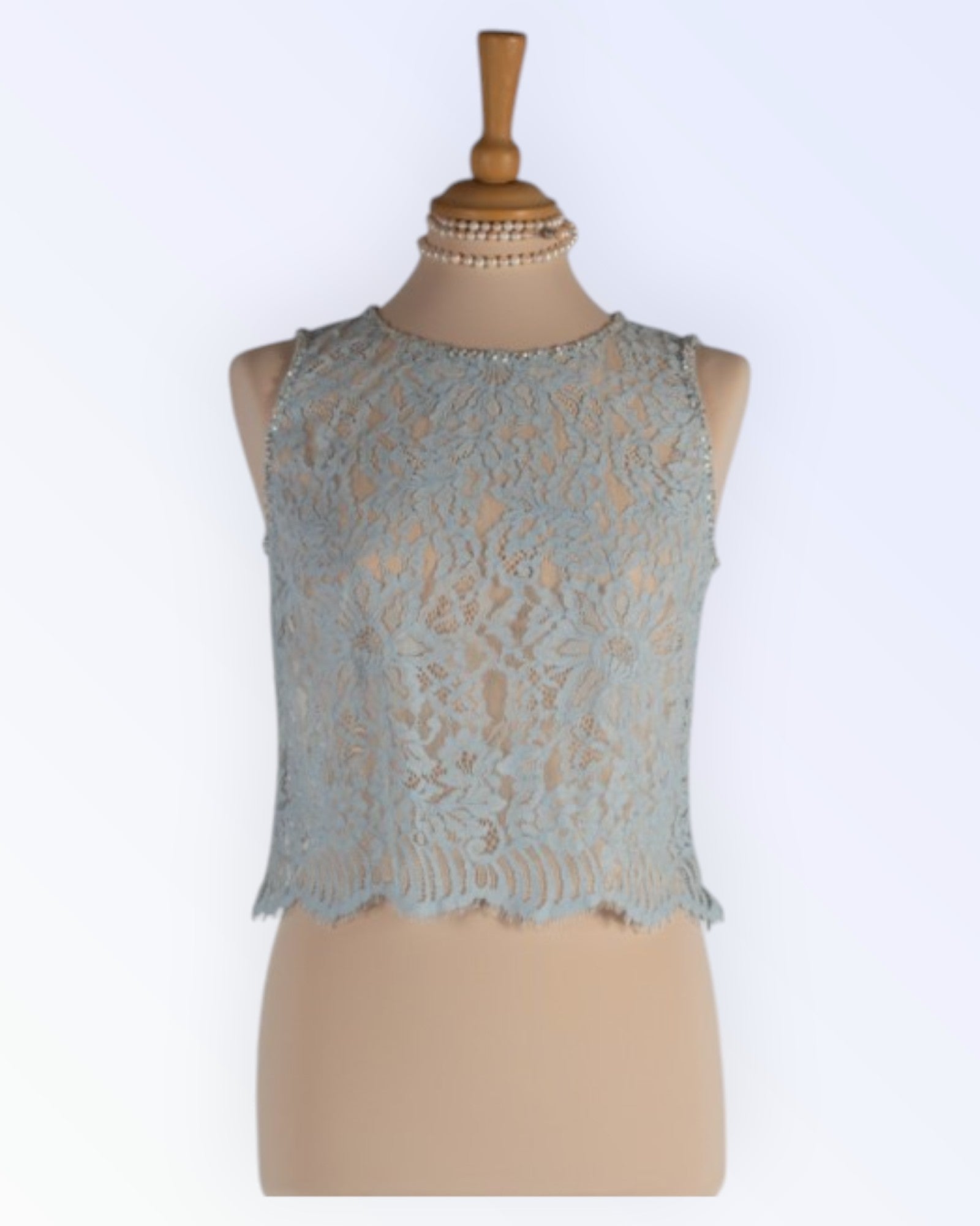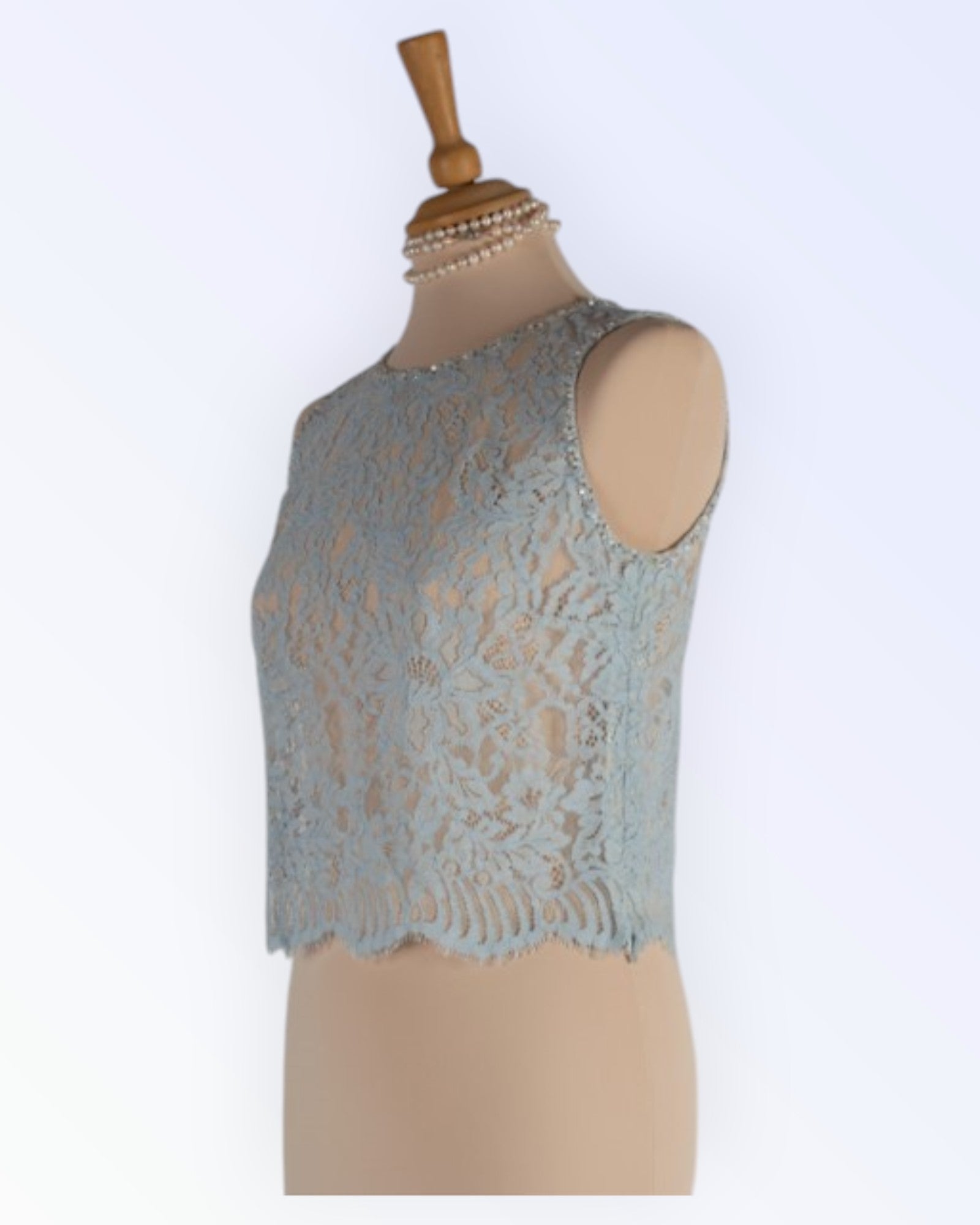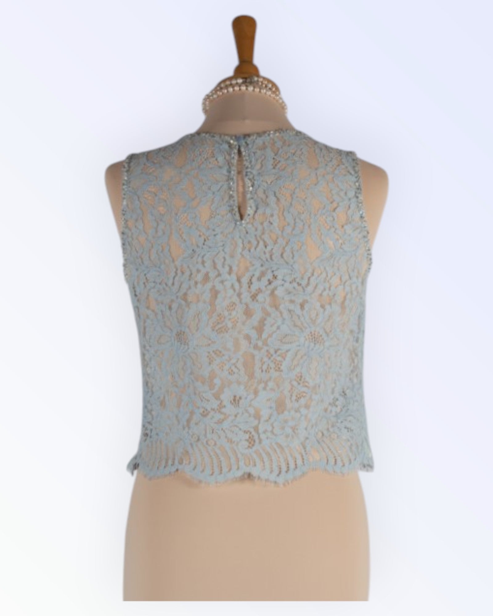 Vaaleansininen pitsitoppi, jonka reunoissa on hopeanvärisiä ja läpinäkyviä lasihelmiä.