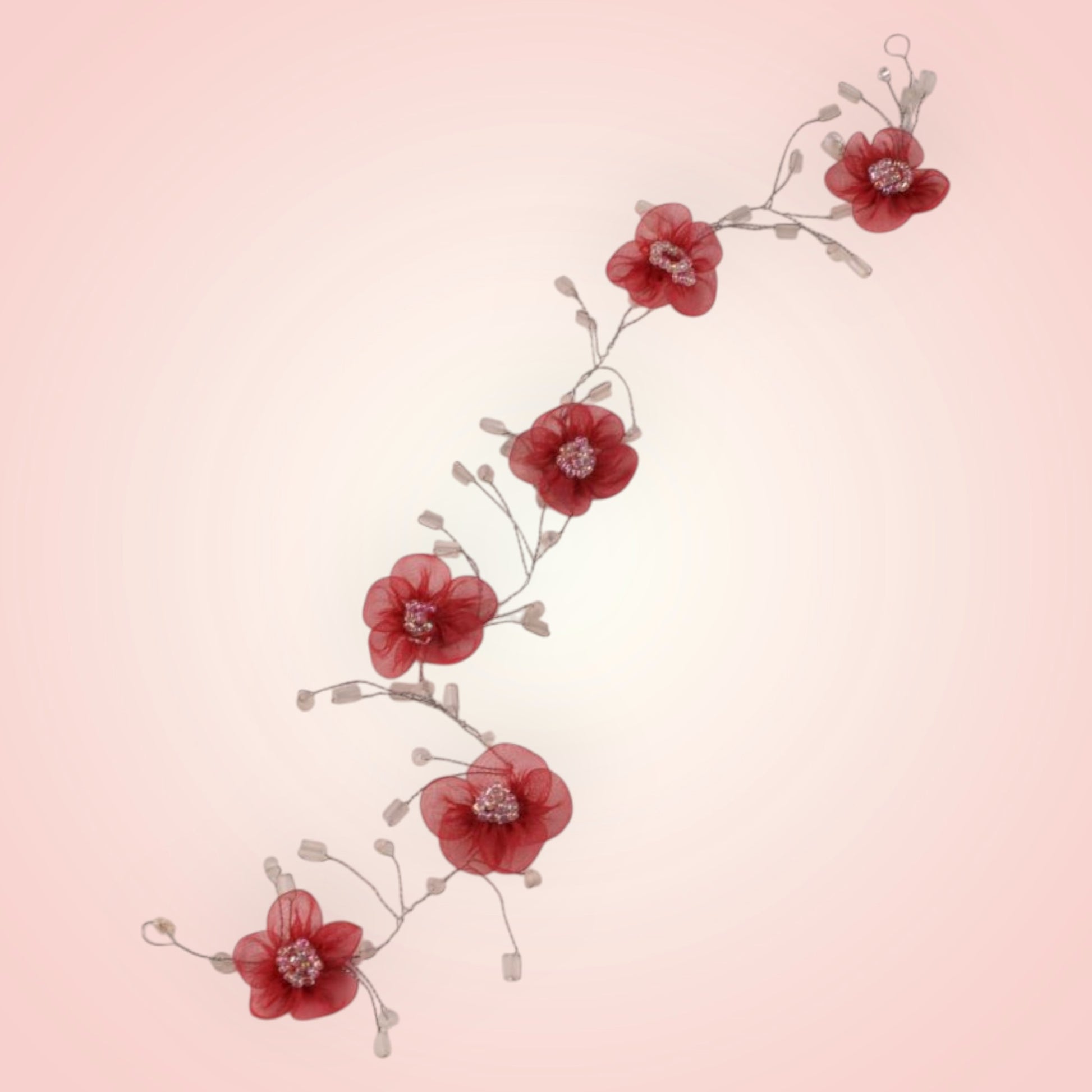Punnottava hiuskoriste, tehty tummanpunaisista organzakukista ja akryylihelmistä.