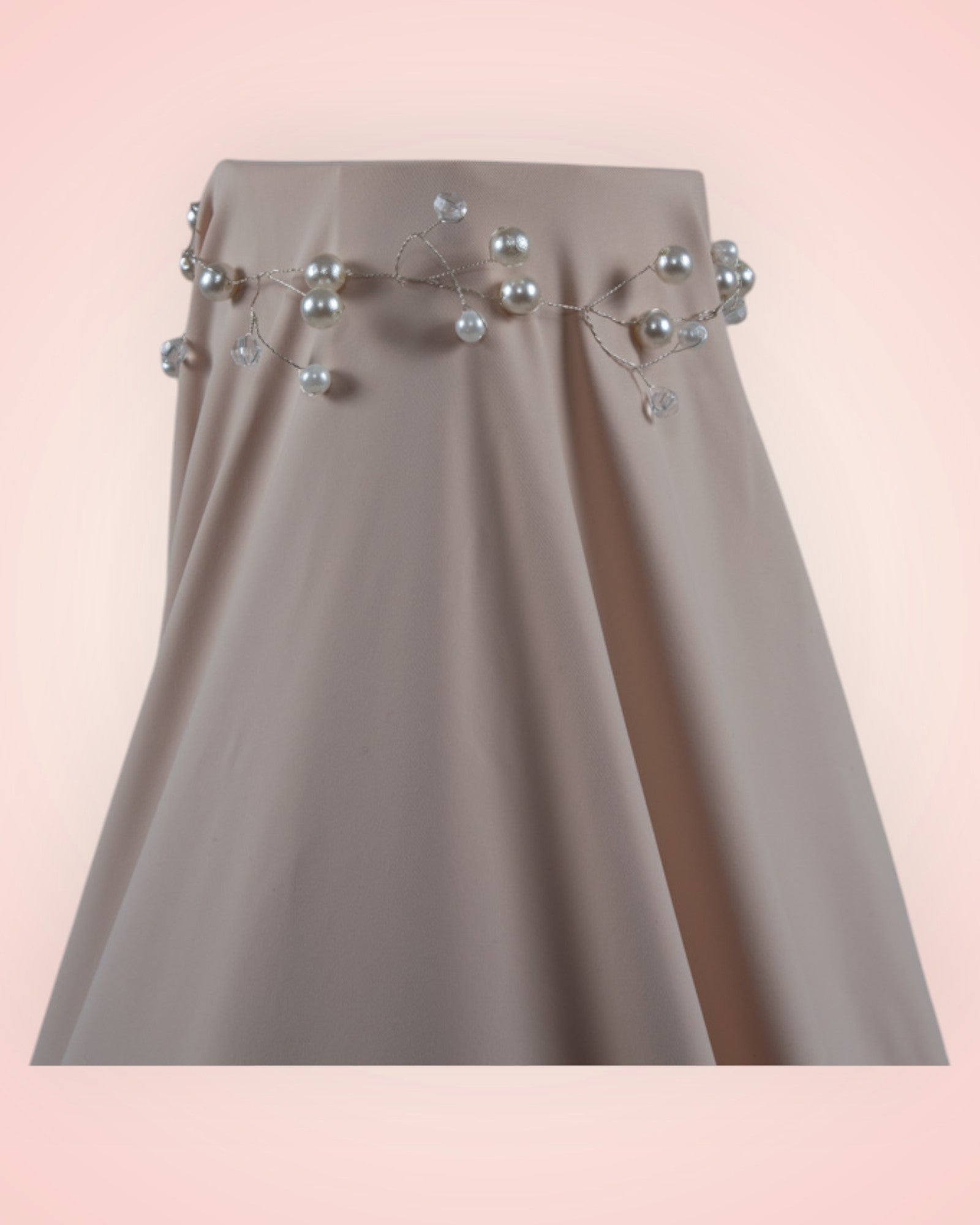 Punottu hiusasuste, jossa luonnonvalkoisia helmiä ja kristalleja. Pituus 30 cm.