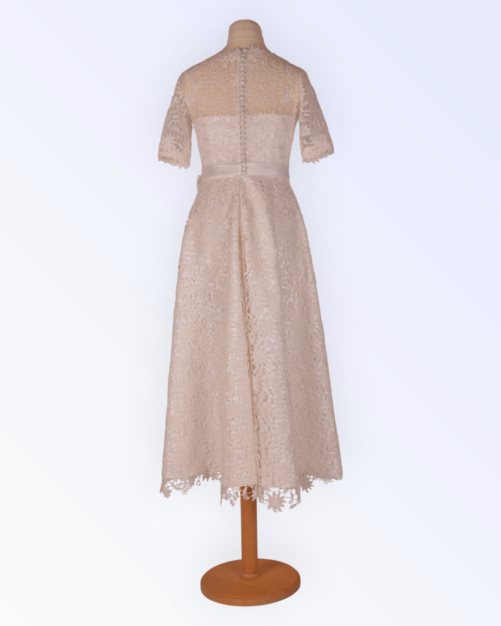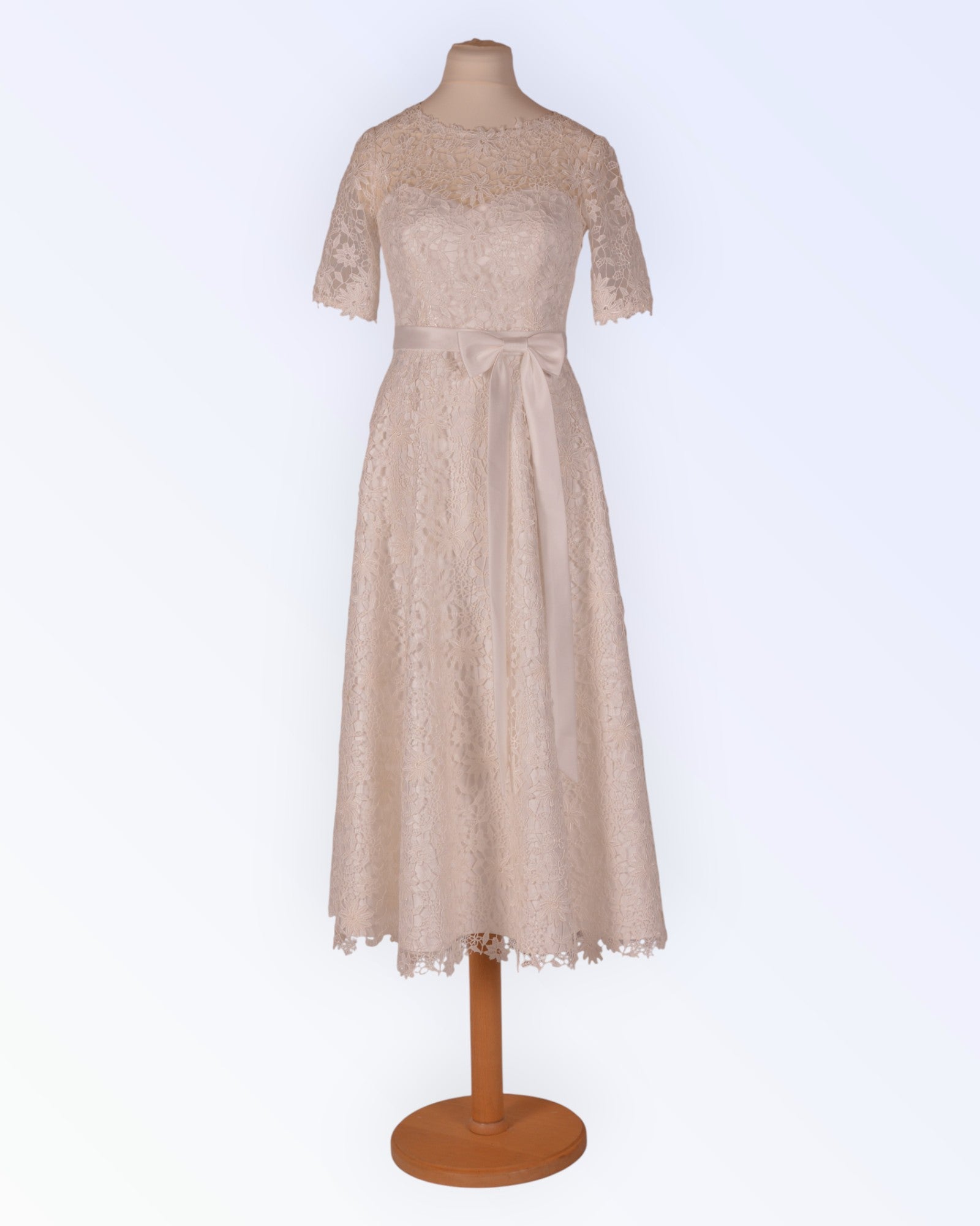 Luonnonvalkoinen pitsihääpuku, jossa leveä helma ja koristeellinen nauha.