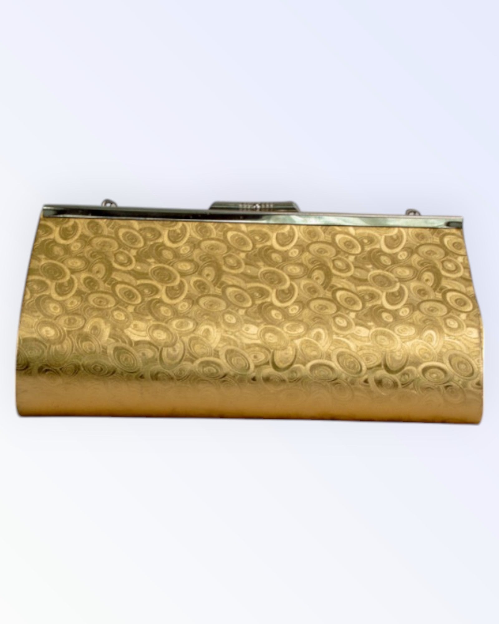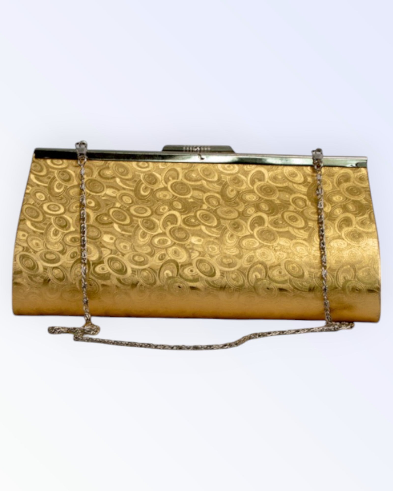 Juhlallinen laukku, joka on valmistettu kultaisesta materiaalista.