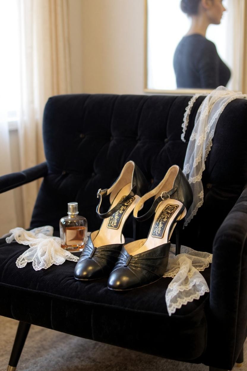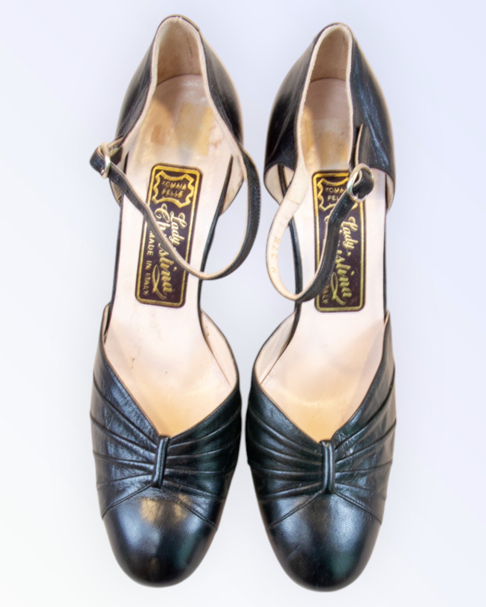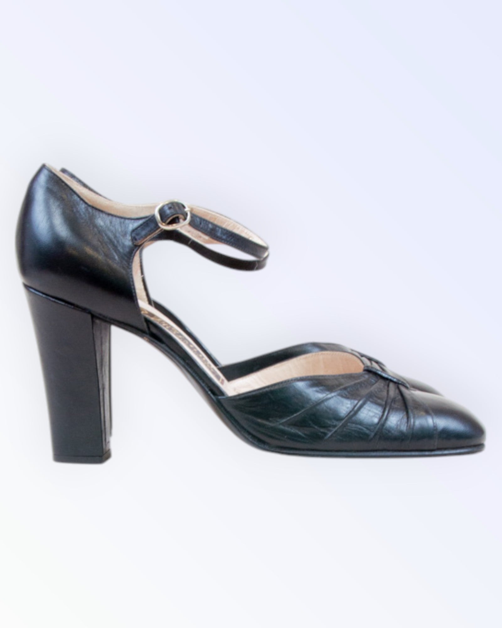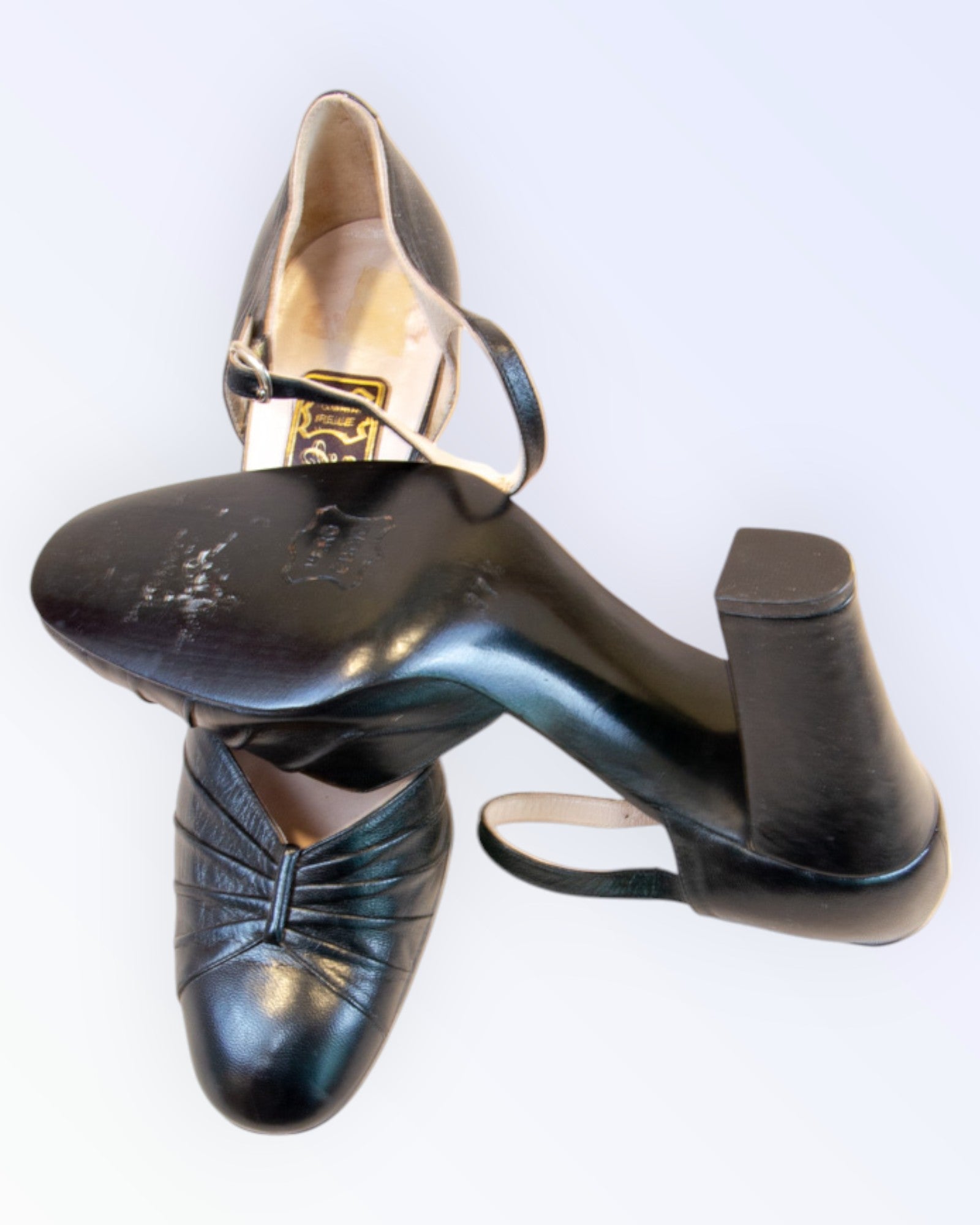 Vintage-tyyliset mustasta nahasta valmistetut kengät. Pyöreä kärki ja keskikorkea korko mukavuutta varten.