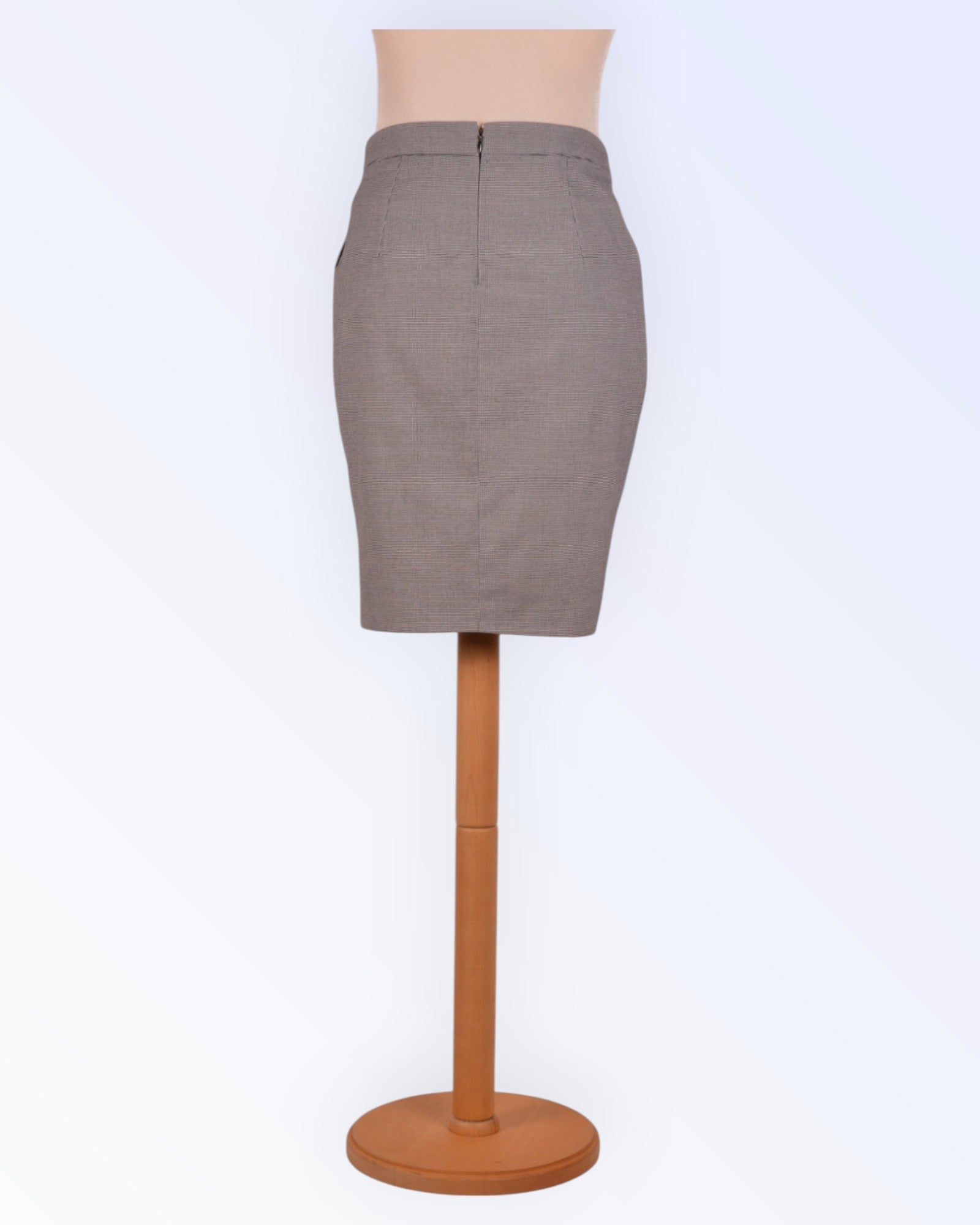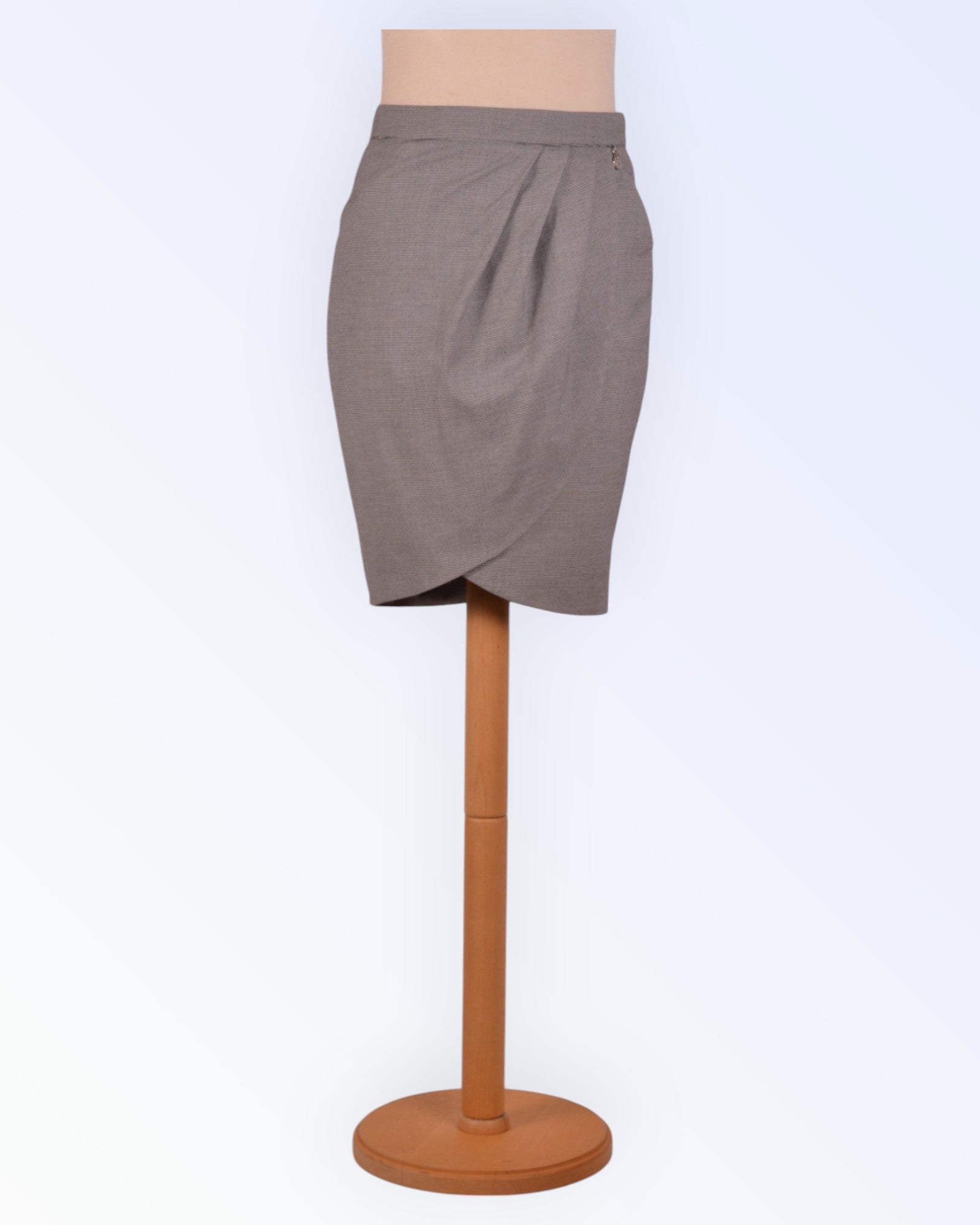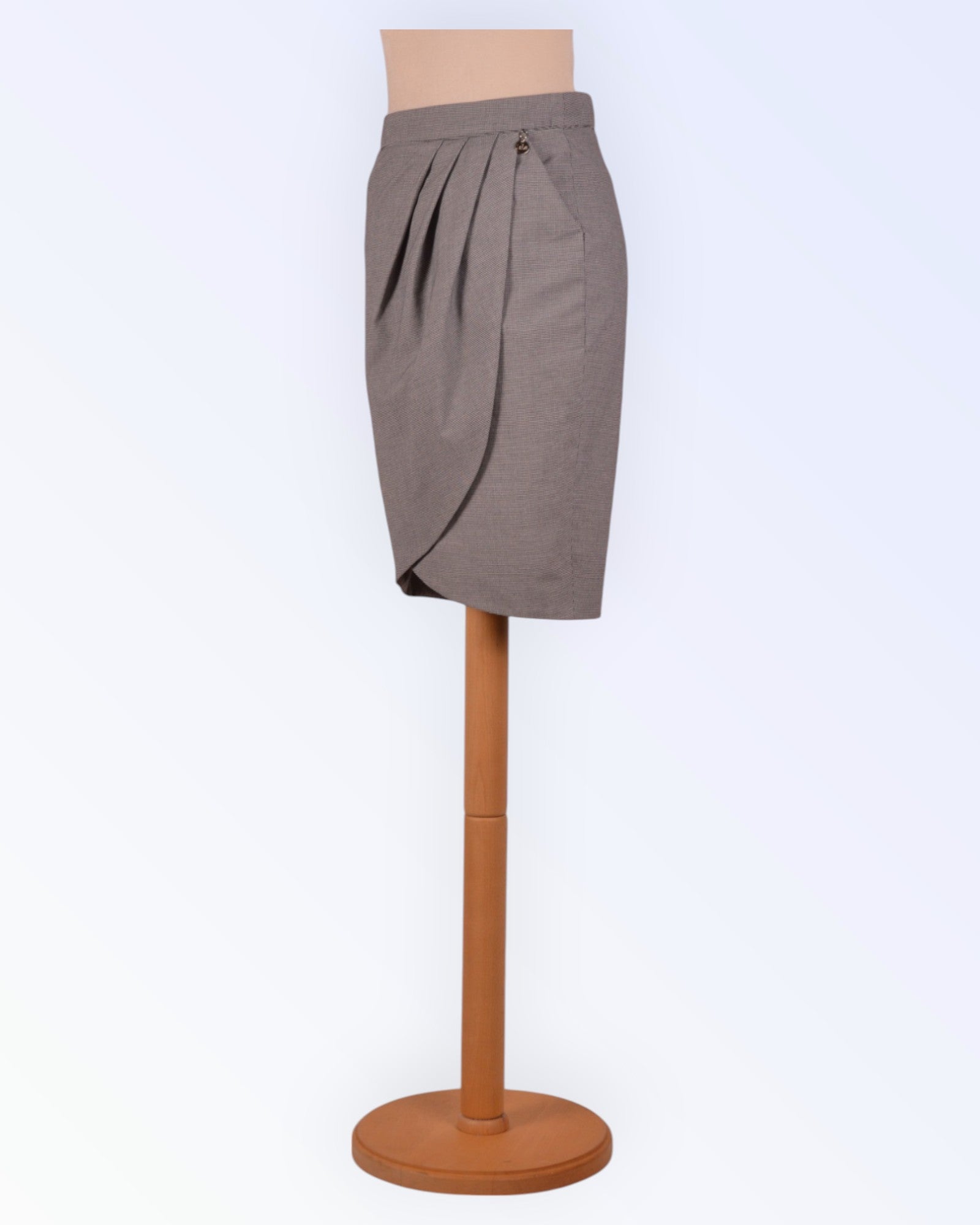 Tyylikäs hame, jossa on tulppaanikuvio ja epäsymmetrinen muotoilu.