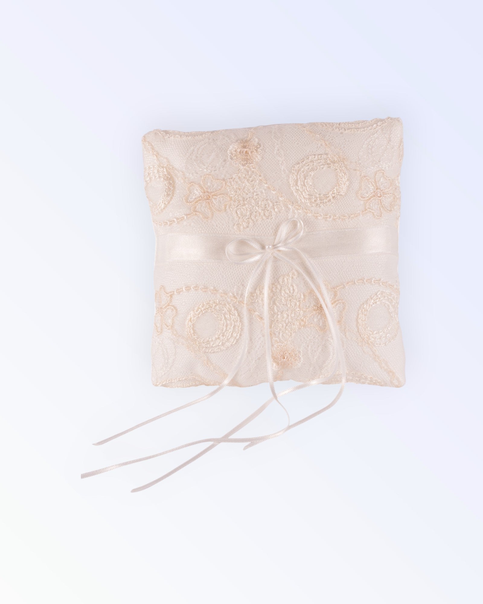 Luonnonvalkoinen sormustyyny, jonka yläpuoli on päällystetty eksklusiivisella pitsillä. Koristeltu satiininauhoilla ja pienellä helmellä.