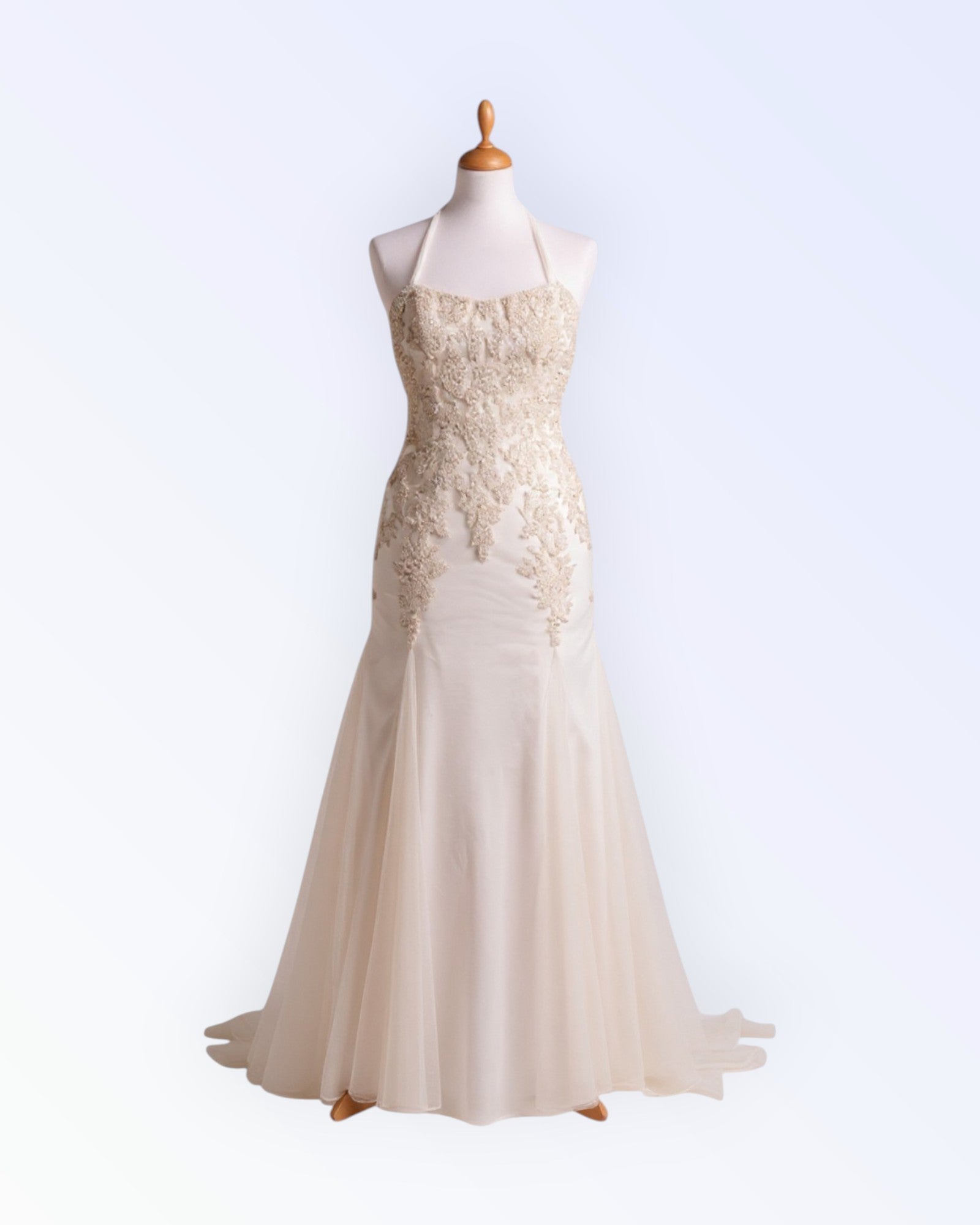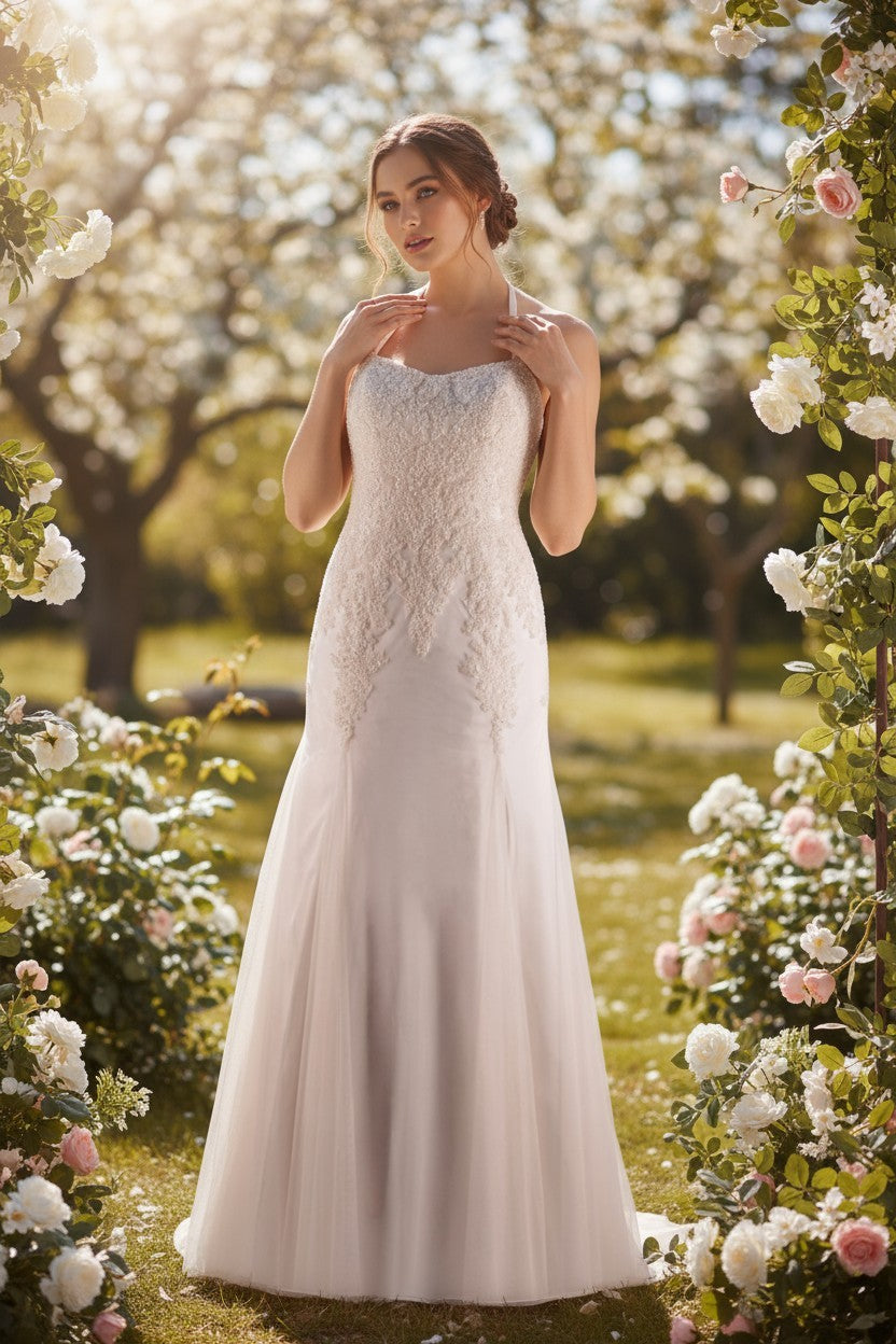Luonnonvalkoinen tyllihääpuku laahuksella. Mekon yläosa on koristeltu pitsiapplikaatioilla ja helmikirjonnalla. Selästä avoimessa mekossa on olkaimet. Vuorillinen tuote.