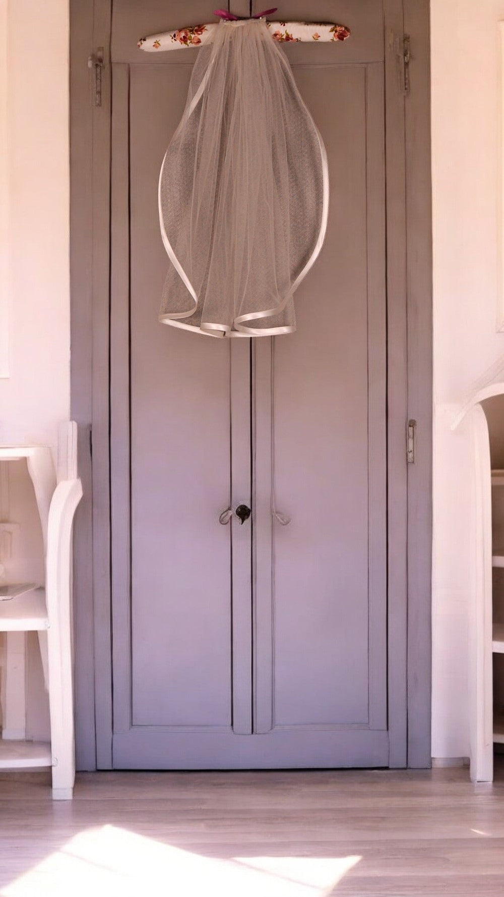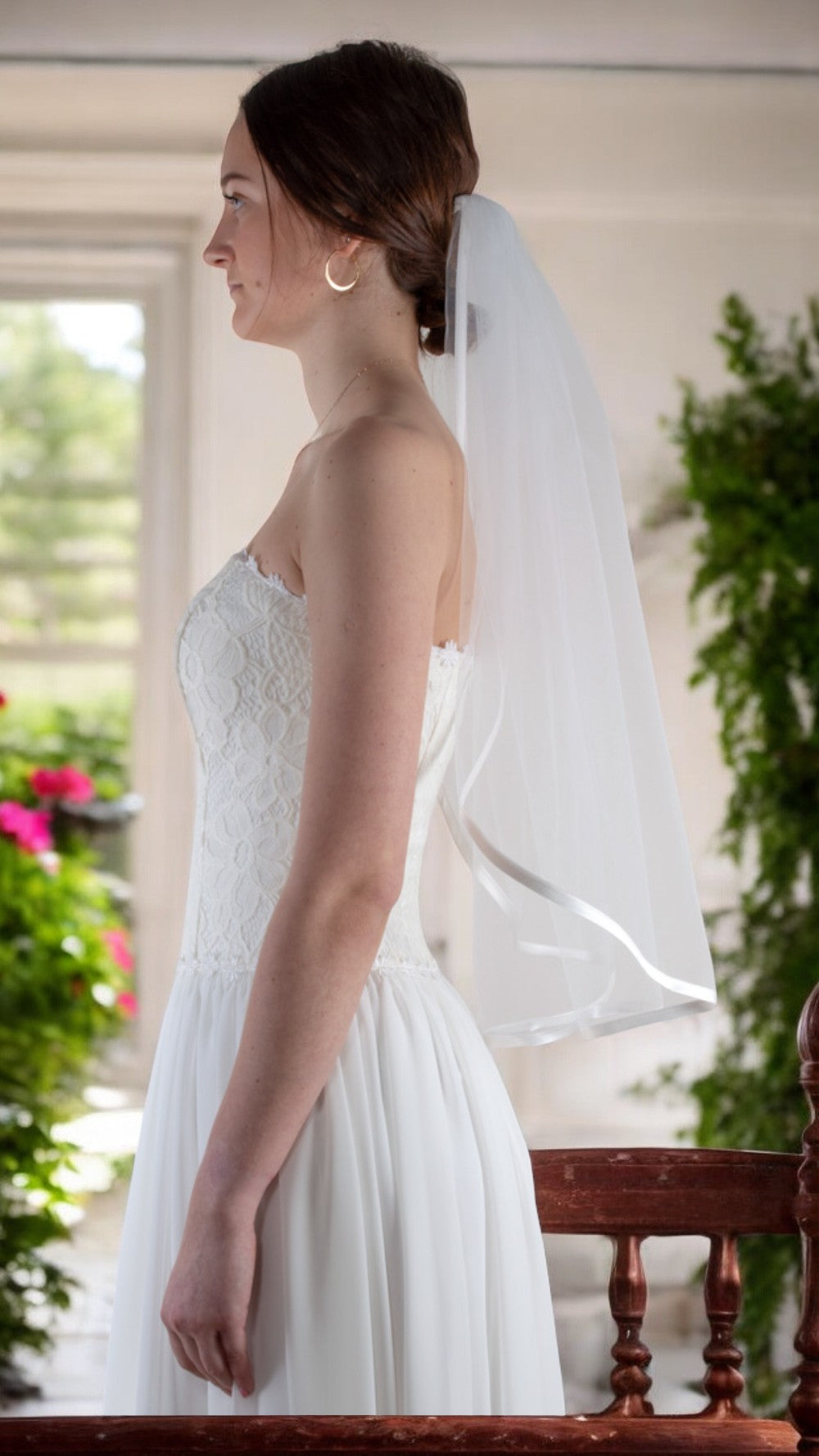 Lyhyt luonnonvalkoinen morsiushuntu satiinireunuksella.